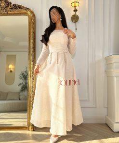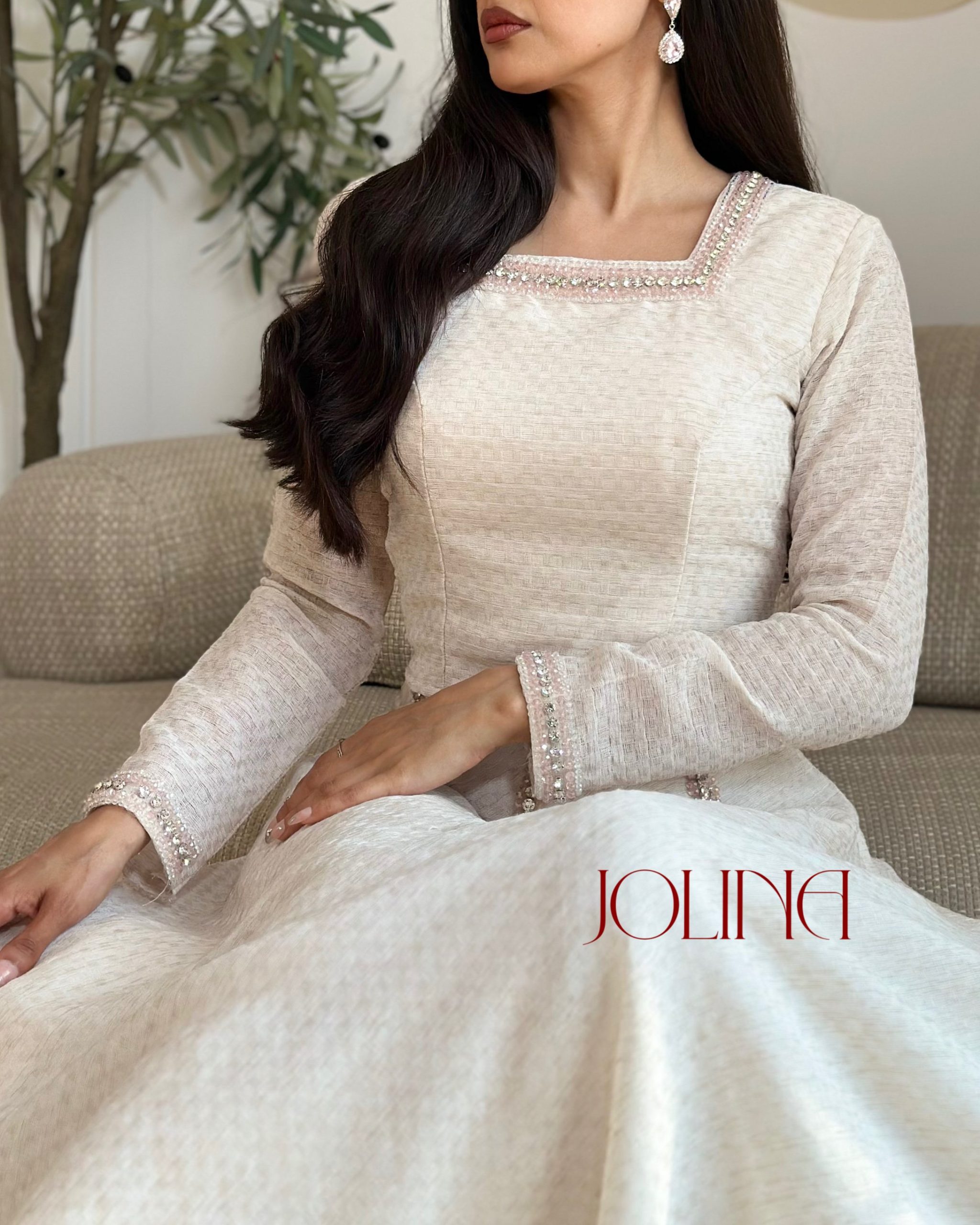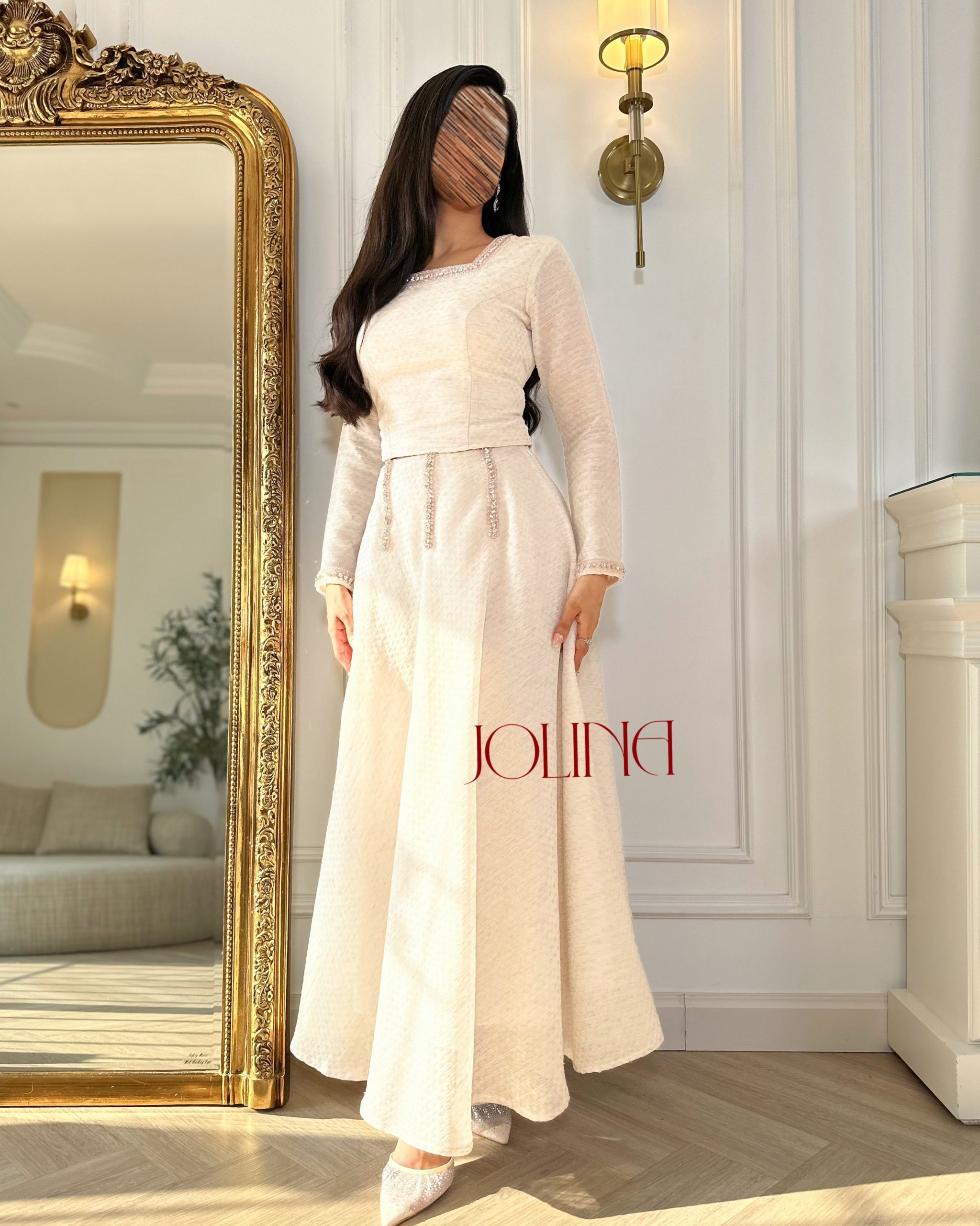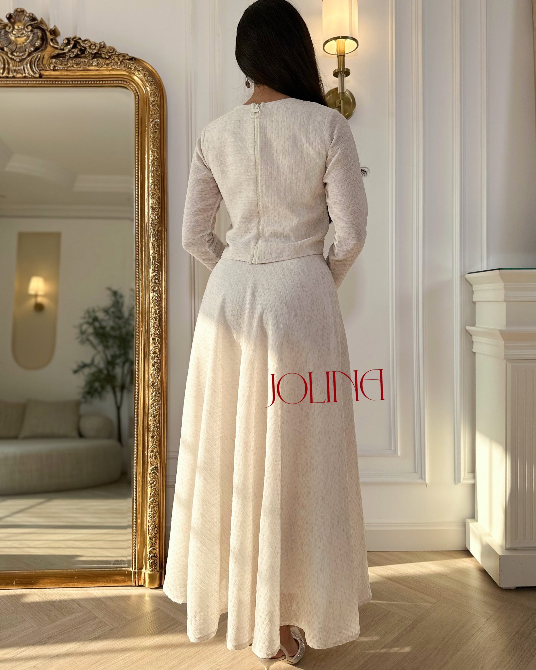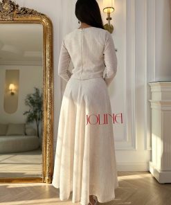 جولينا – طقم بيج أنيق بتصميم ناعم وتنورة بليسيه
