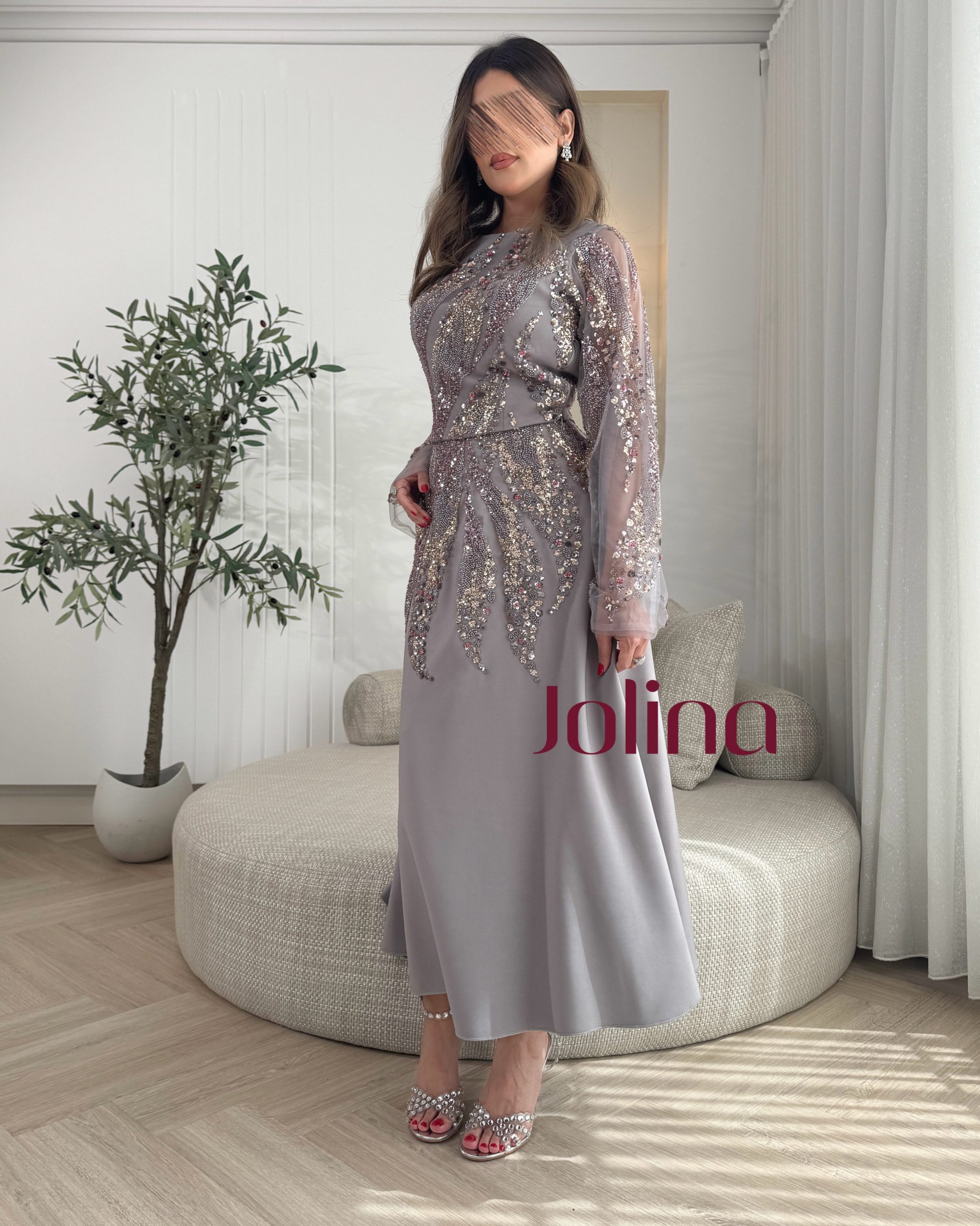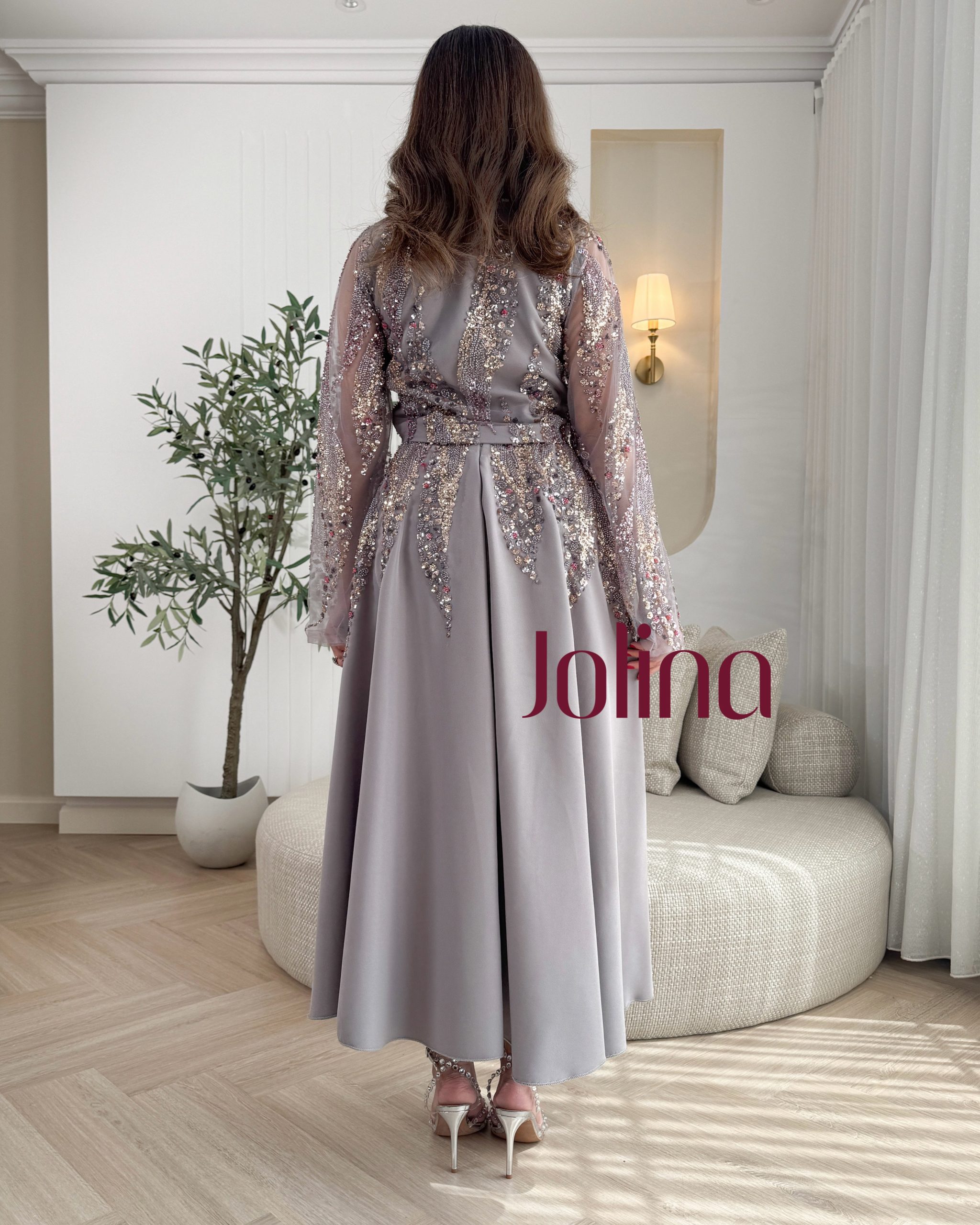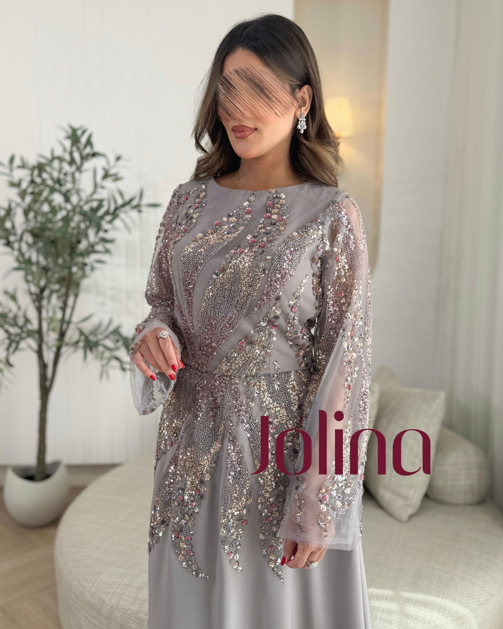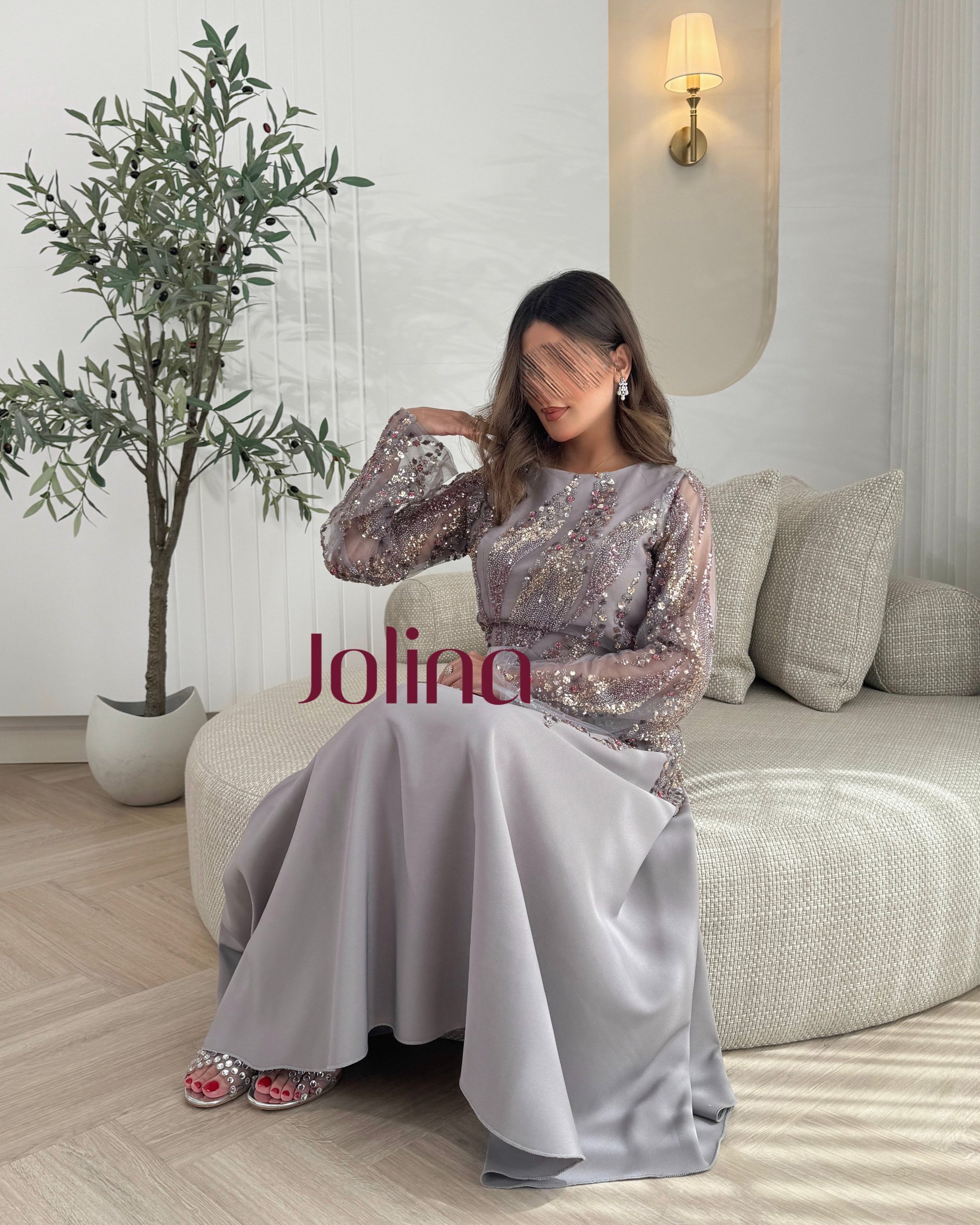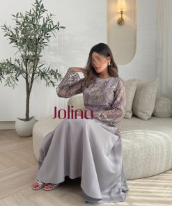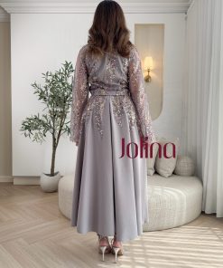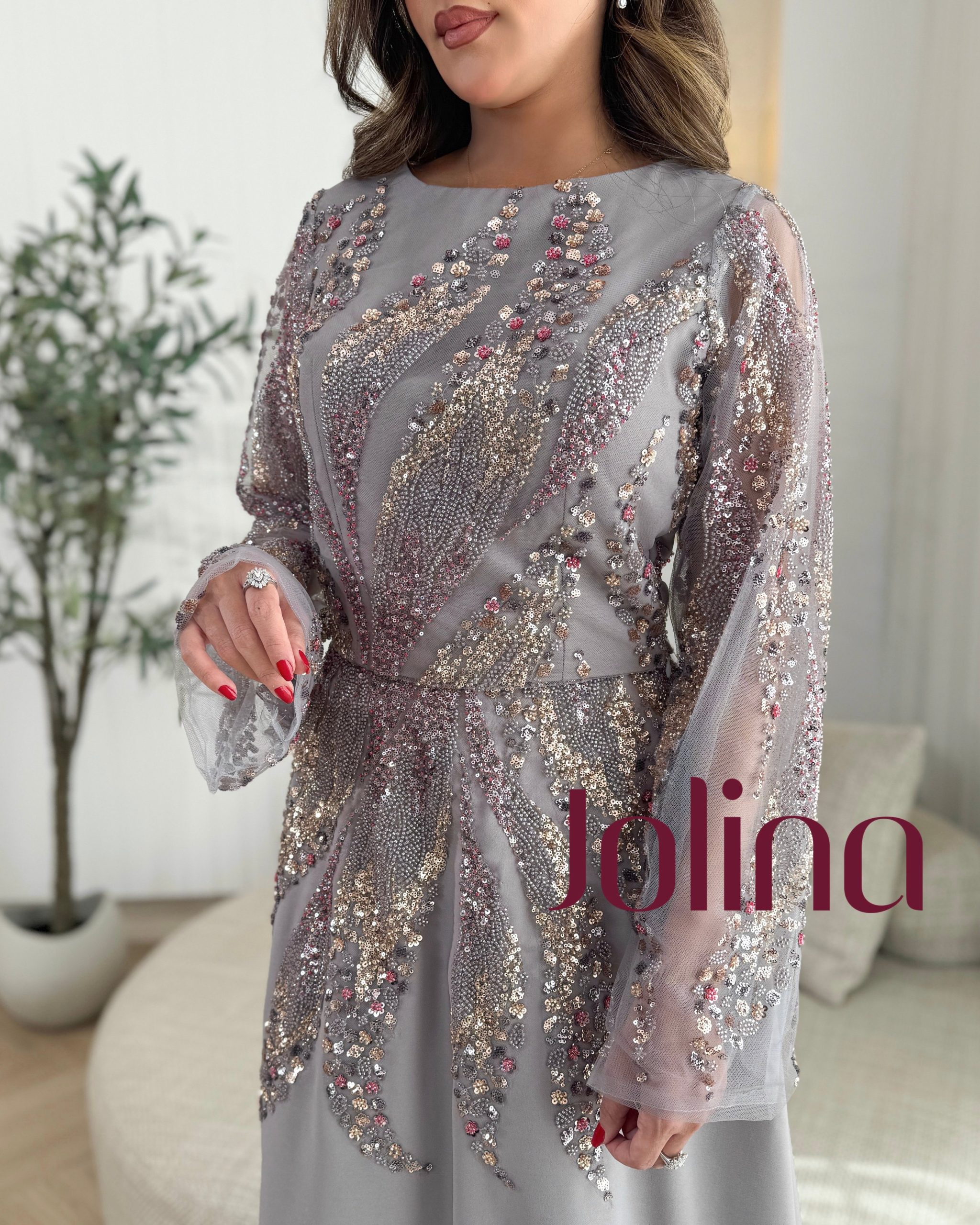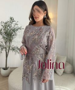 جولينا – طقم سهرة رمادي بتطريز لامع وأكمام شفافة أنيقة