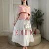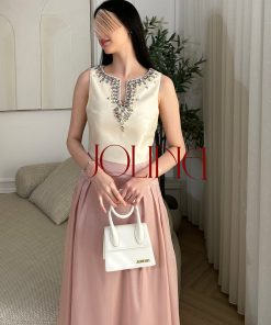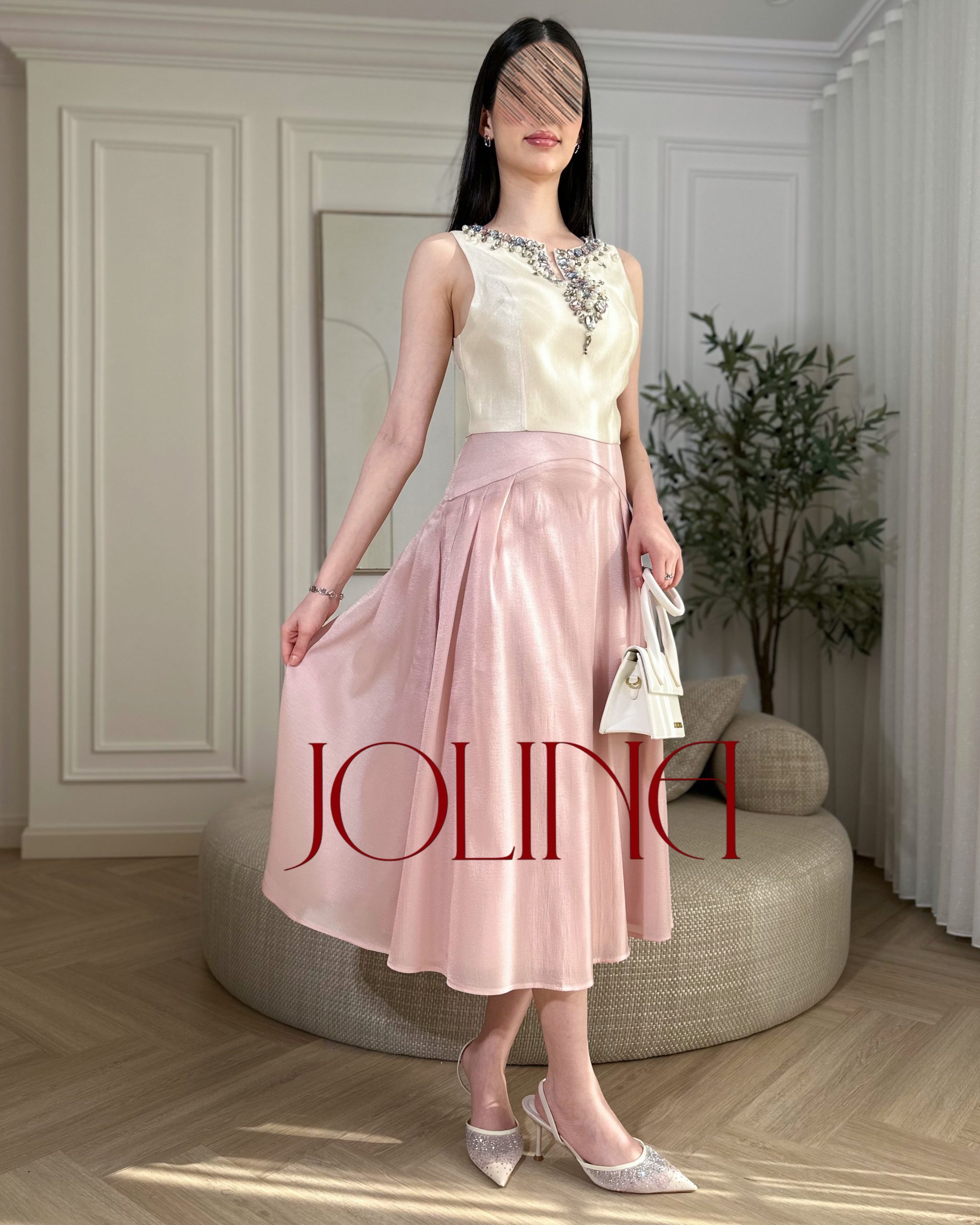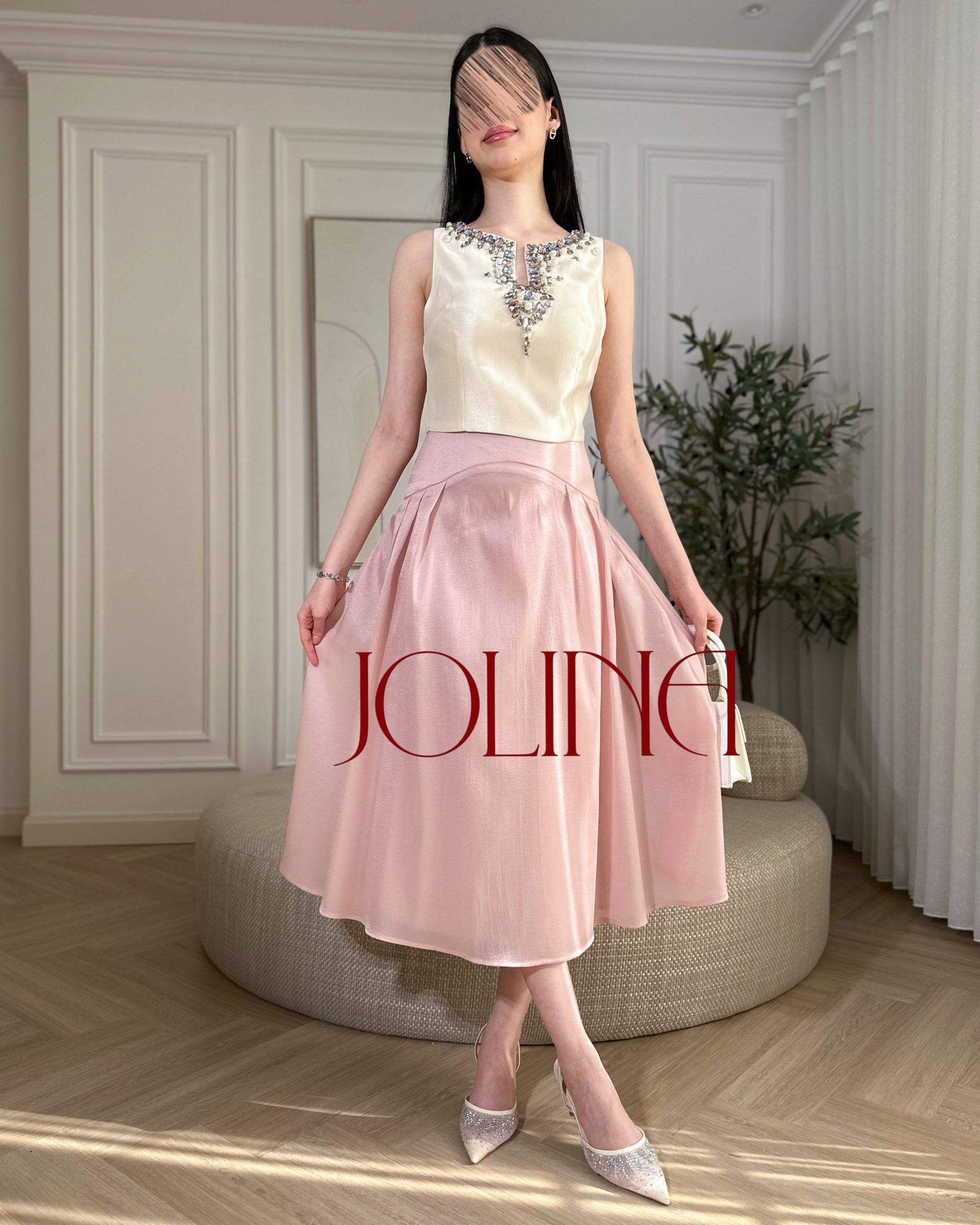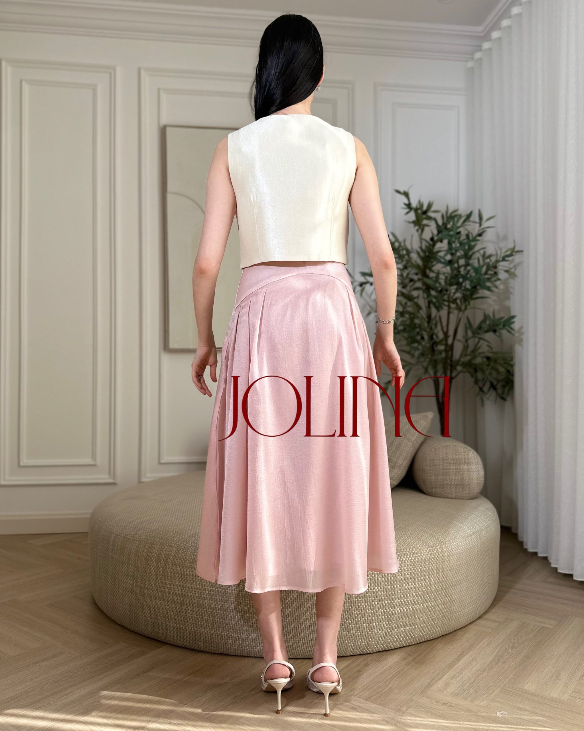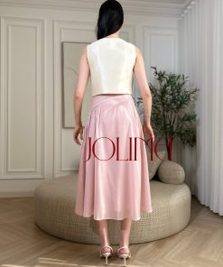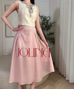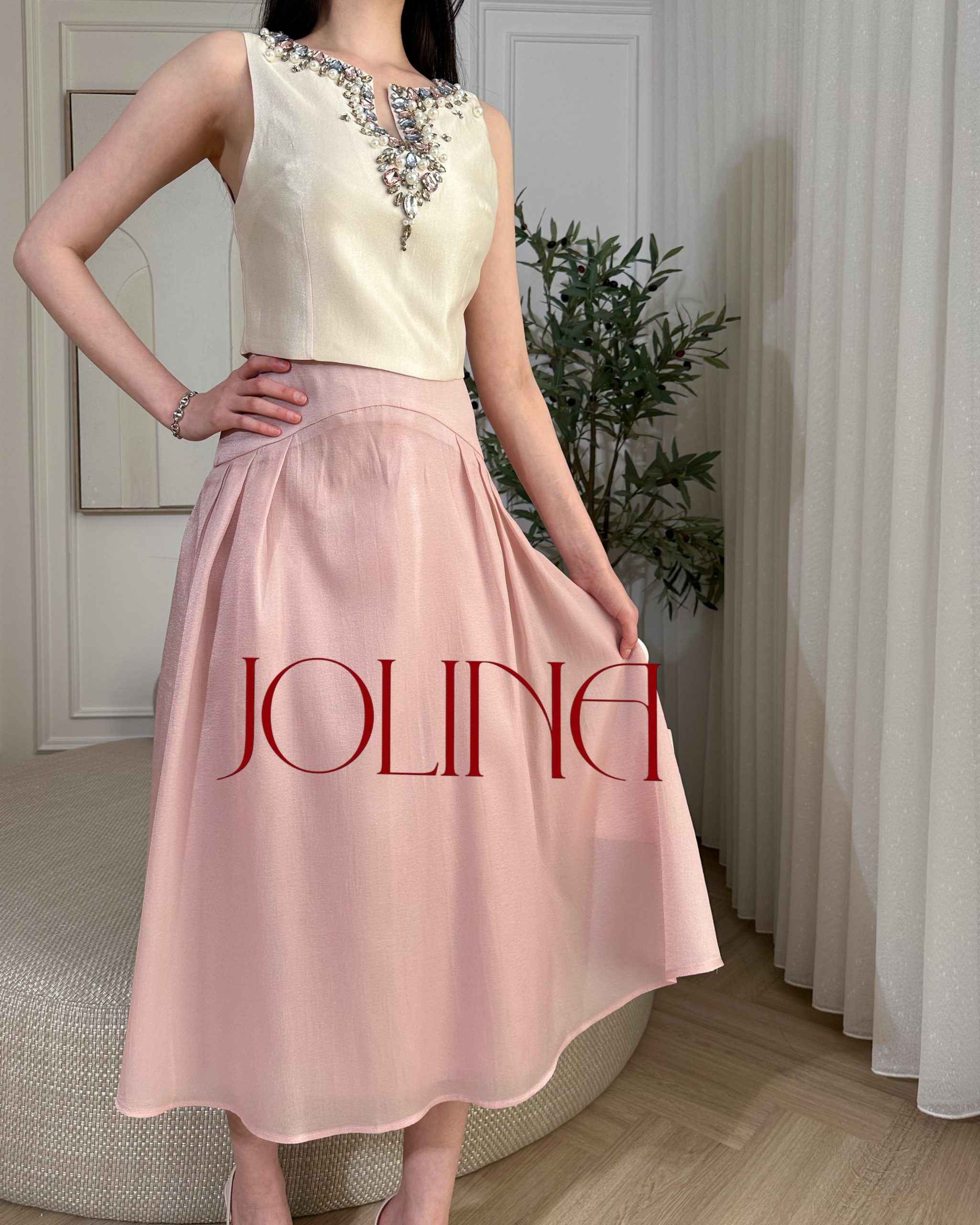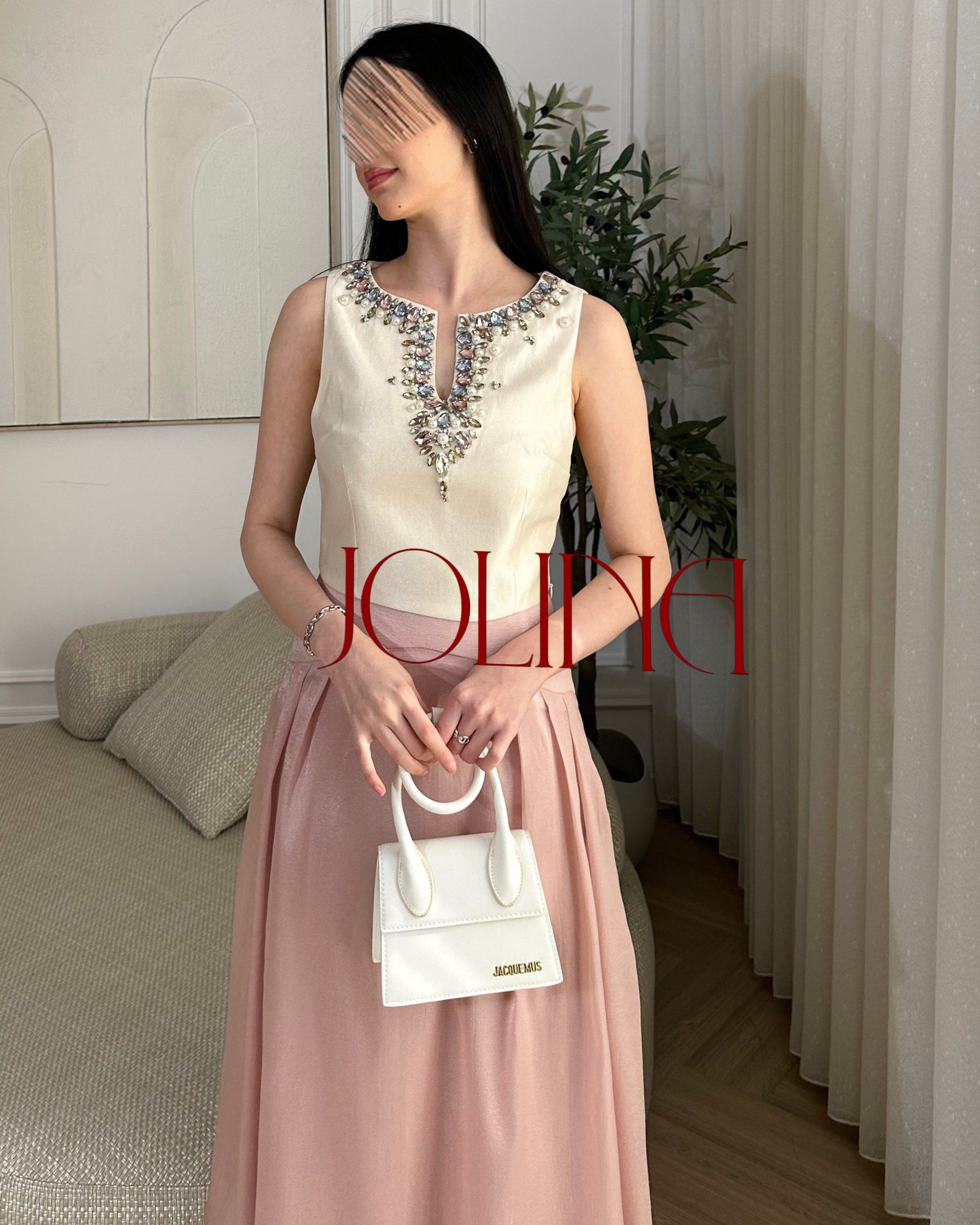 جولينا – طقم بيج أنيق بتصميم ناعم وتنورة بليسيه