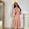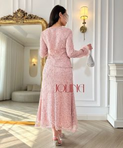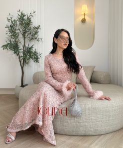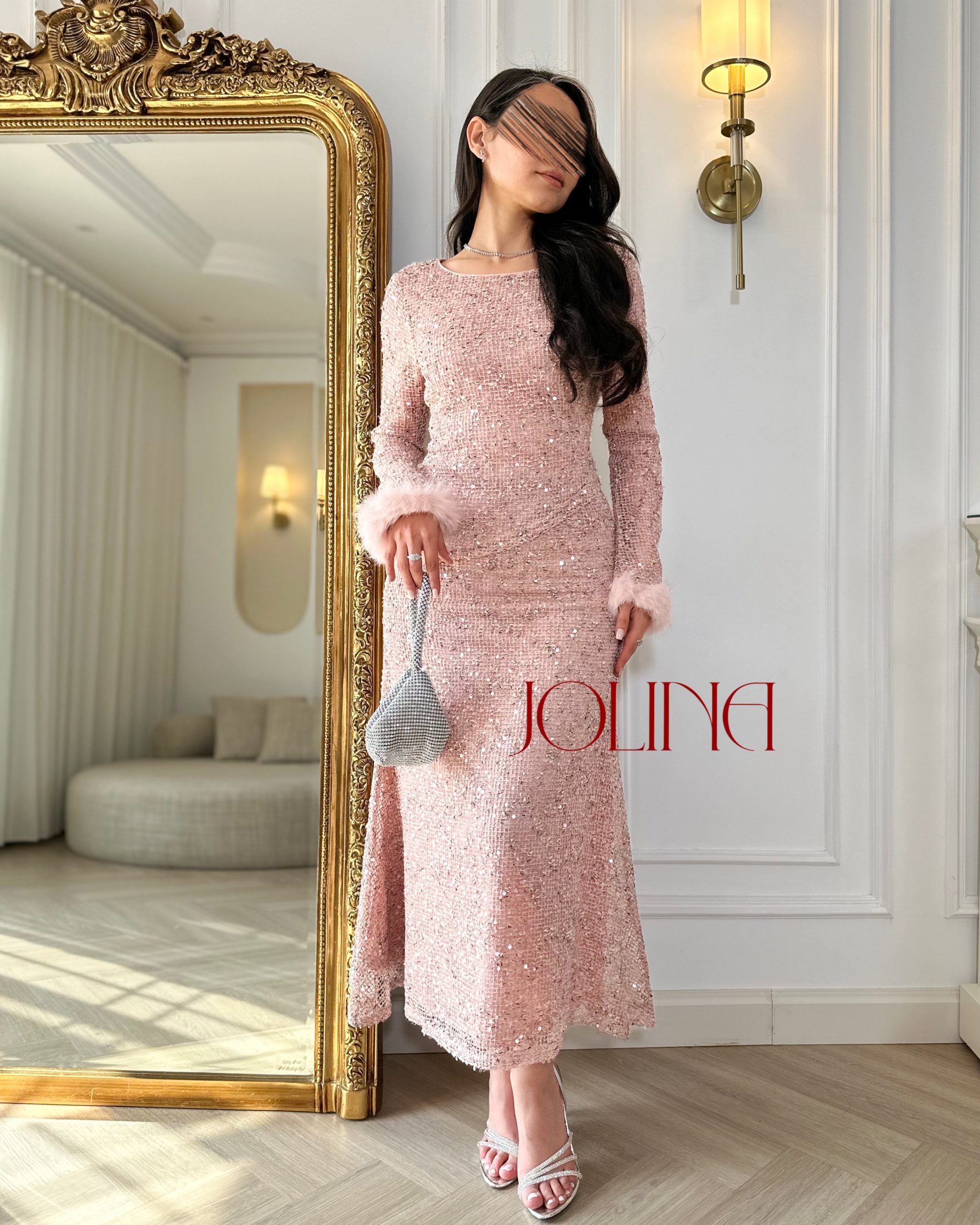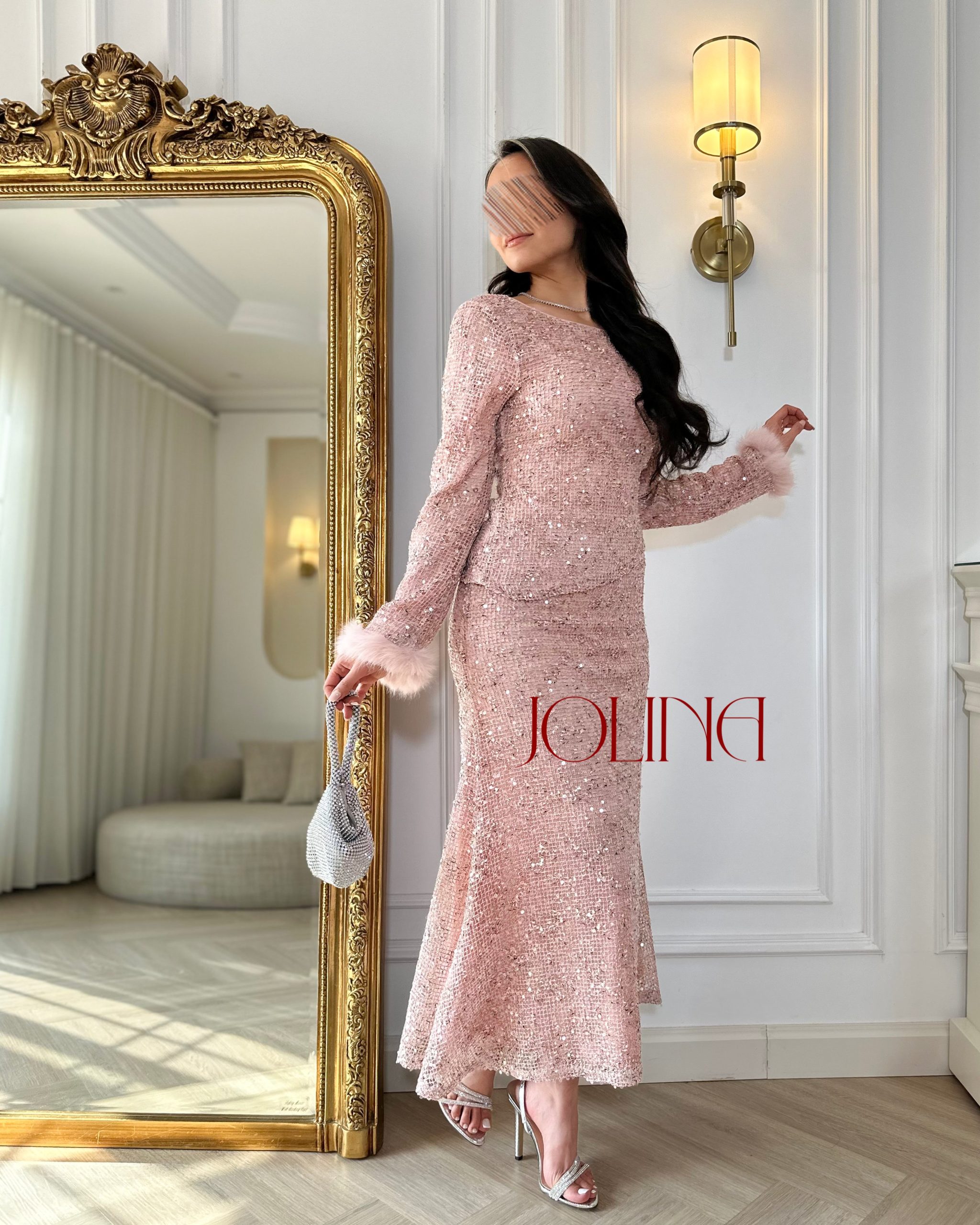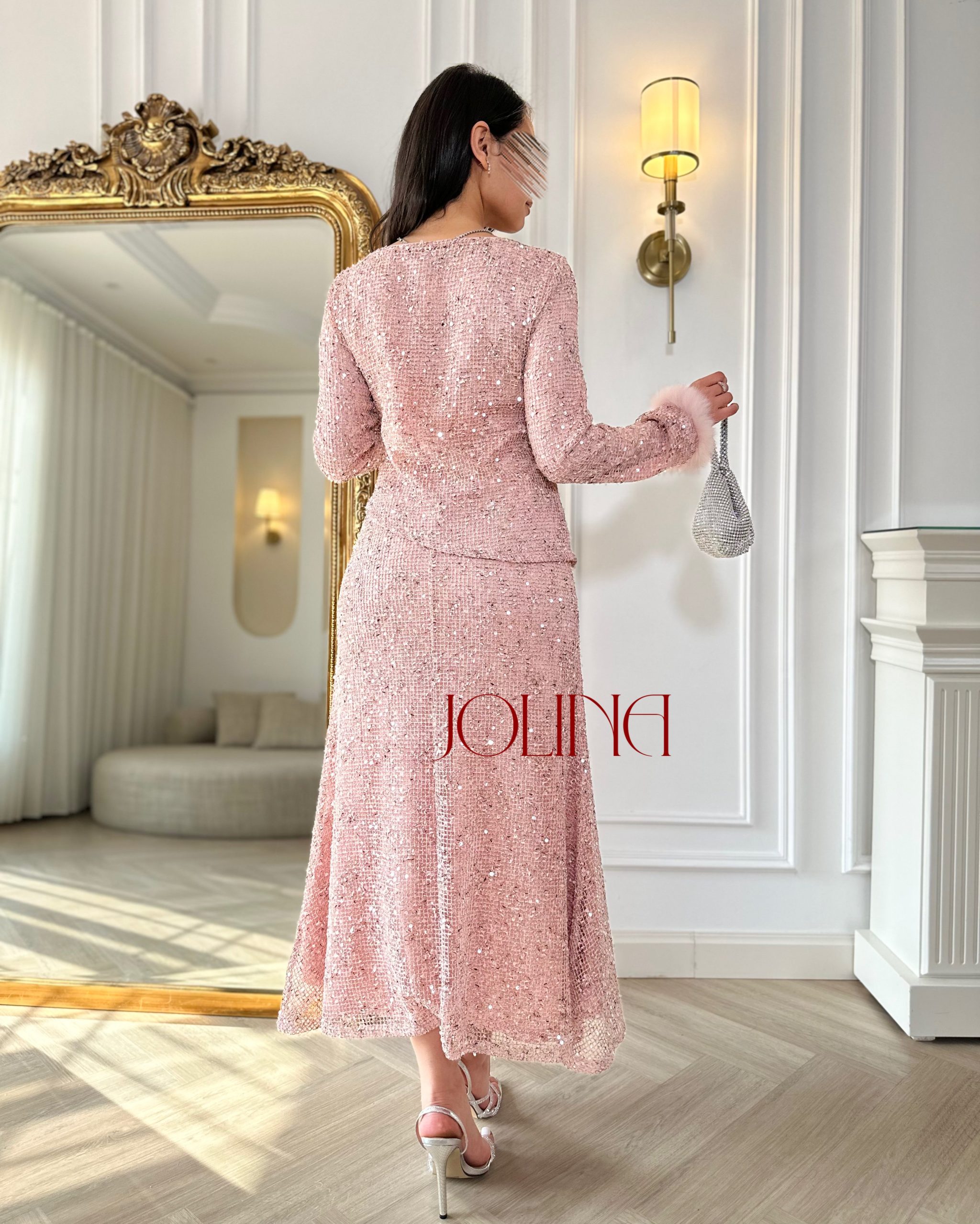 جولينا – طقم وردي لامع بأكمام طويلة وحواف فرو