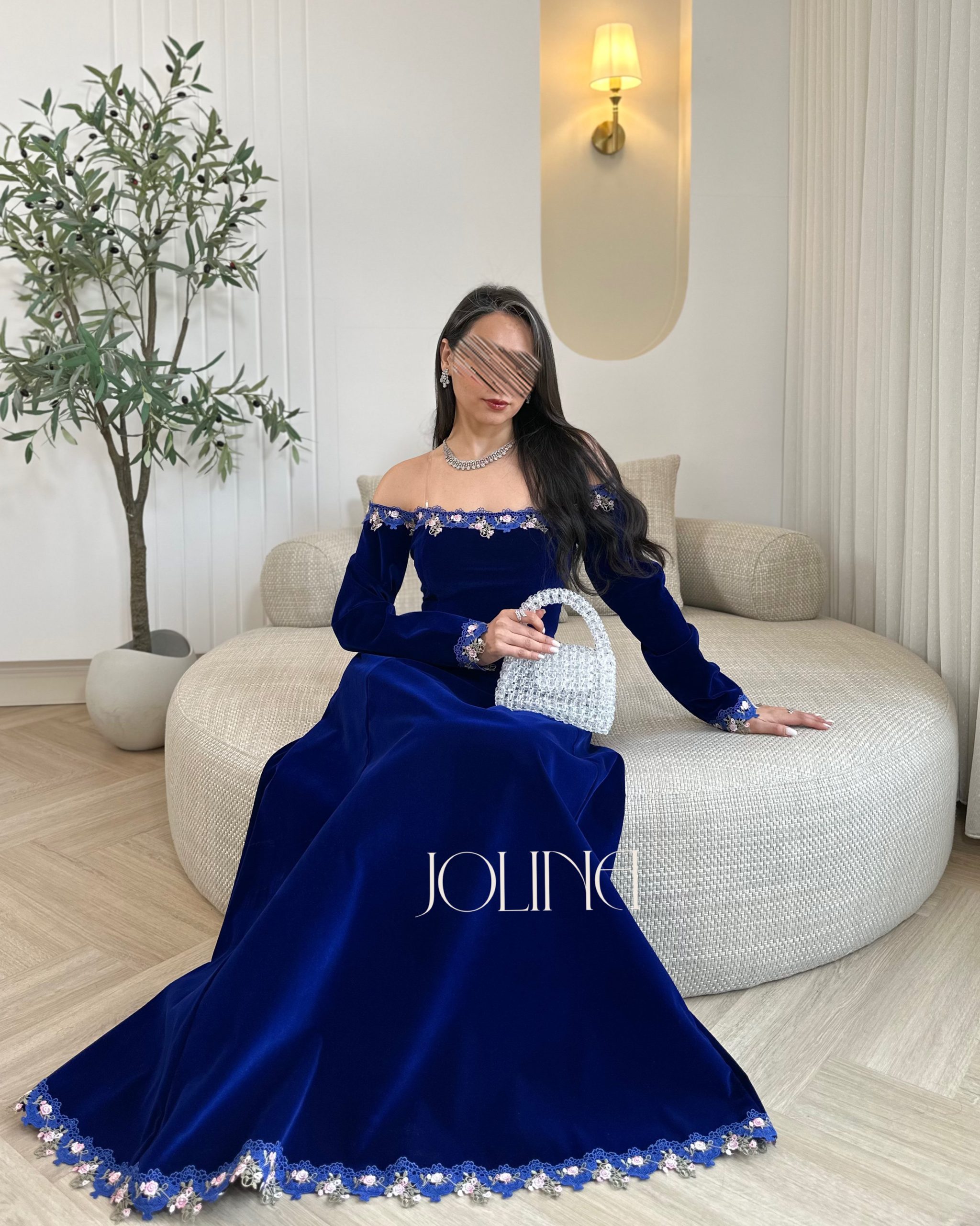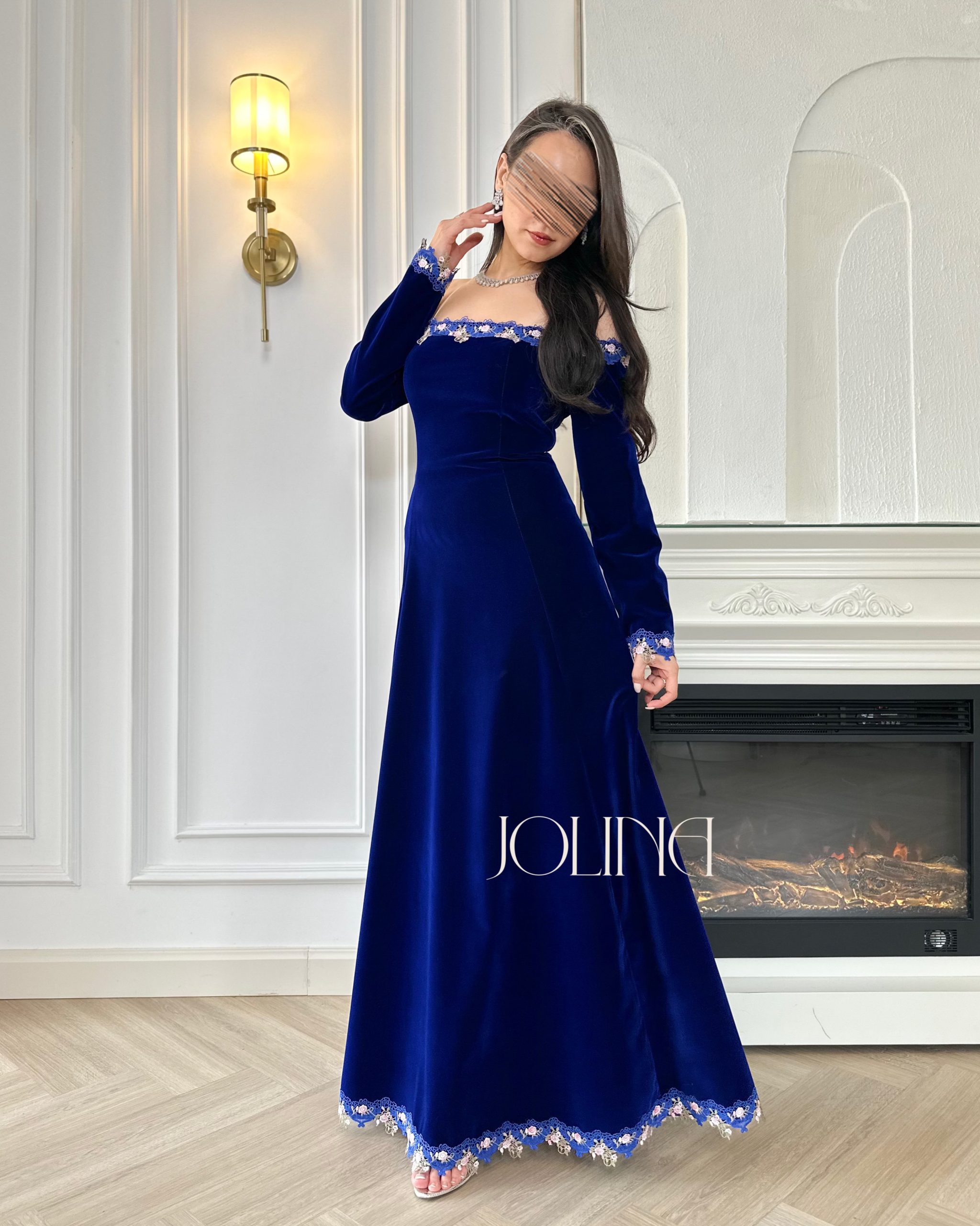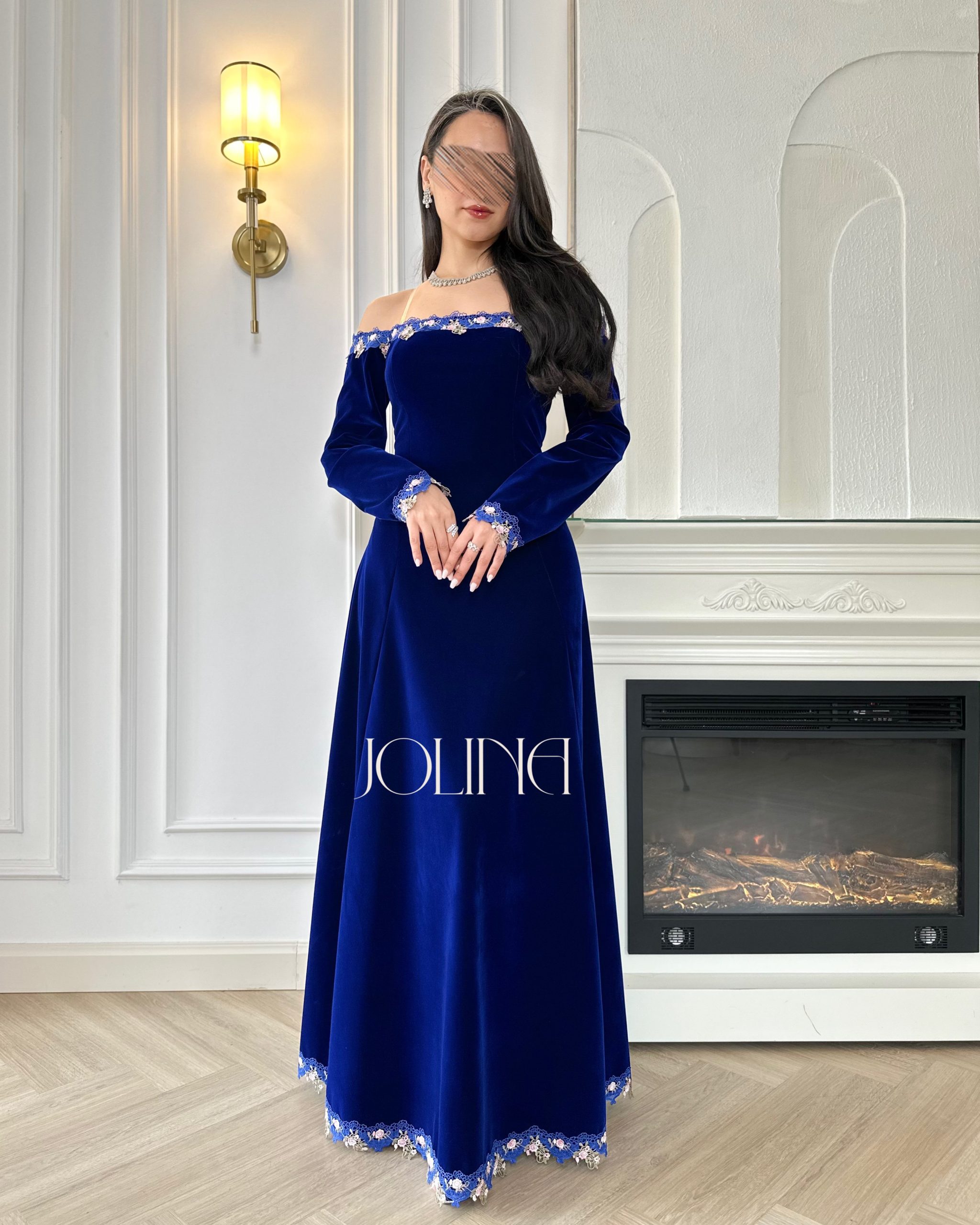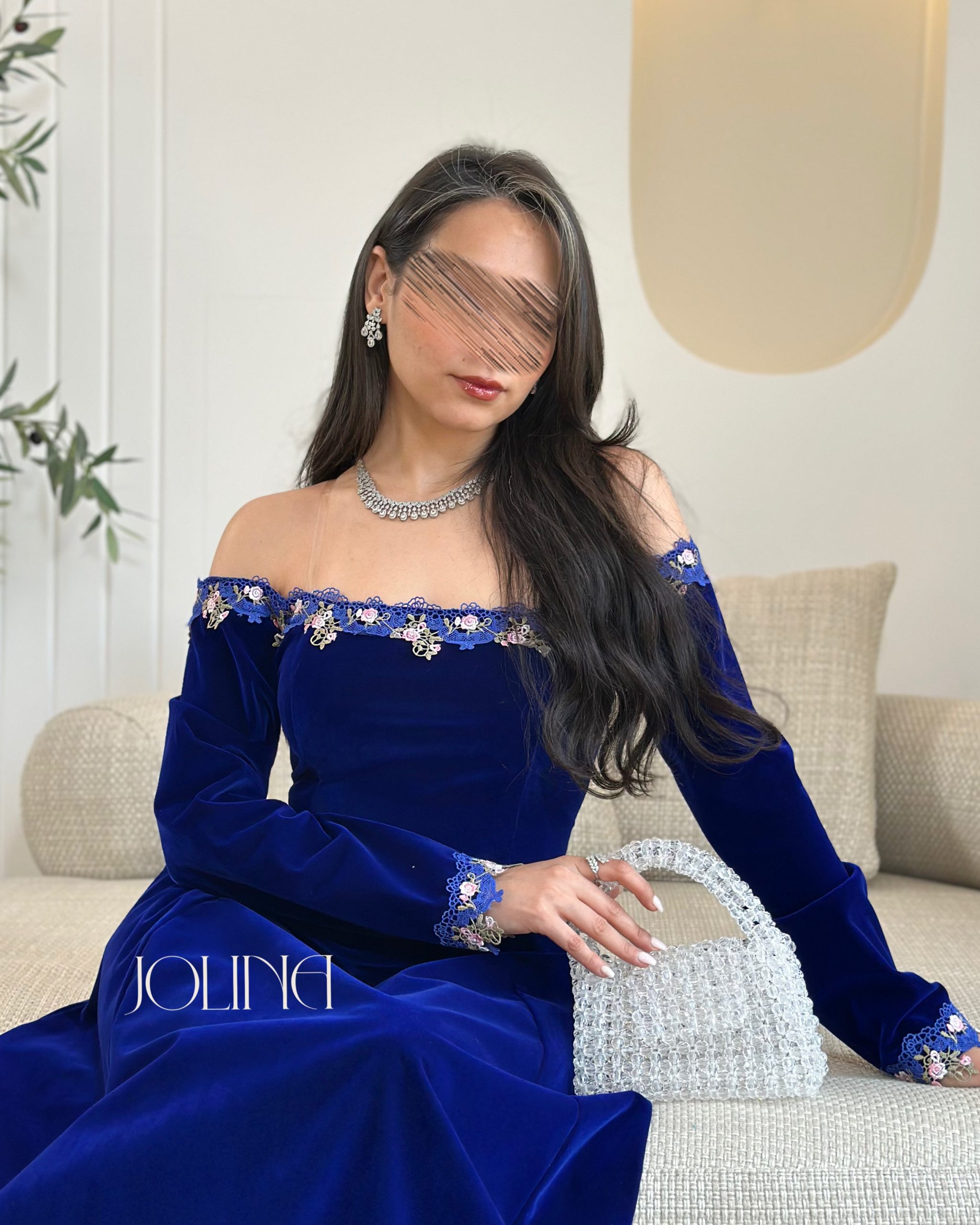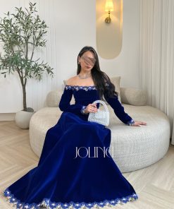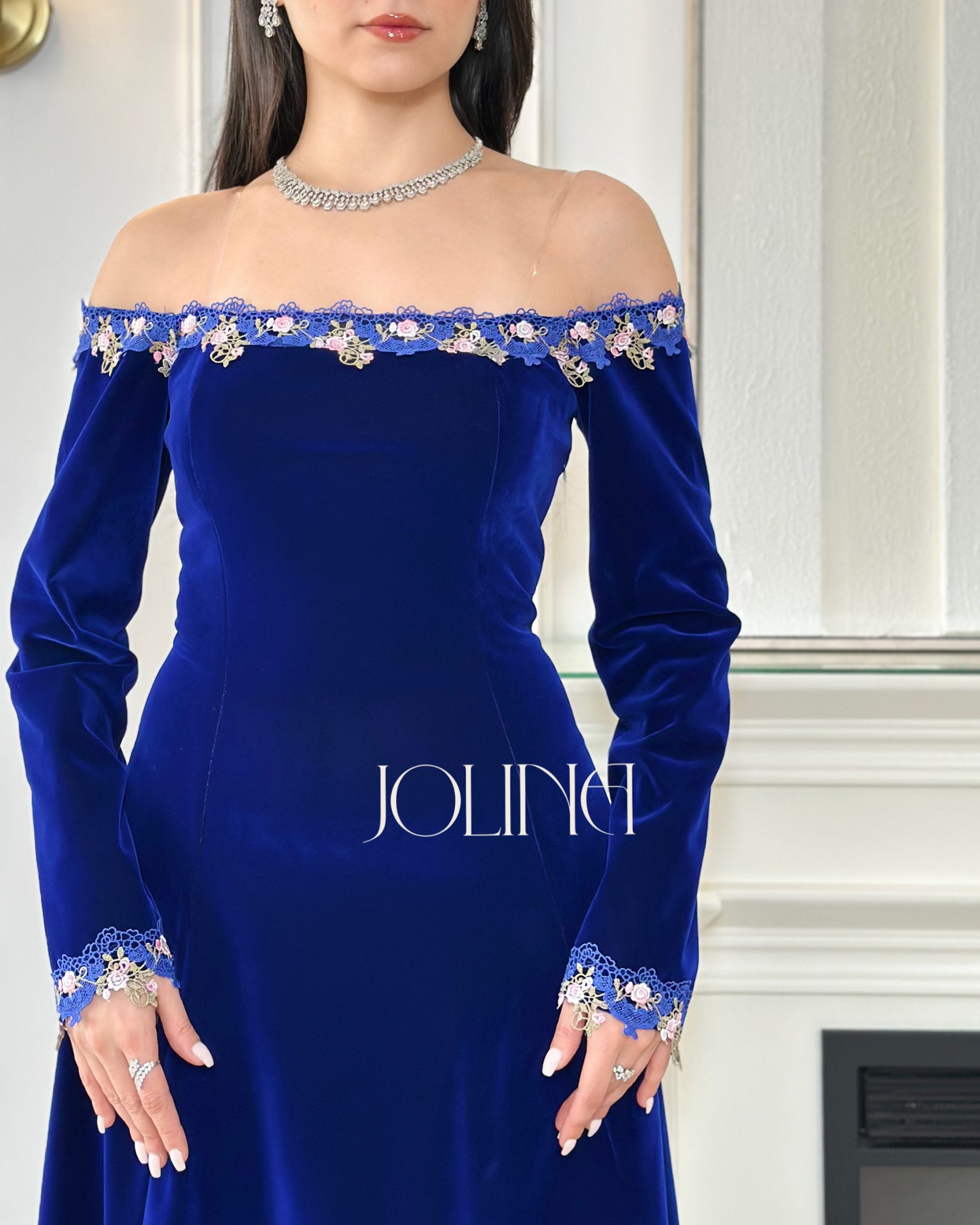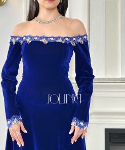 جولينا – فستان ازرق جوخ اوف شولدر بتطريز من الحواف