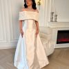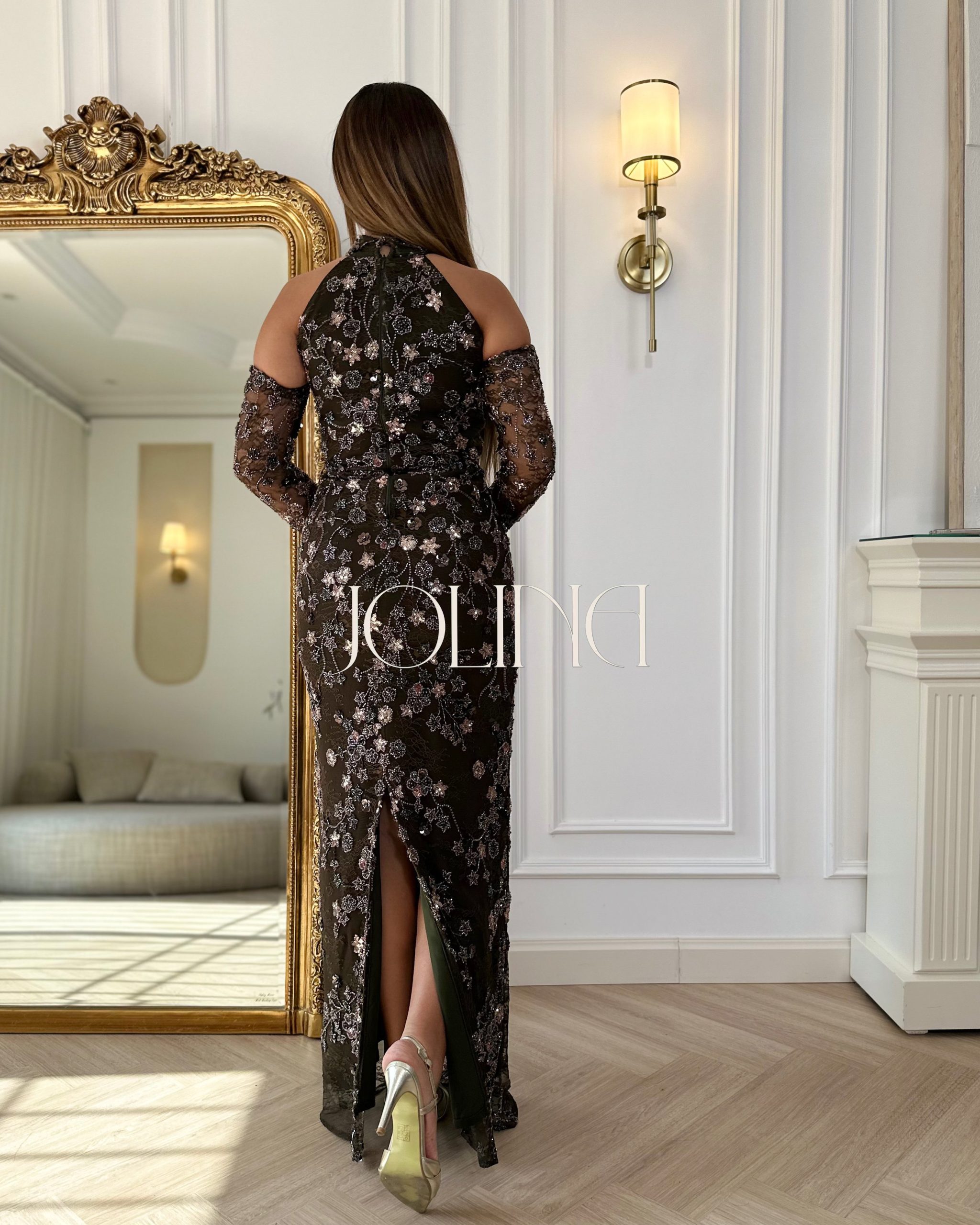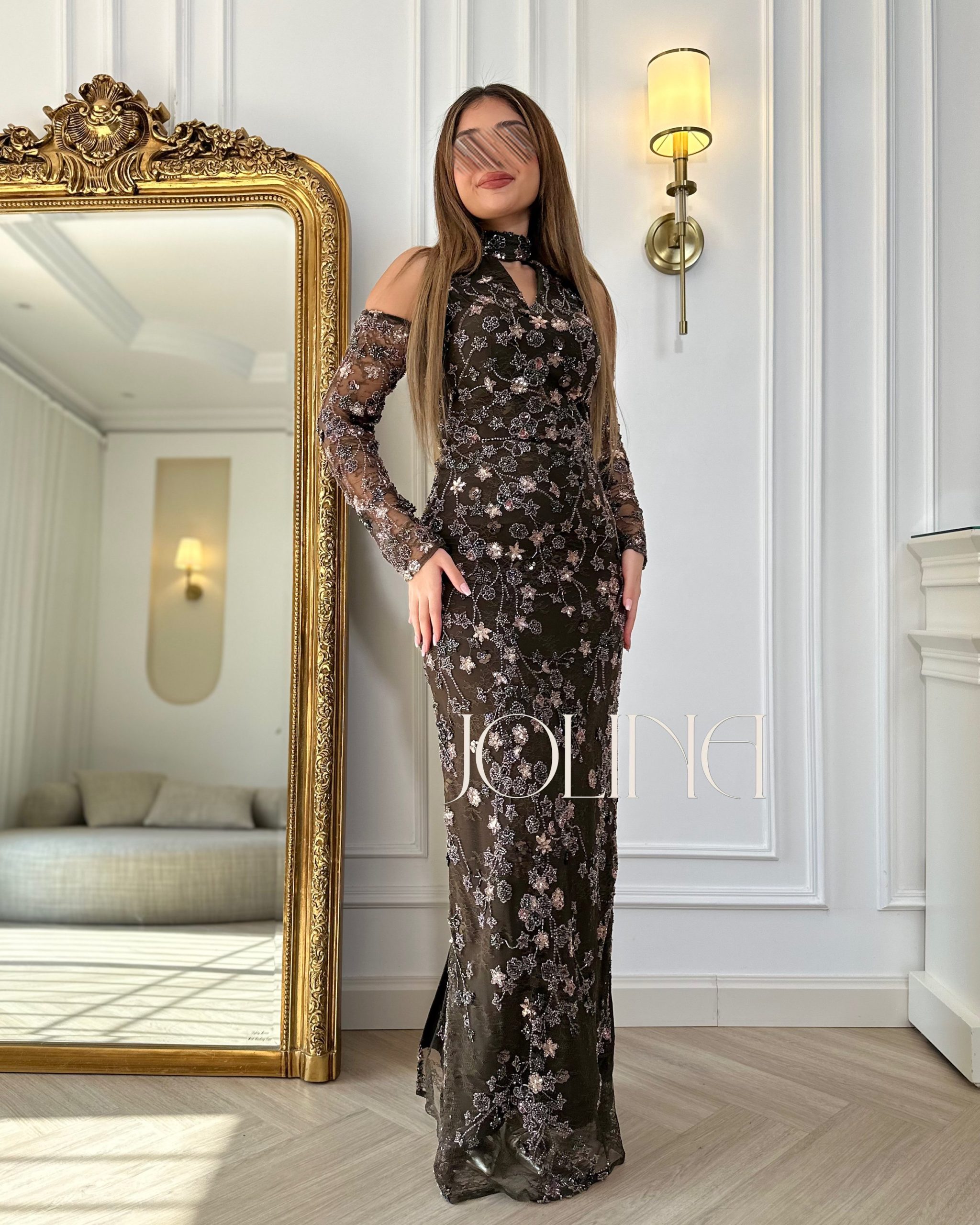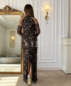 جولينا – فستان بني مطرز بالكامل بتصميم كتف مكشوف