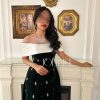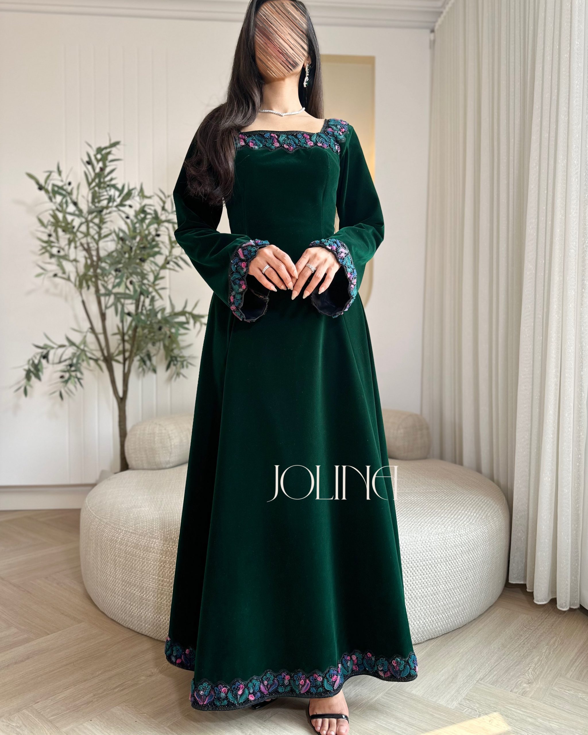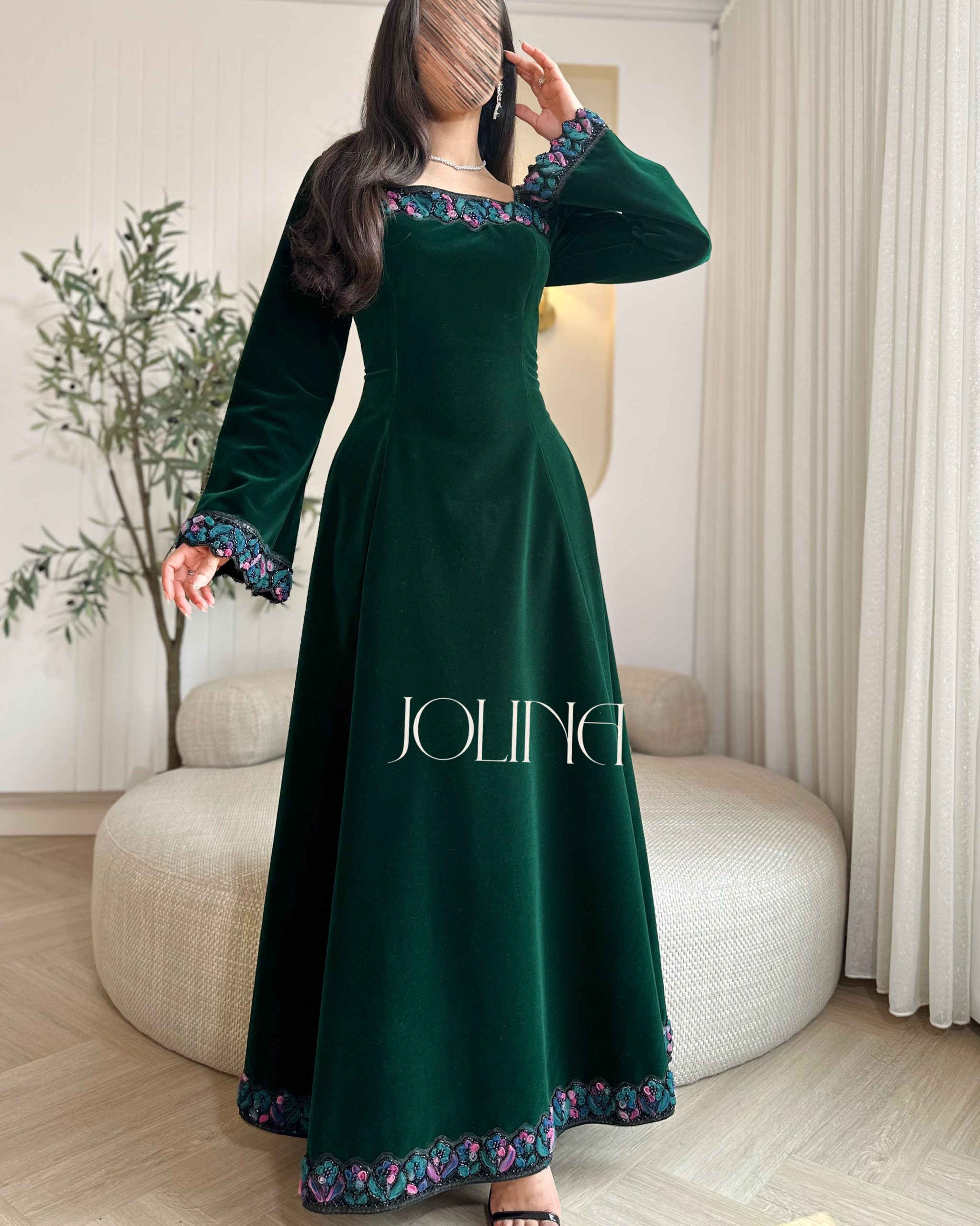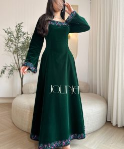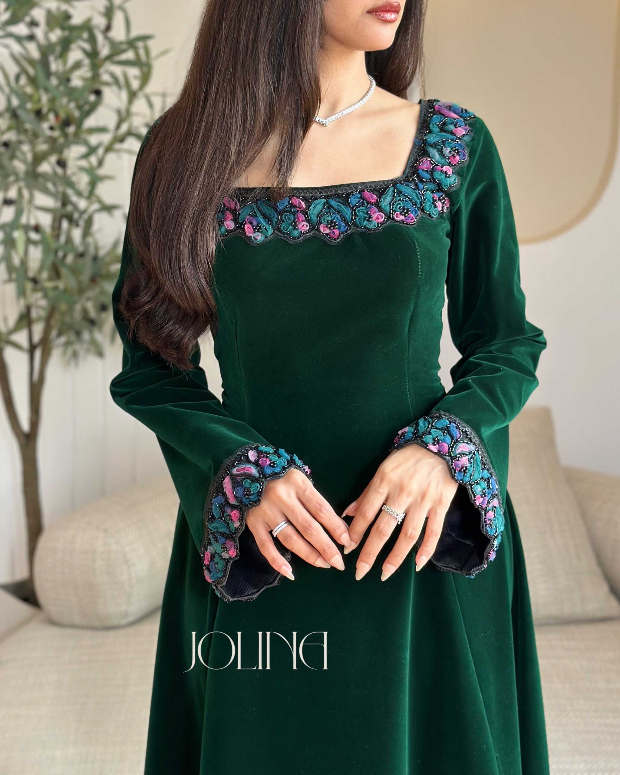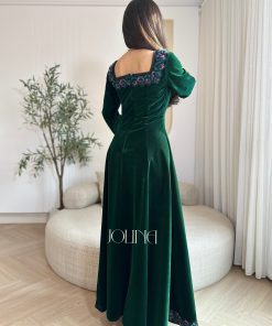 جولينا – فستان زيتي مخمل باكمام وتطريز من الاطراف