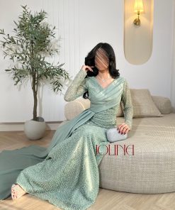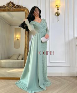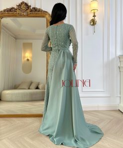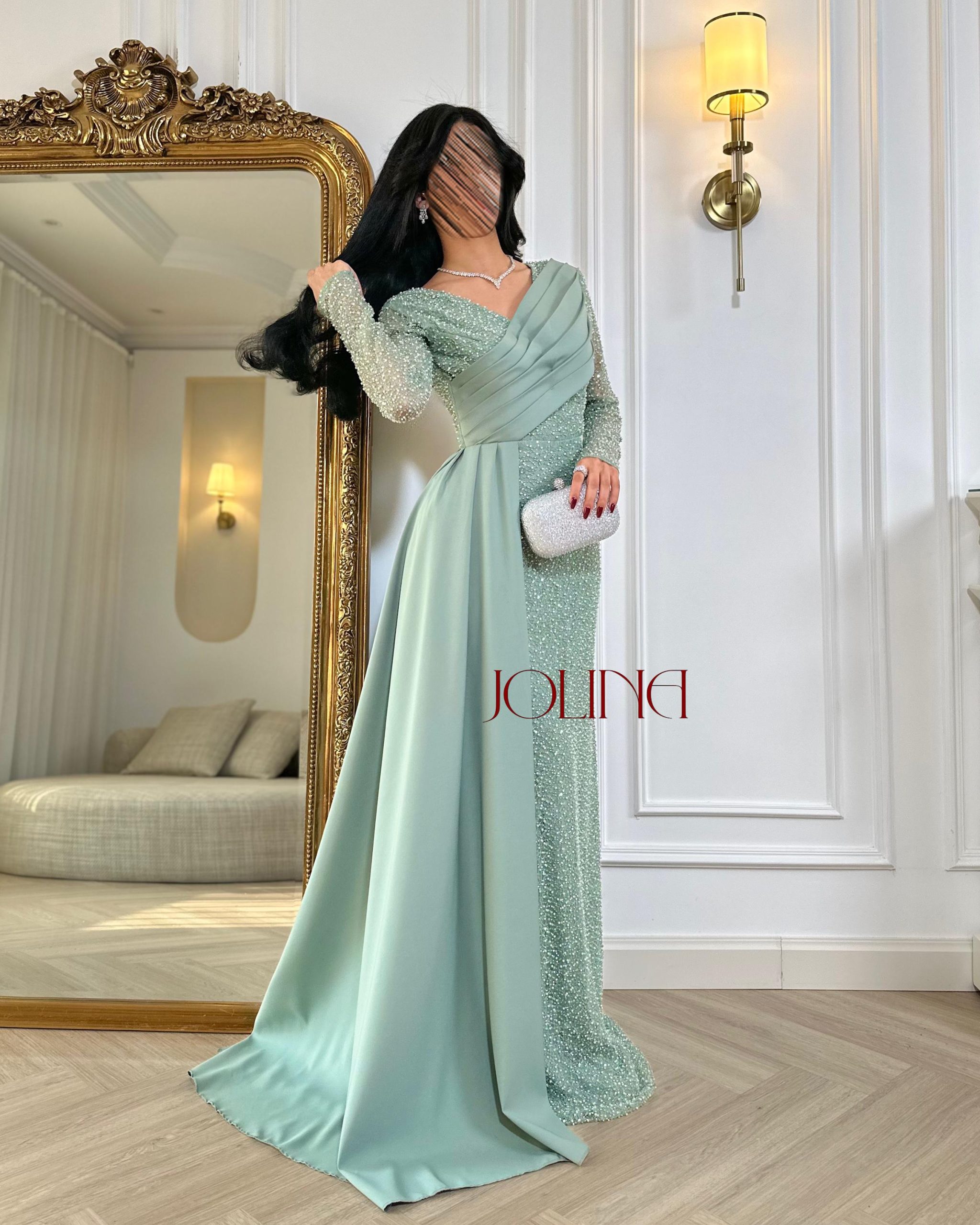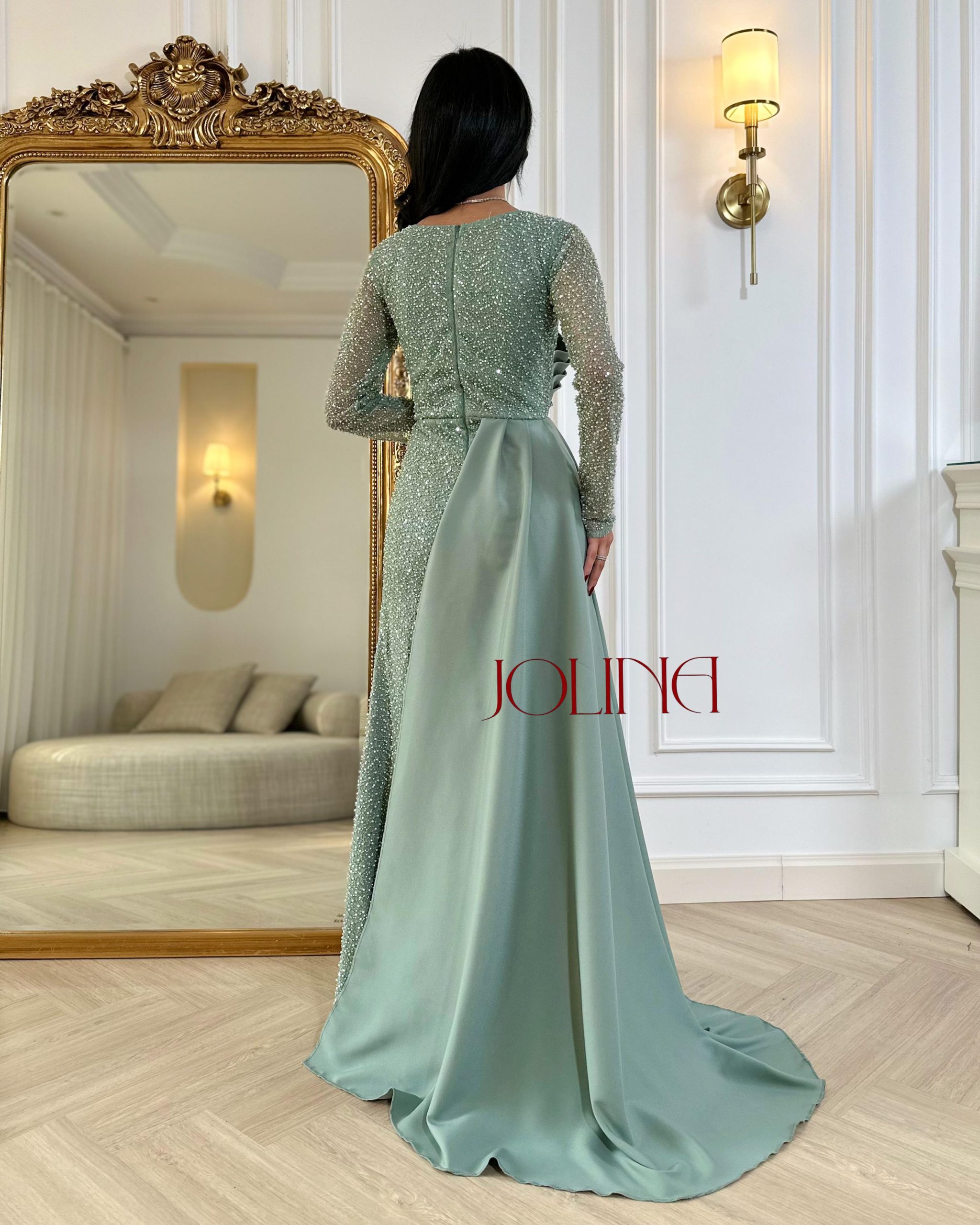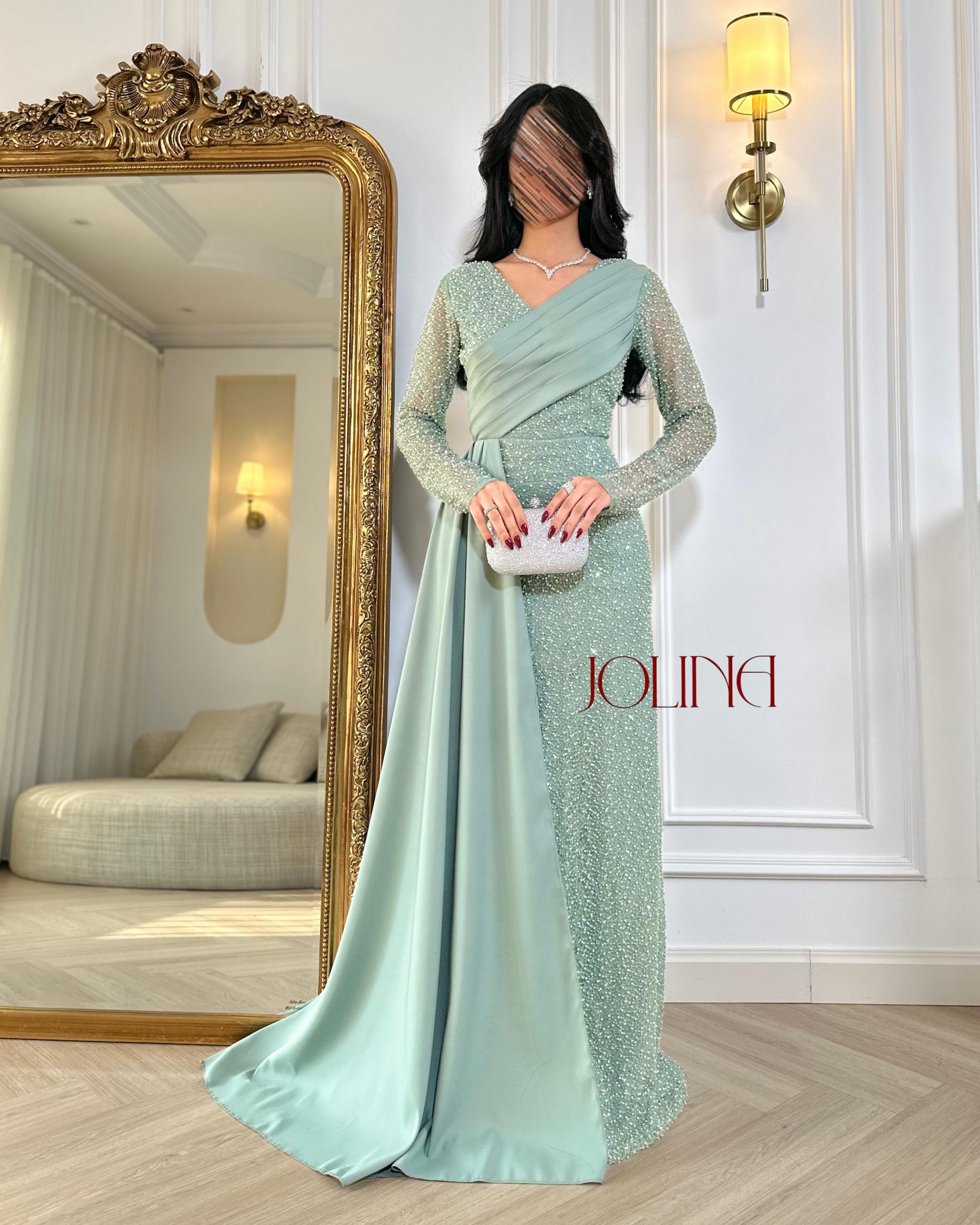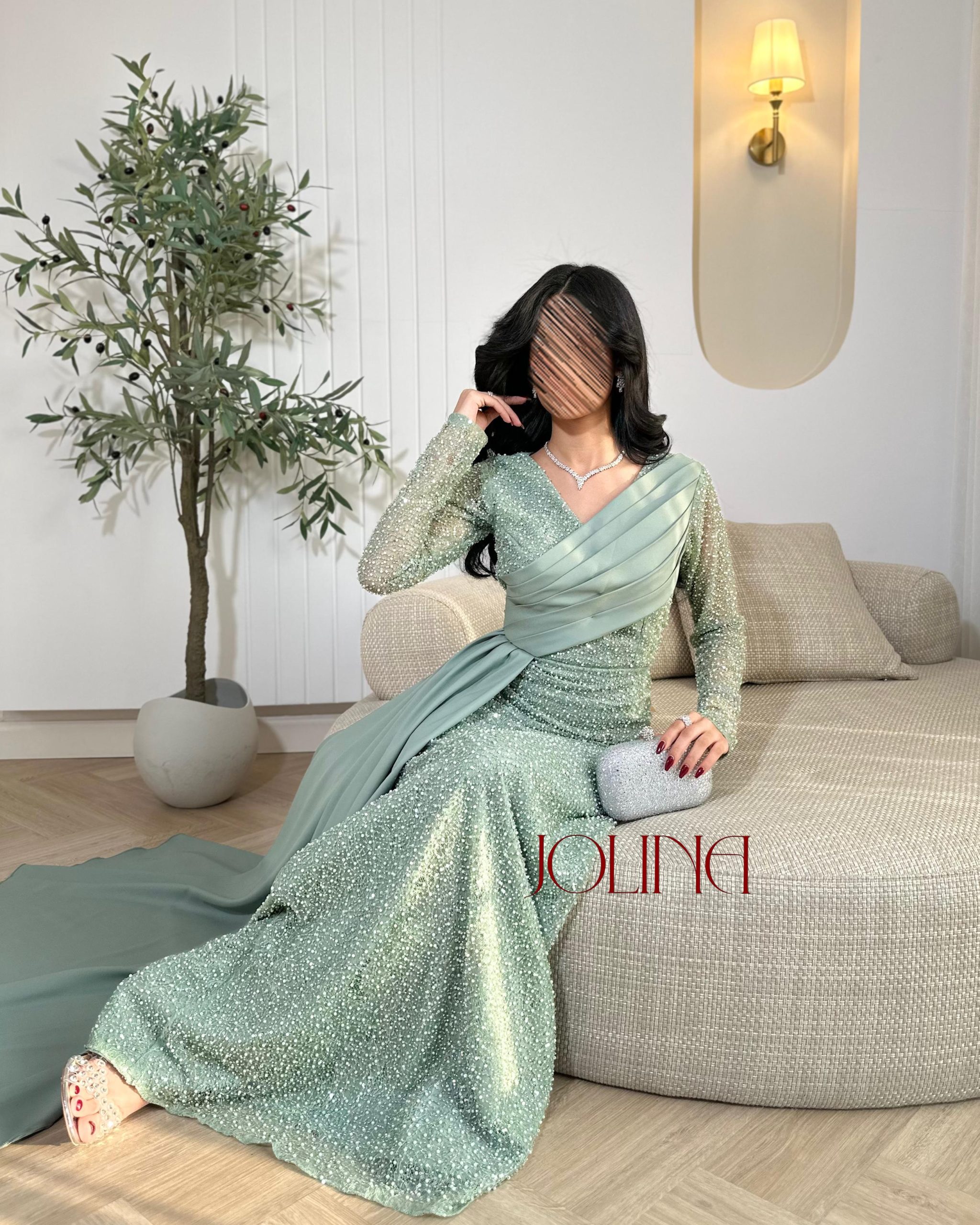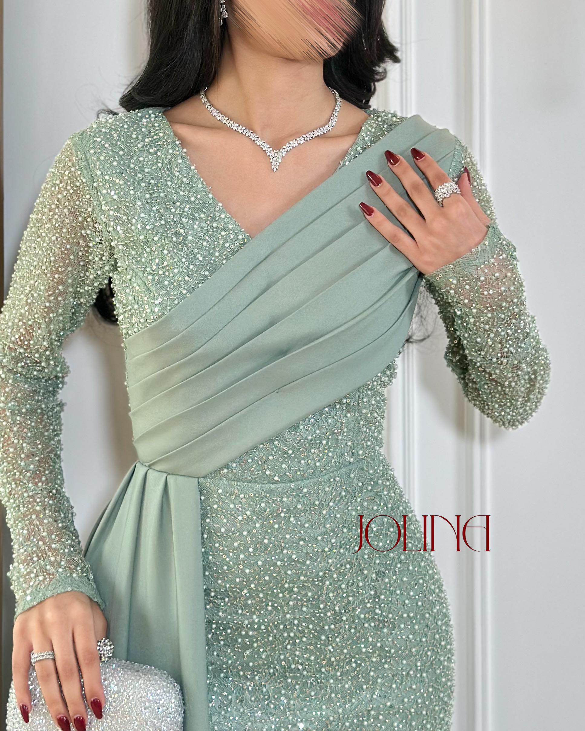 جولينا – فستان سهرة أخضر فاتح بأكمام مطرزة