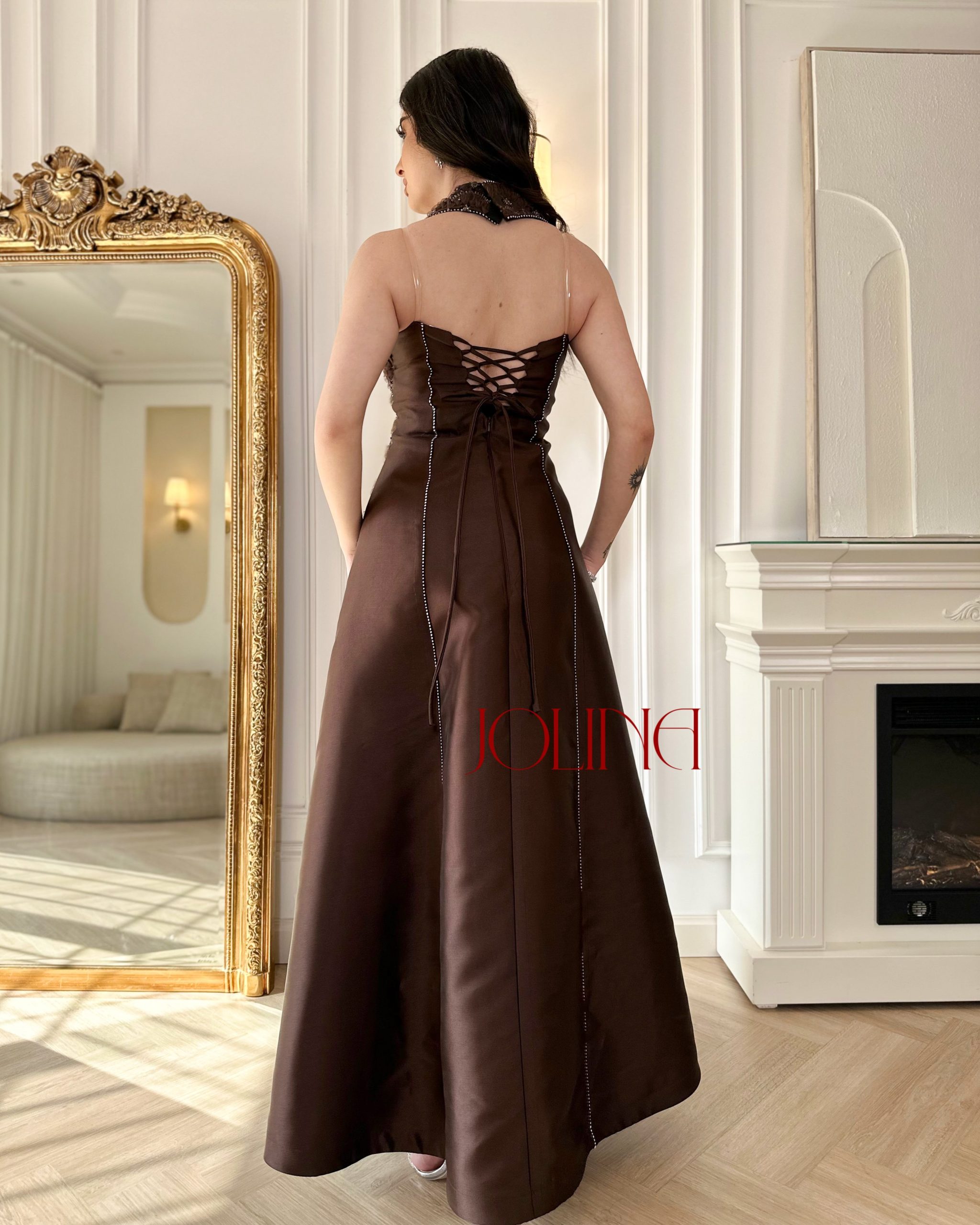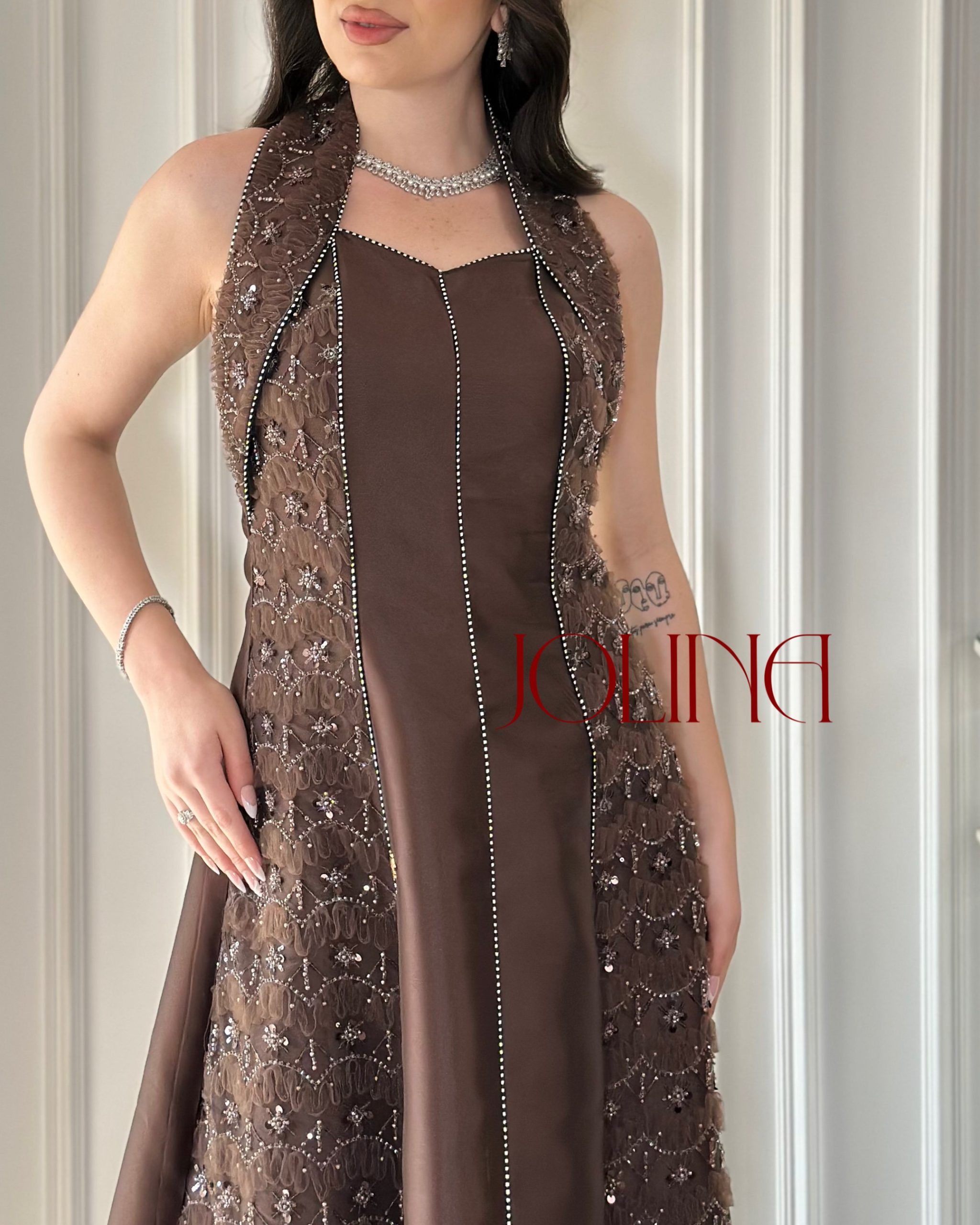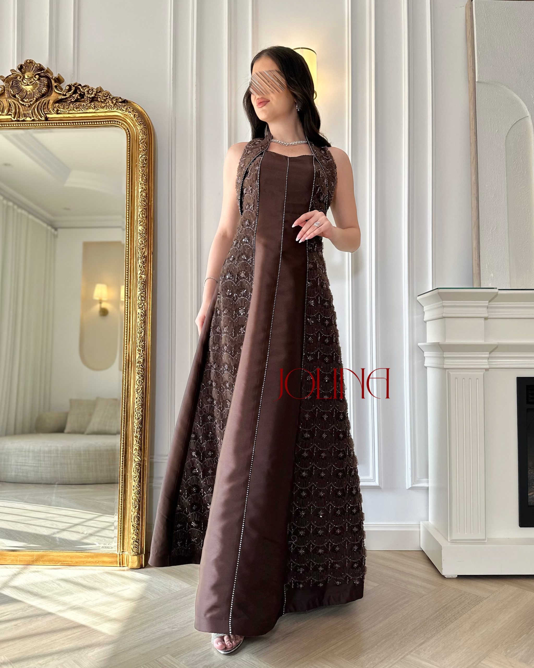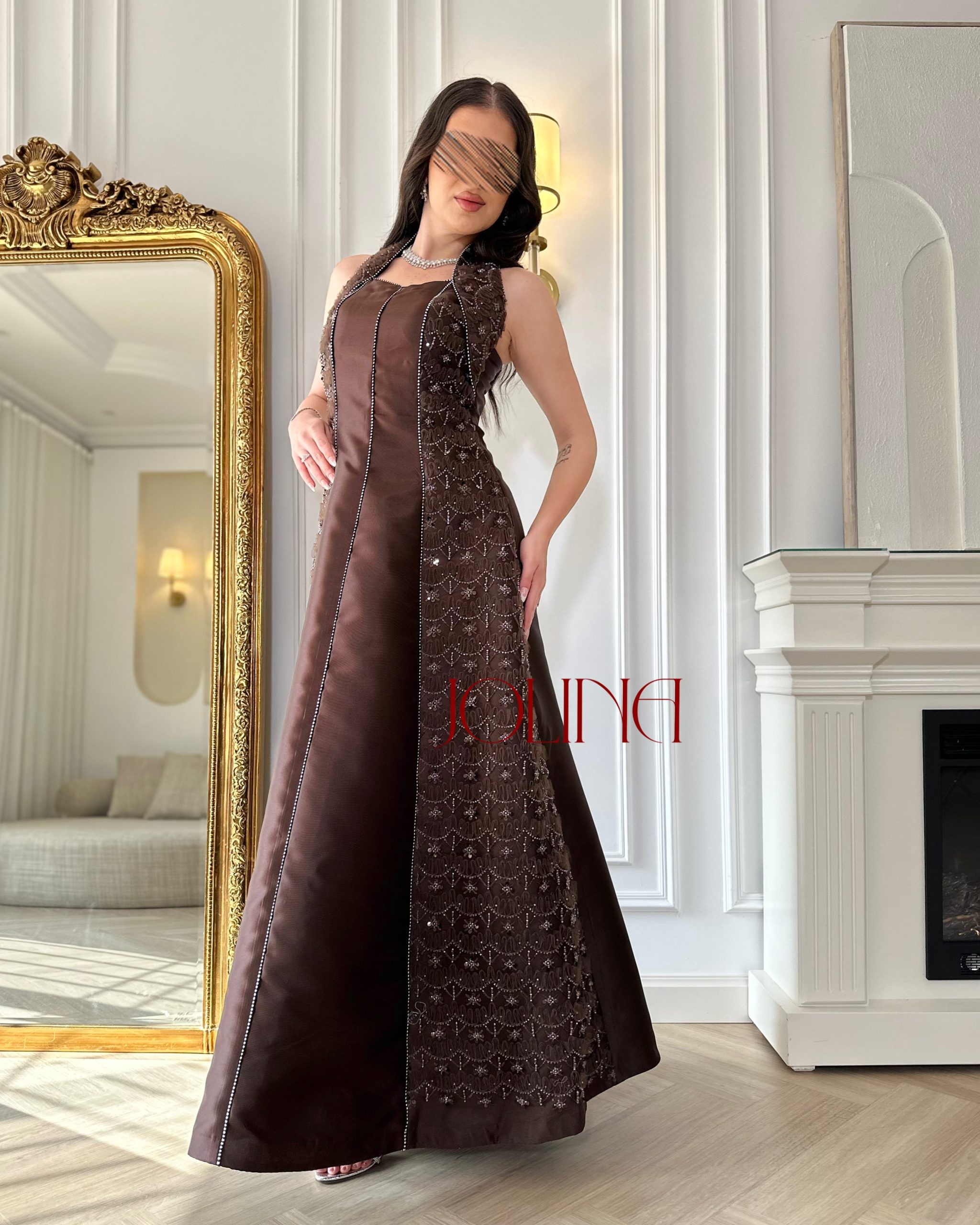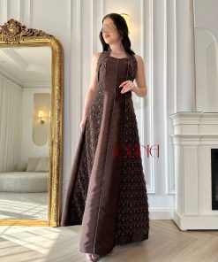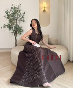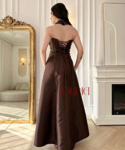 جولينا – فستان سهرة بني طويل بتطريز جانبي