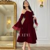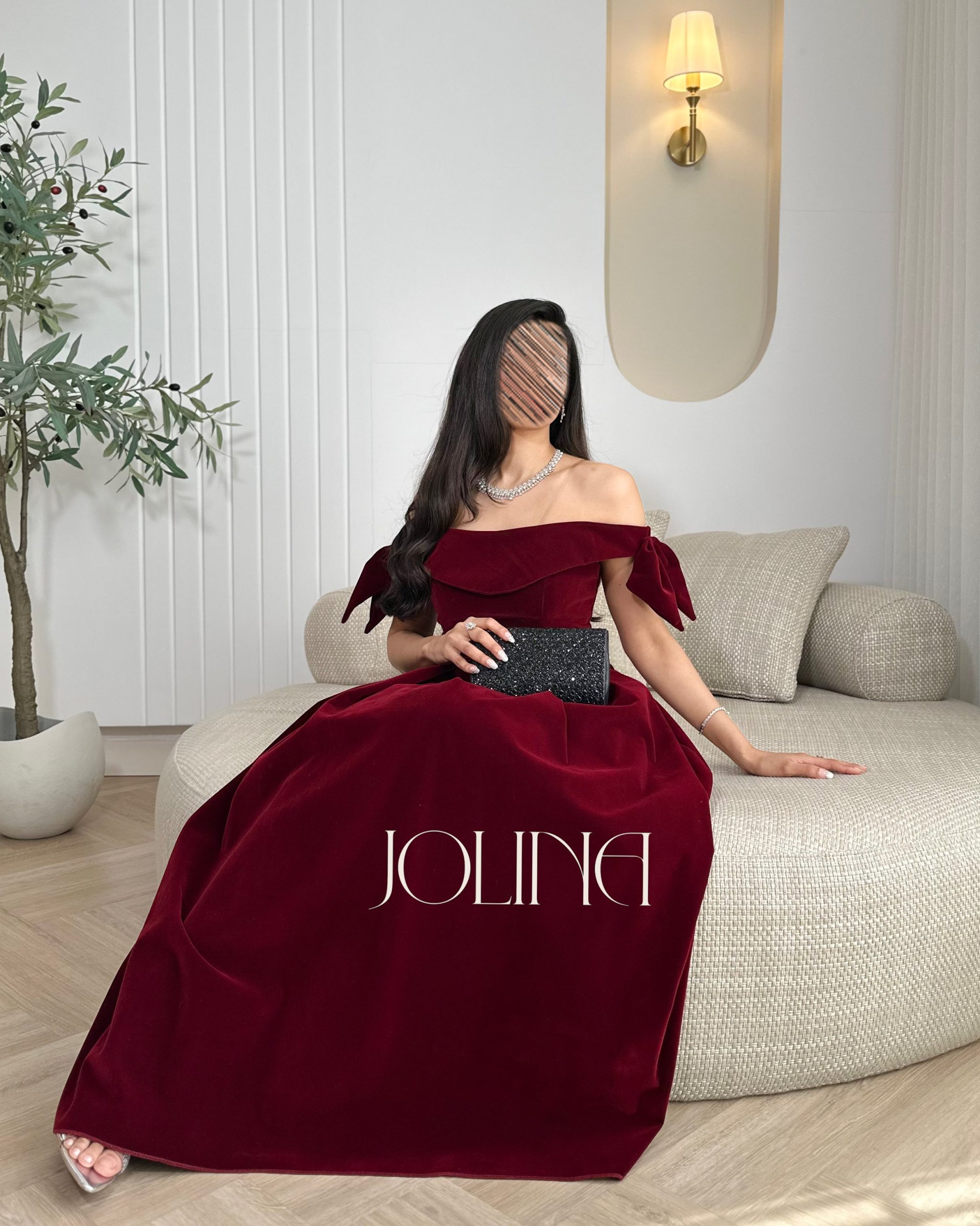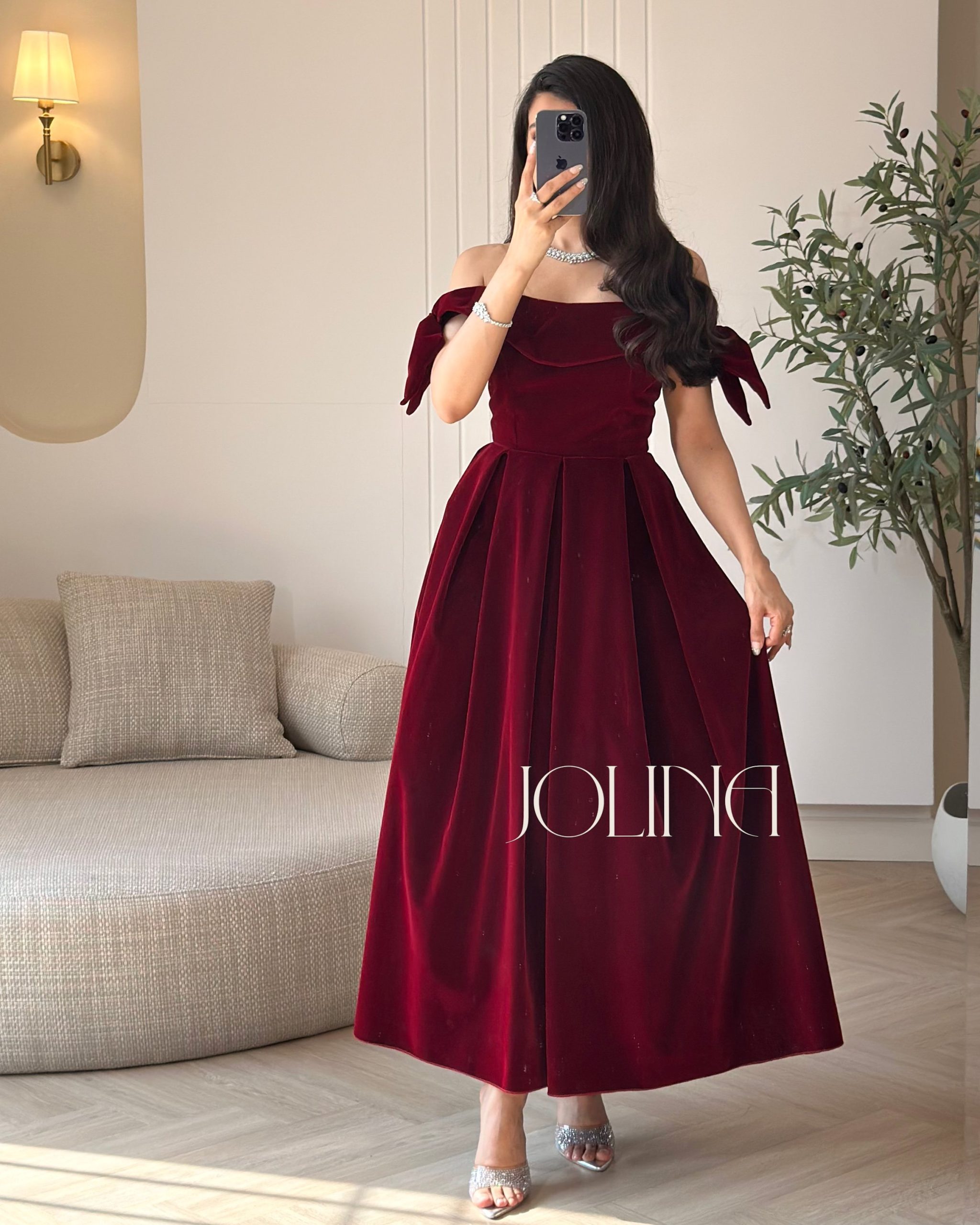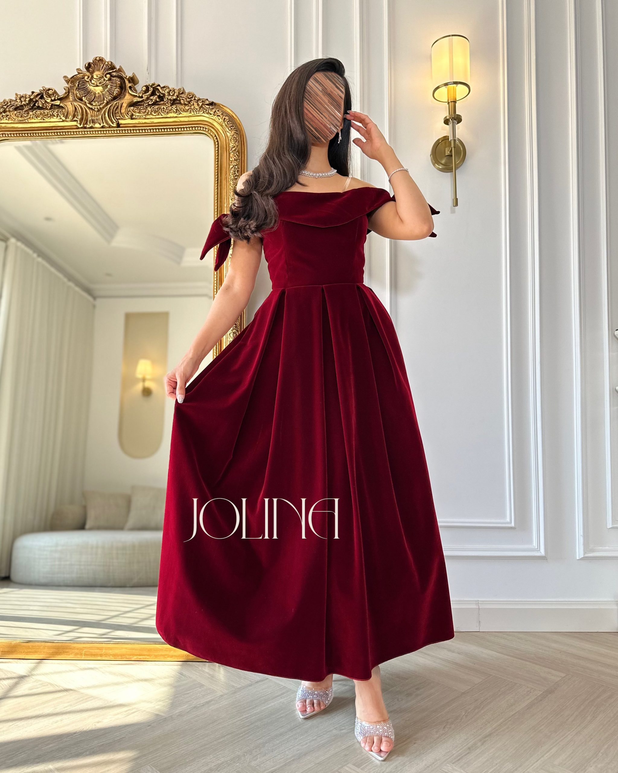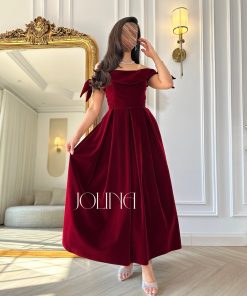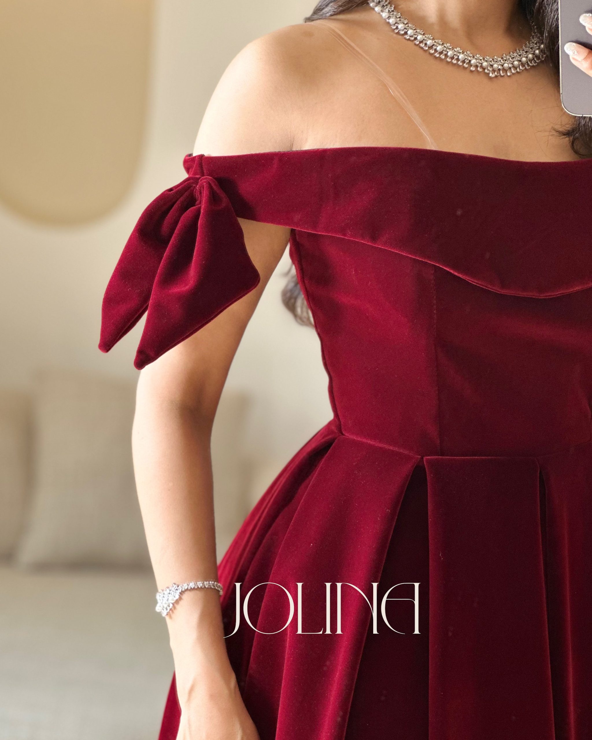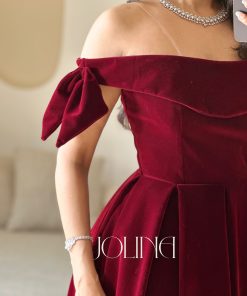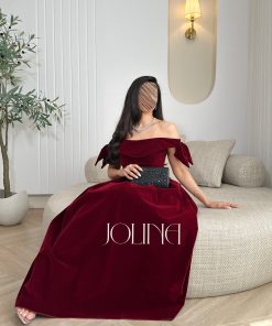 جولينا – فستان عنابي مخملي بتصميم اوف شولدر
