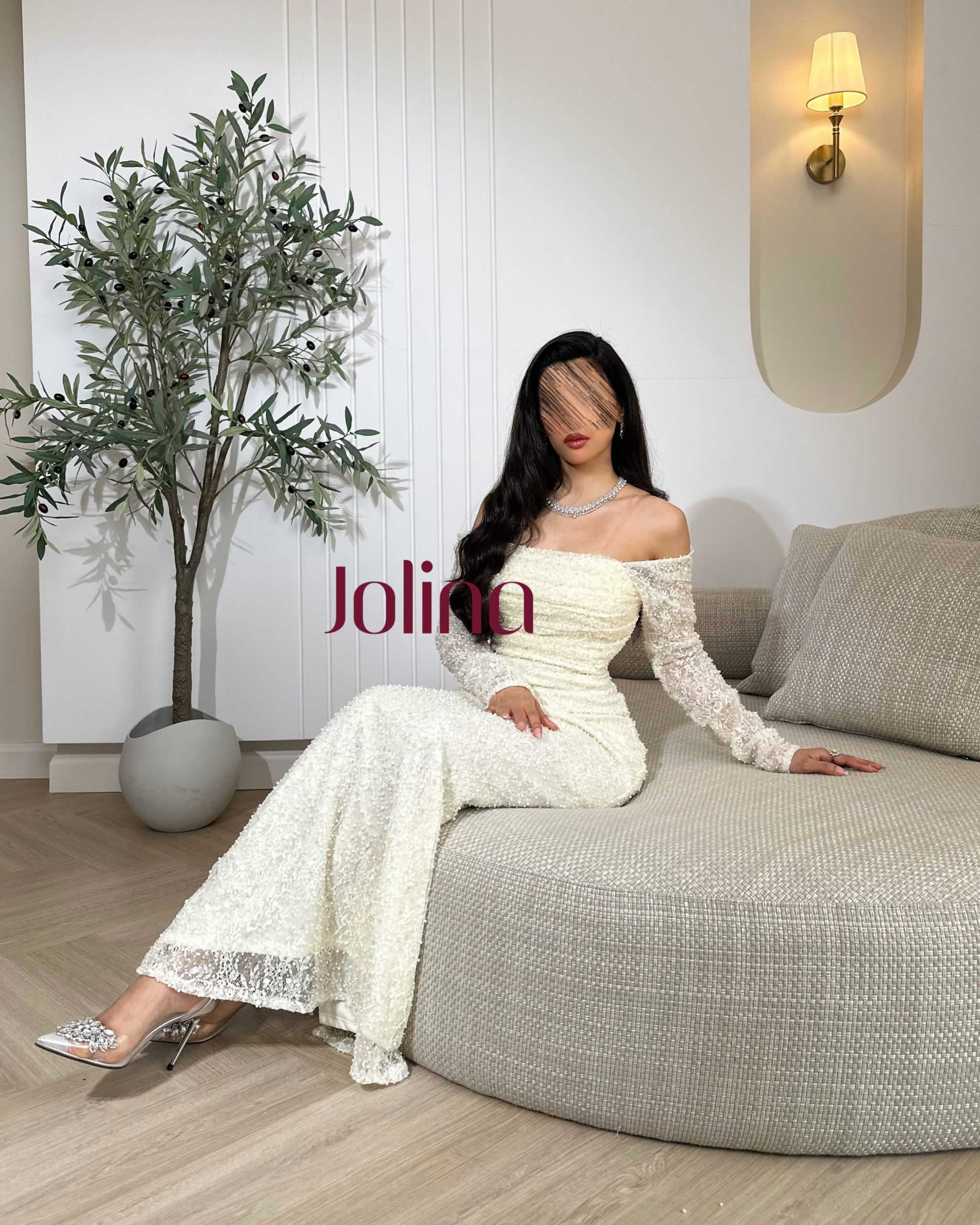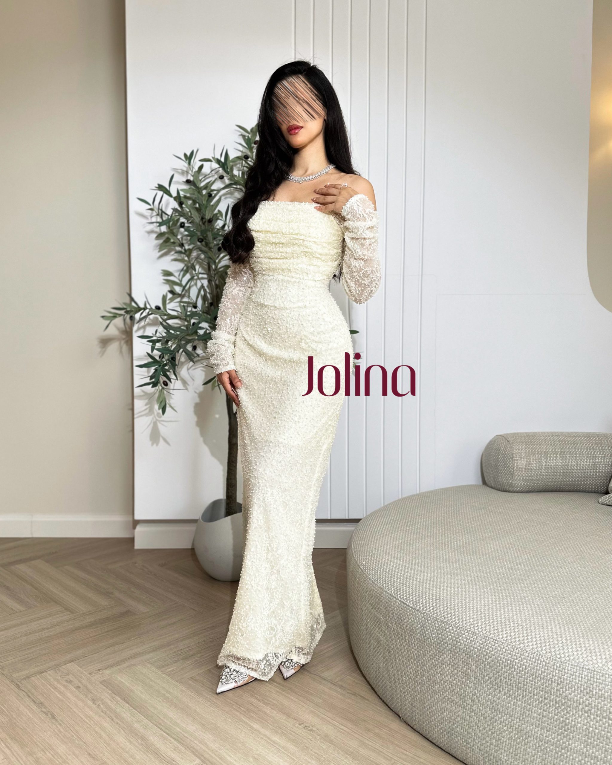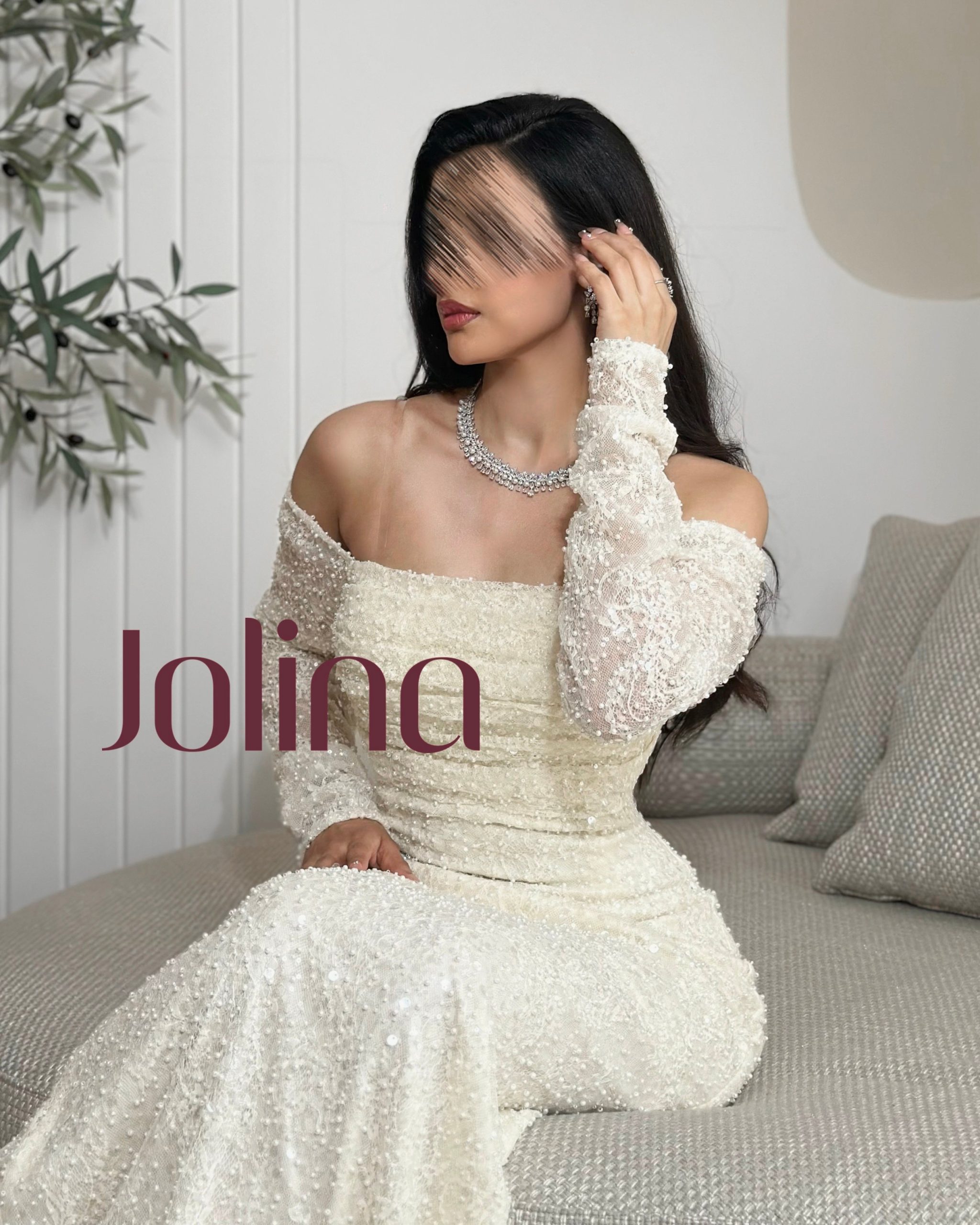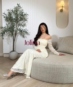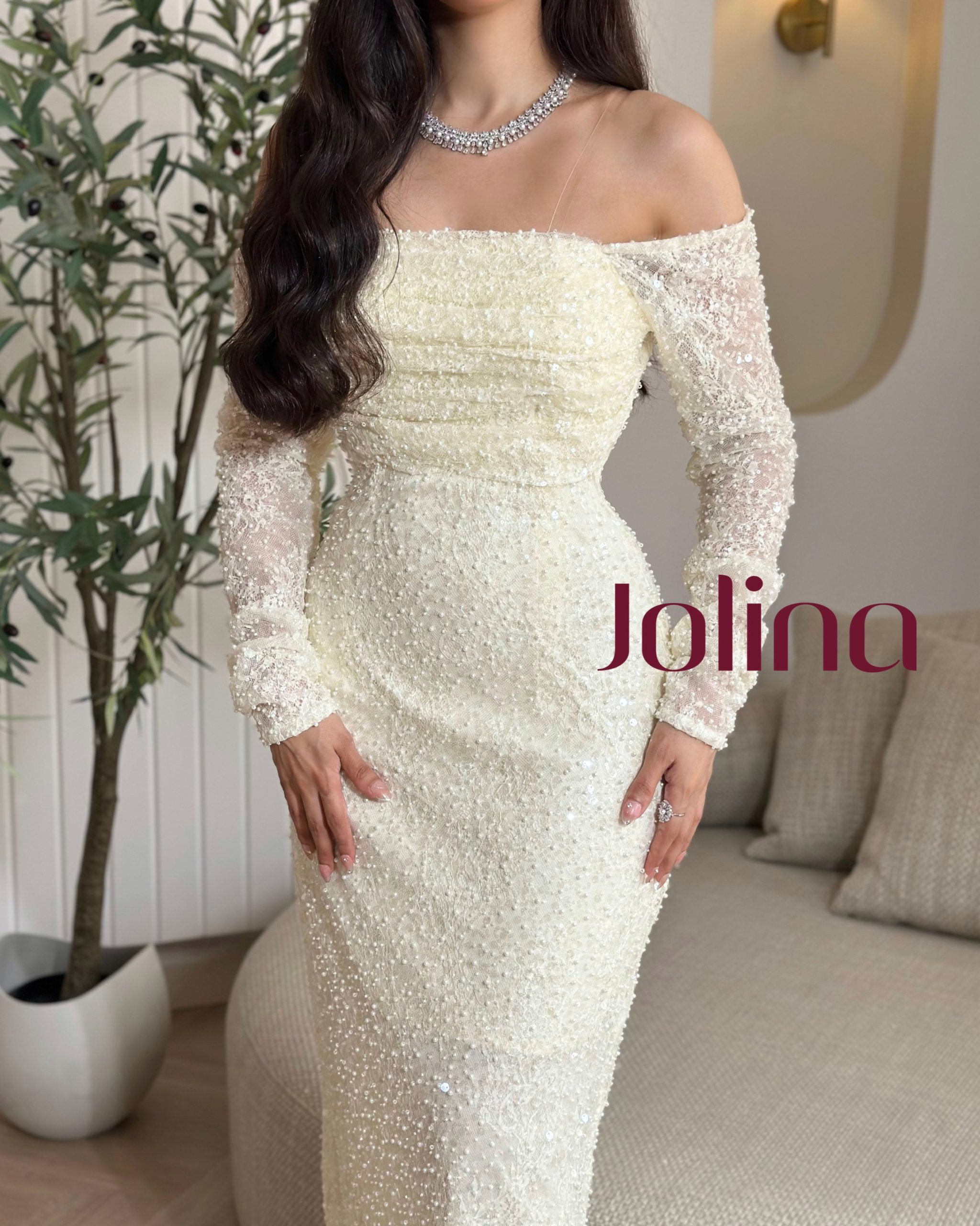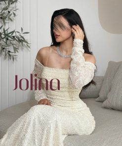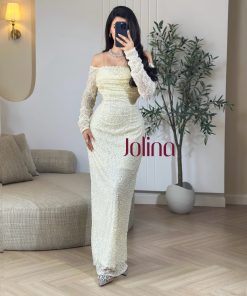 جولينا – فستان أبيض ناعم بأكتاف منسدلة وتطريزات لؤلؤية