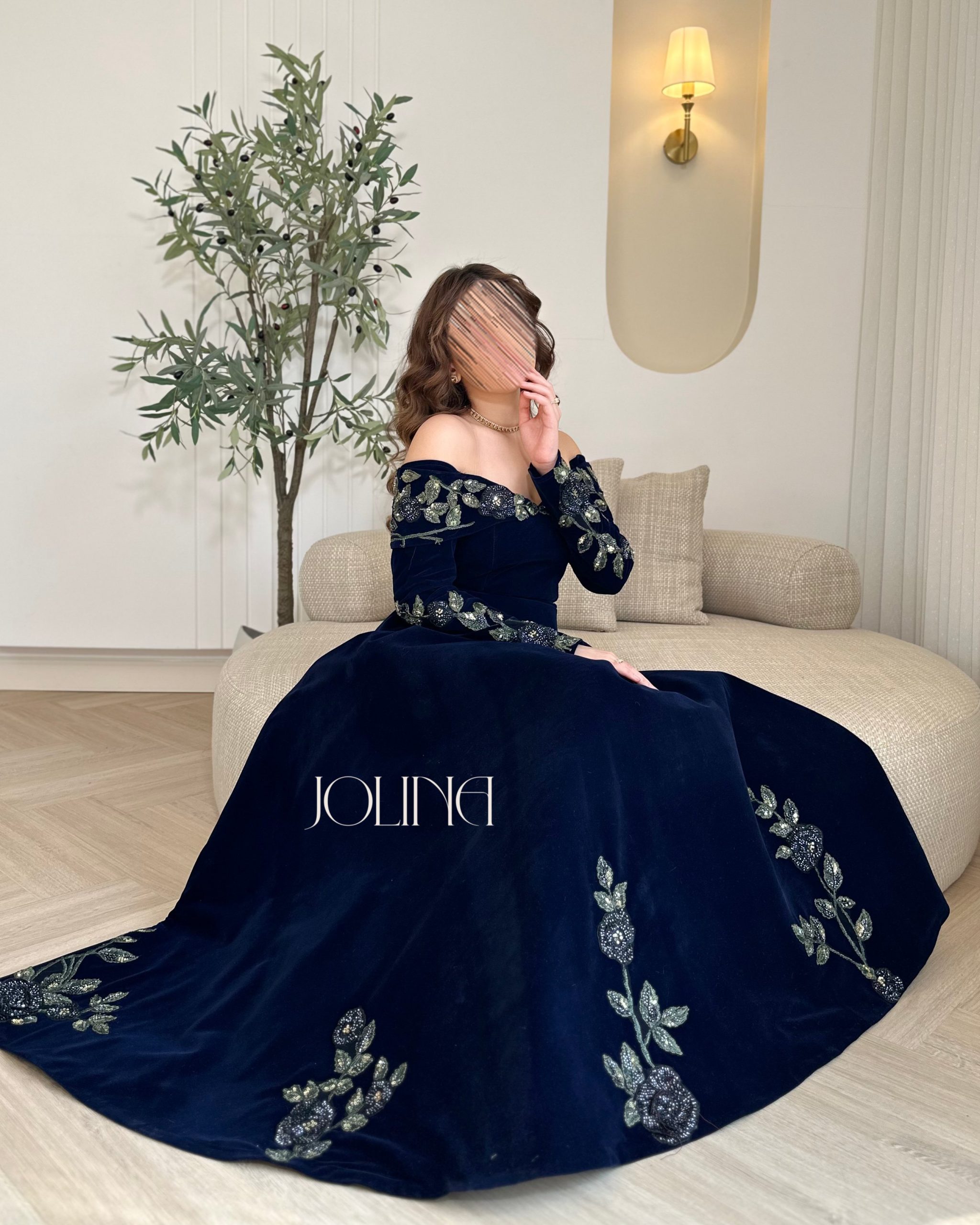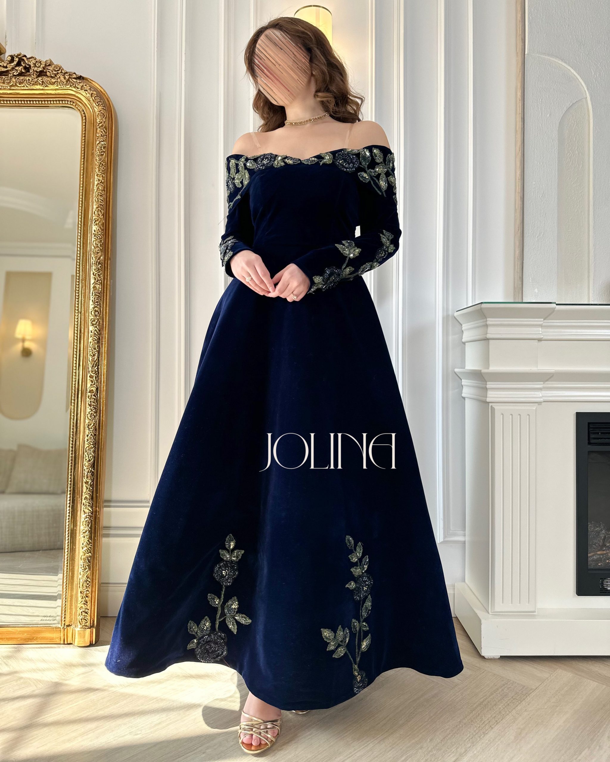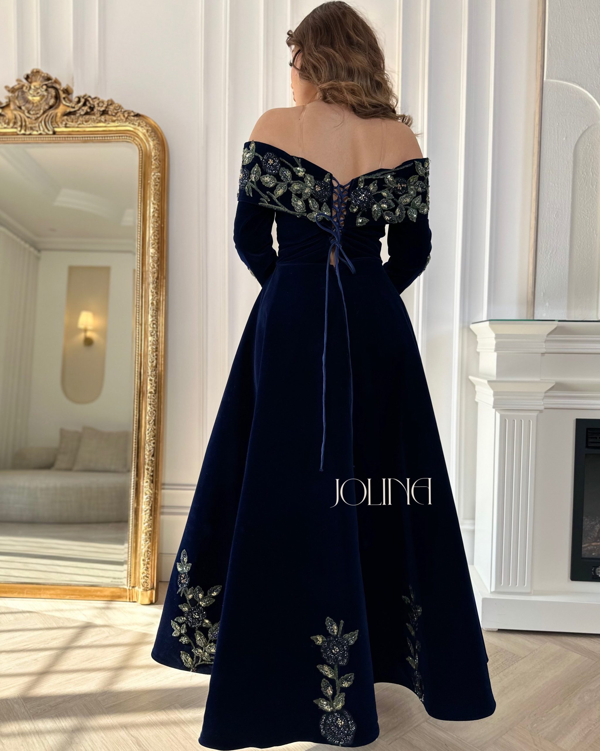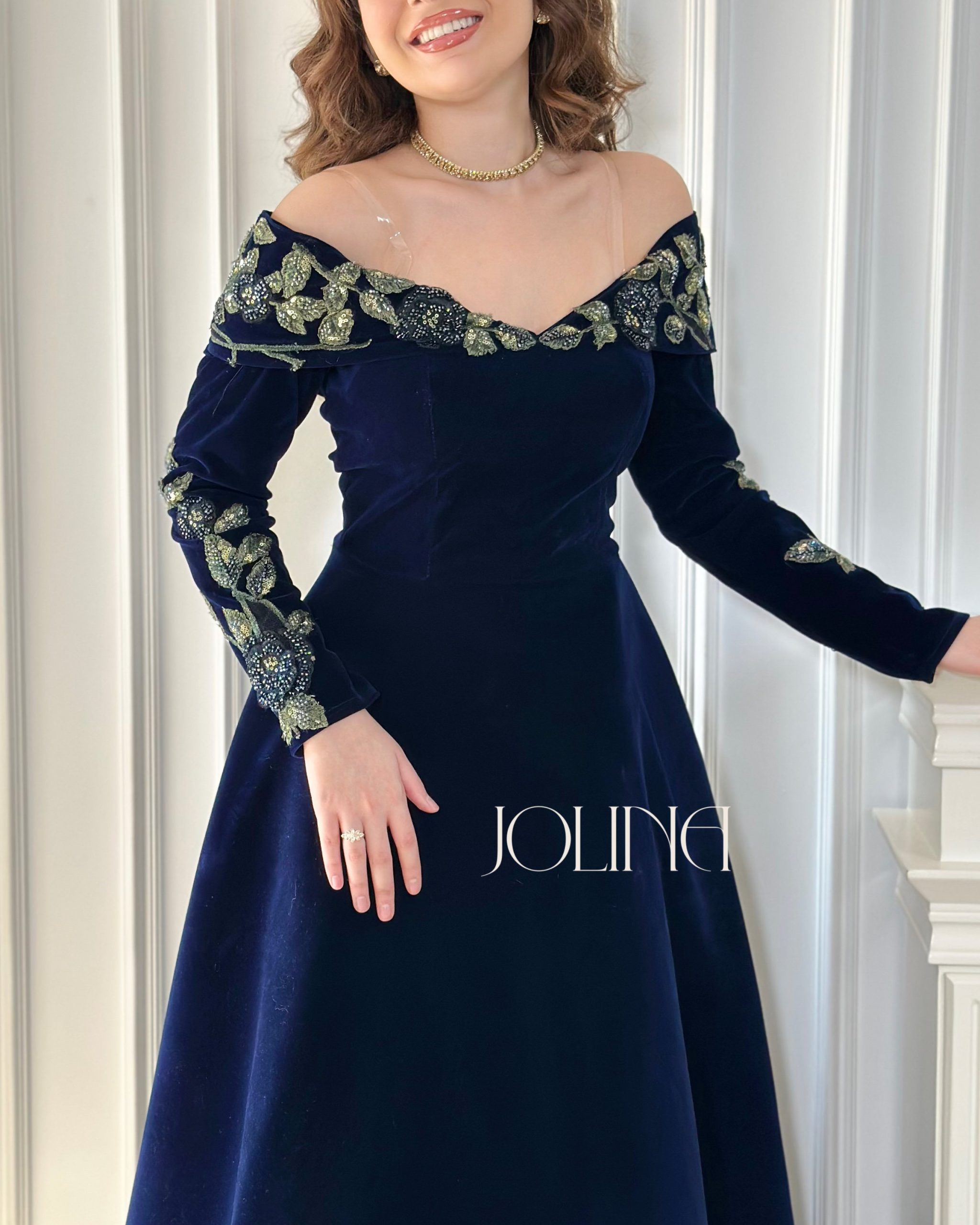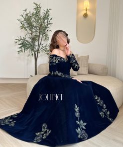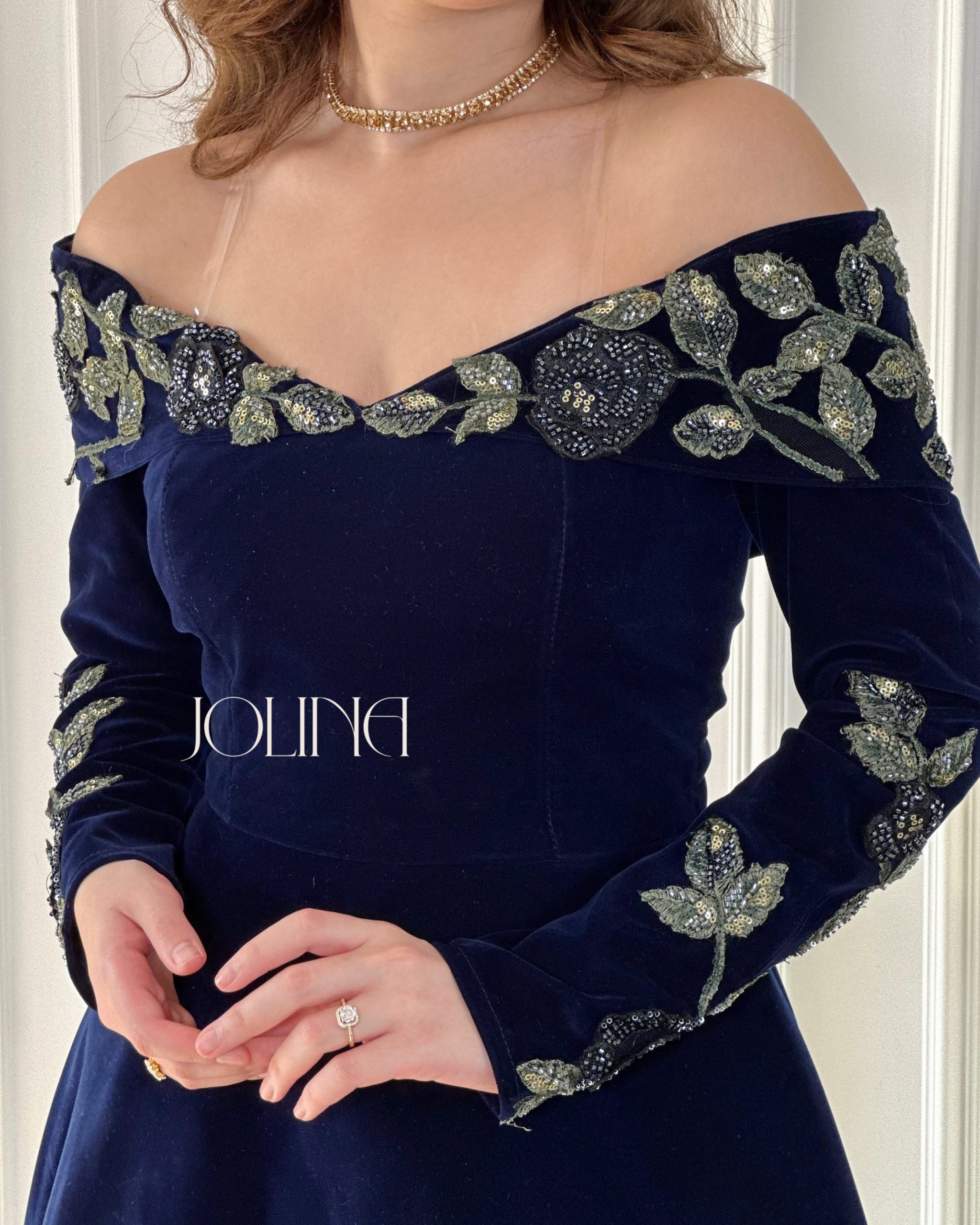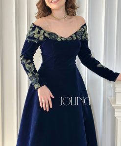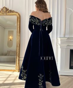 جولينا – فستان مخمل كحلي مطرز بالورود
