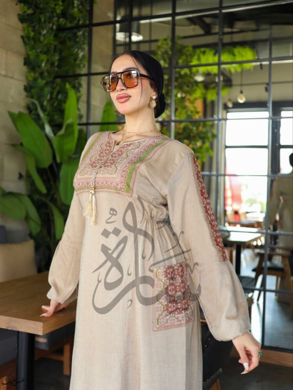 عباية كتان بجيبين واسعة ومريحة، مزينة بتطريز إيتامين سيناوي يعكس الطابع التراثي الأصيل، تصميم أنيق وخامة طبيعية مناسبة للصيف والمشاوير.
