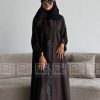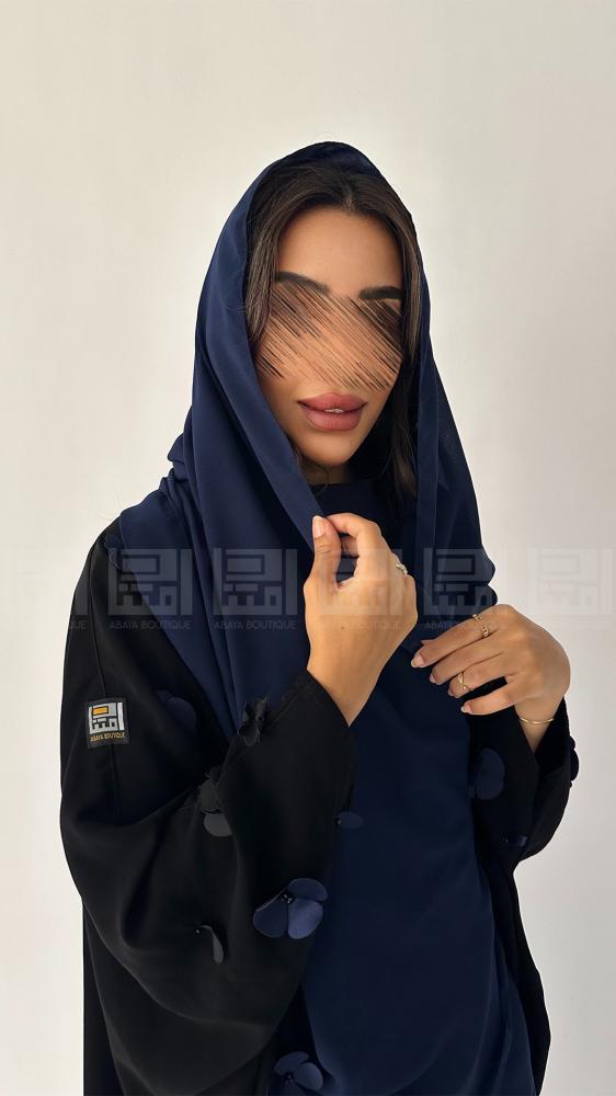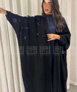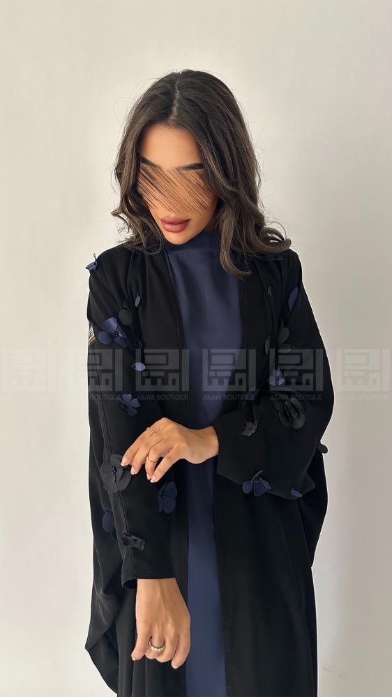 عباية بشت سوداء مزينة بزهور زرقاء بقماش صيفي هي الخيار المثالي لتضفي لمسة أنيقة على إطلالتك. تتميز هذه العباية بقماش صيفي كريب لمياء الفاخر، الذي يمتاز بلونه الأسود الداكن ومظهره المطفي، مما يمنحك شعورًا بالفخامة والراحة في آن واحد.