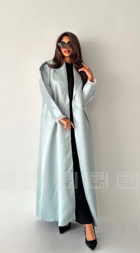 عباية باللون الأزرق السماوي بأكمام مزينة بالتل الابيض بثنيات تضفي لك الرقة ، تتزين بياقة رسمية انيقة .. كما ان الاكتاف تزدان بقصة البف لفخامة لك تضيف لك التميز والأناقة ،