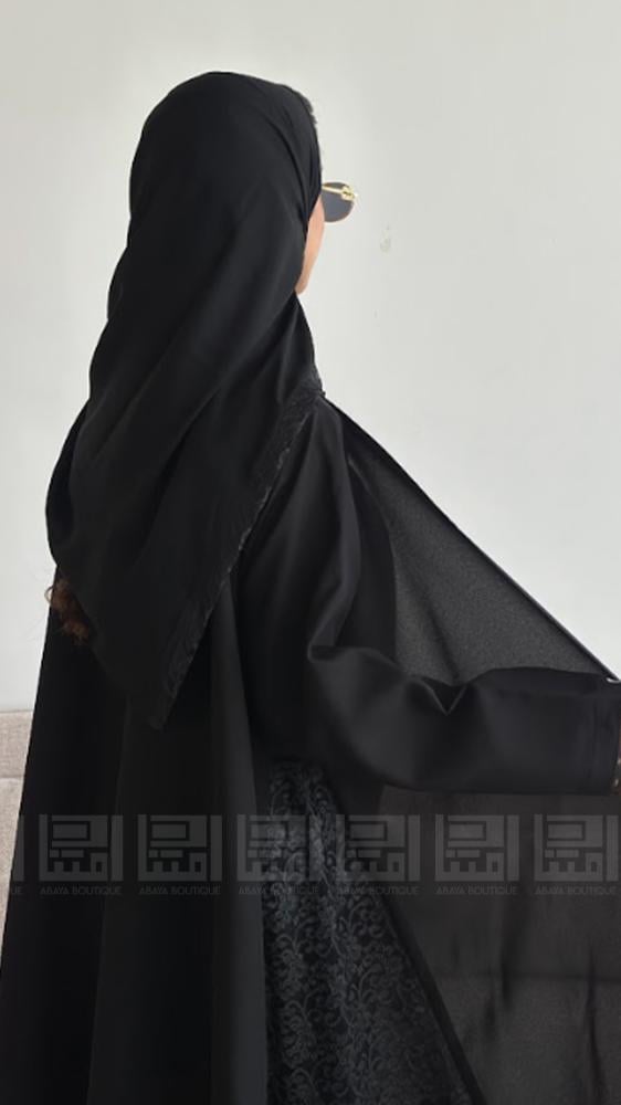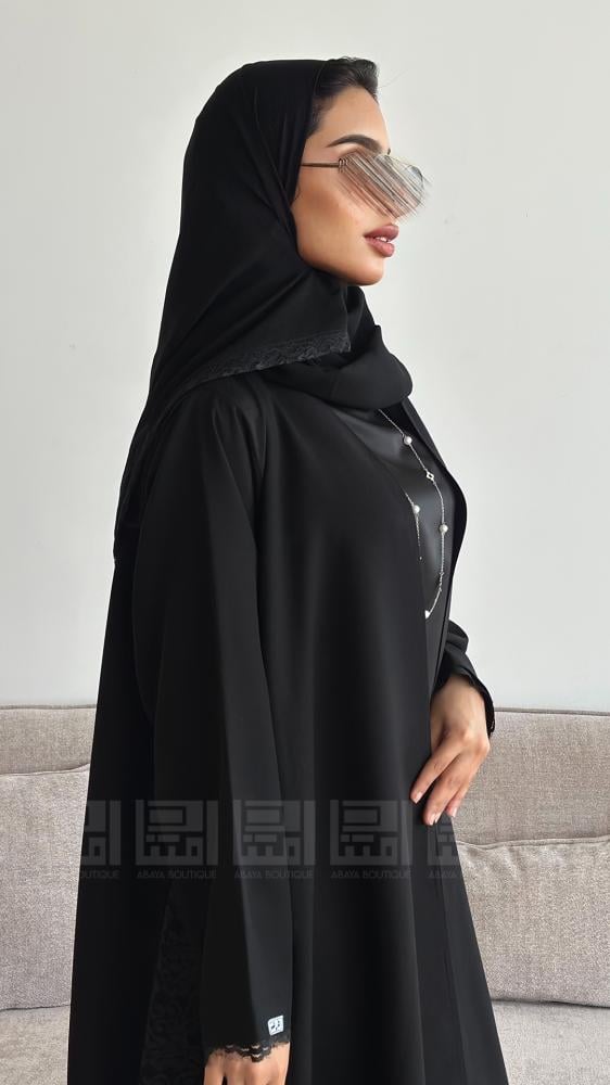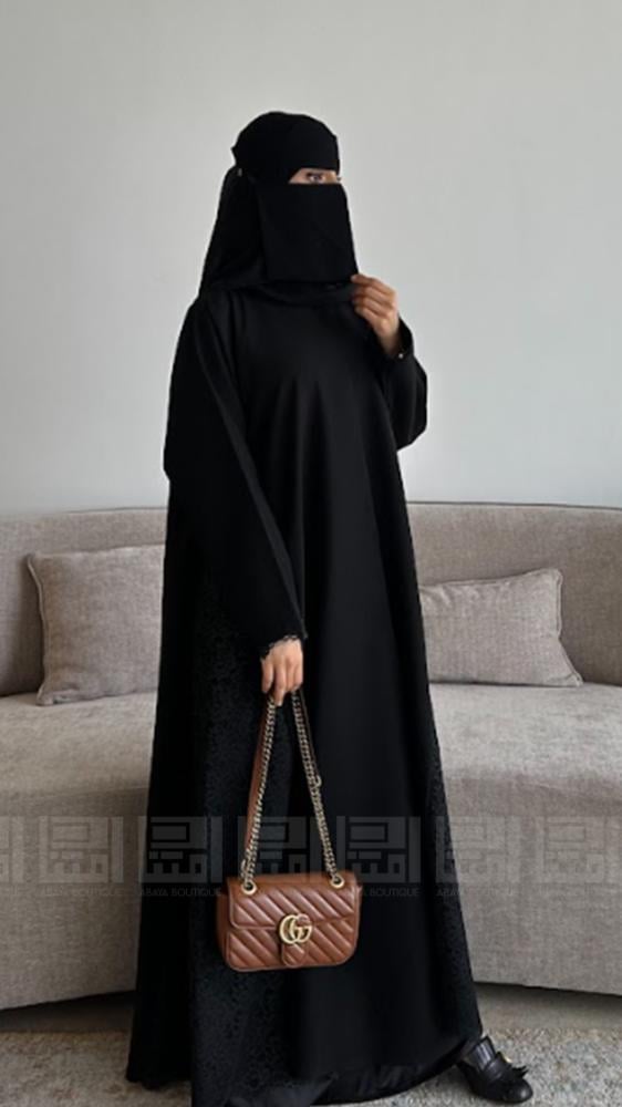 تعتبر عباية سوداء كلوش كامل تزدان بالدانتيل من دار امتنان مثالاً للفخامة والأناقة التي تبحث عنها كل امرأة.