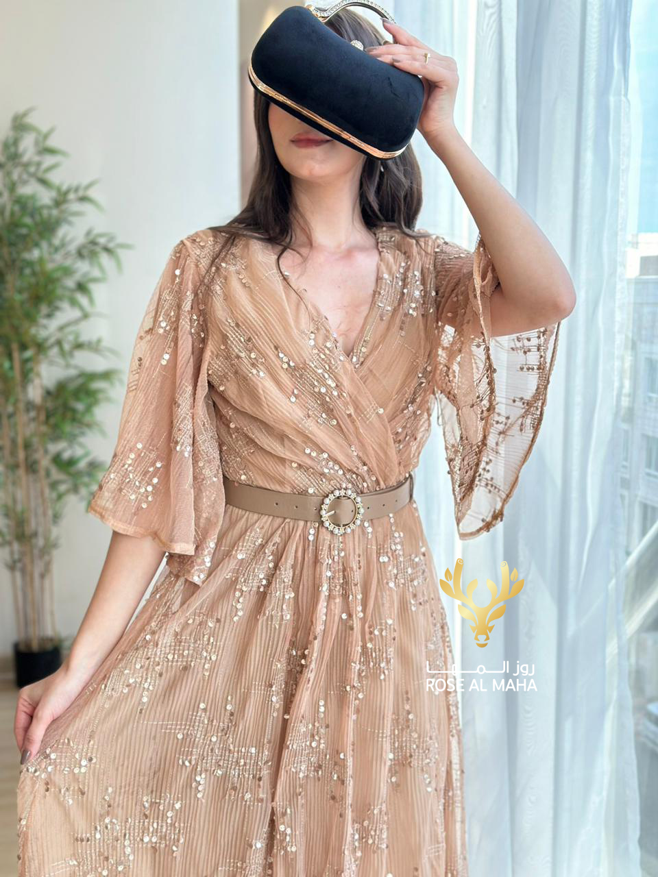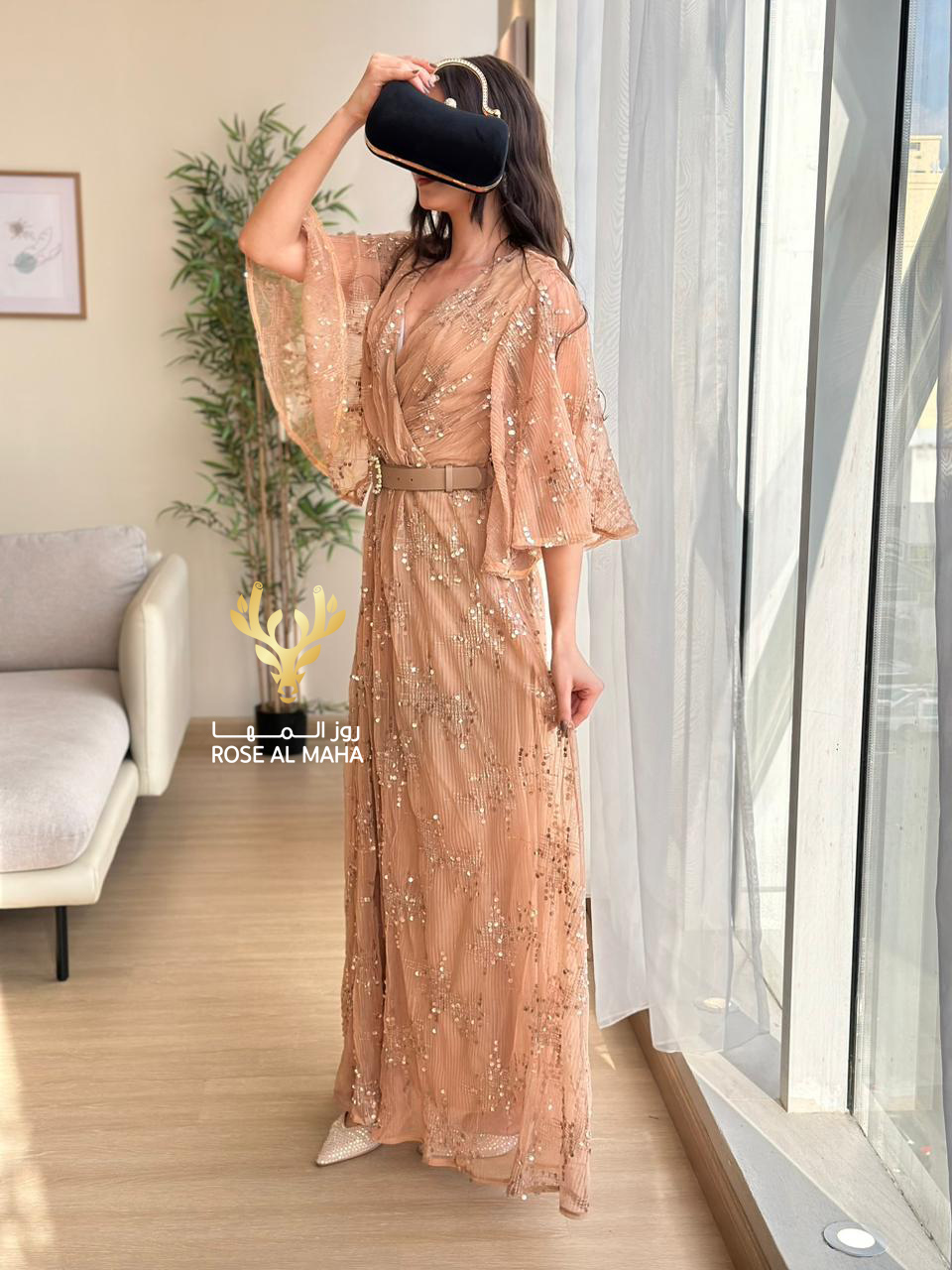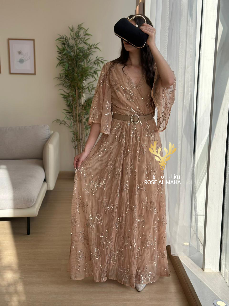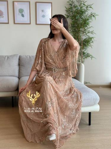 روز المها – فستان بيج مطرز مع حزام