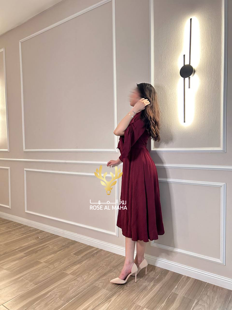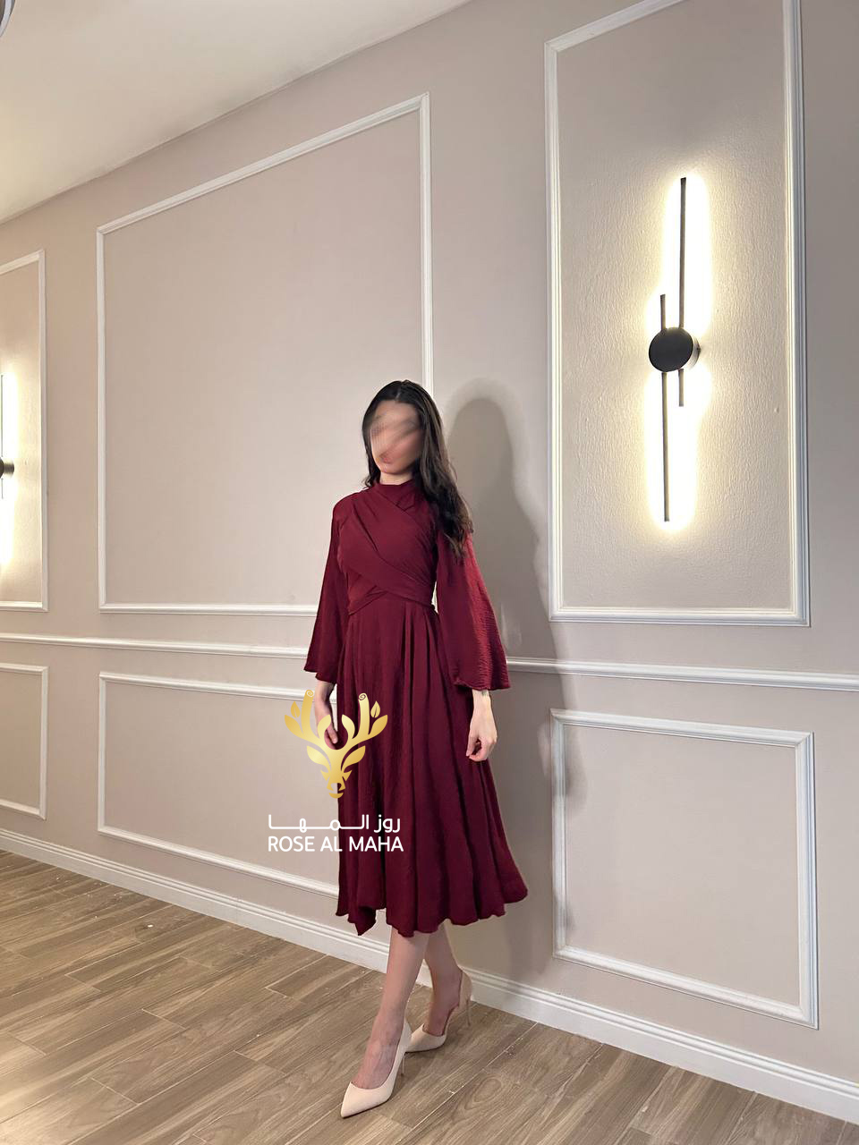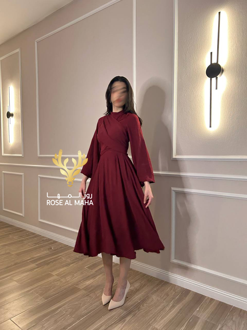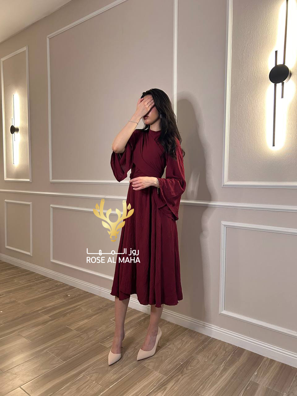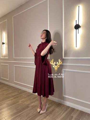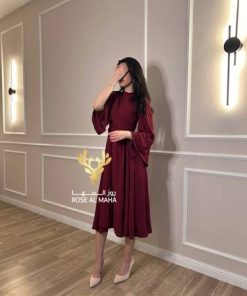 روز المها – فستان عودي ناعم ميدي اكمام طويله مفتوحه