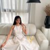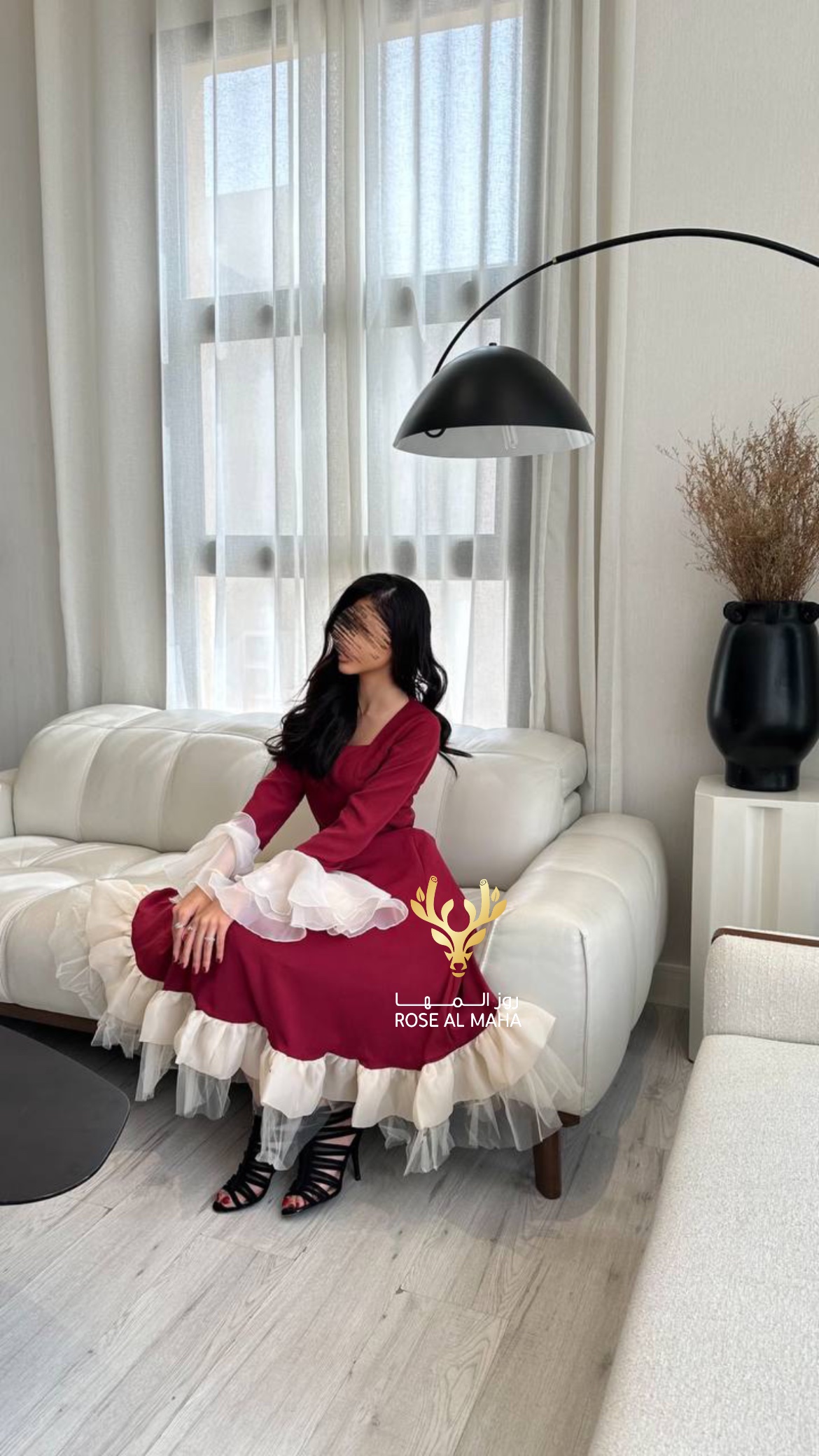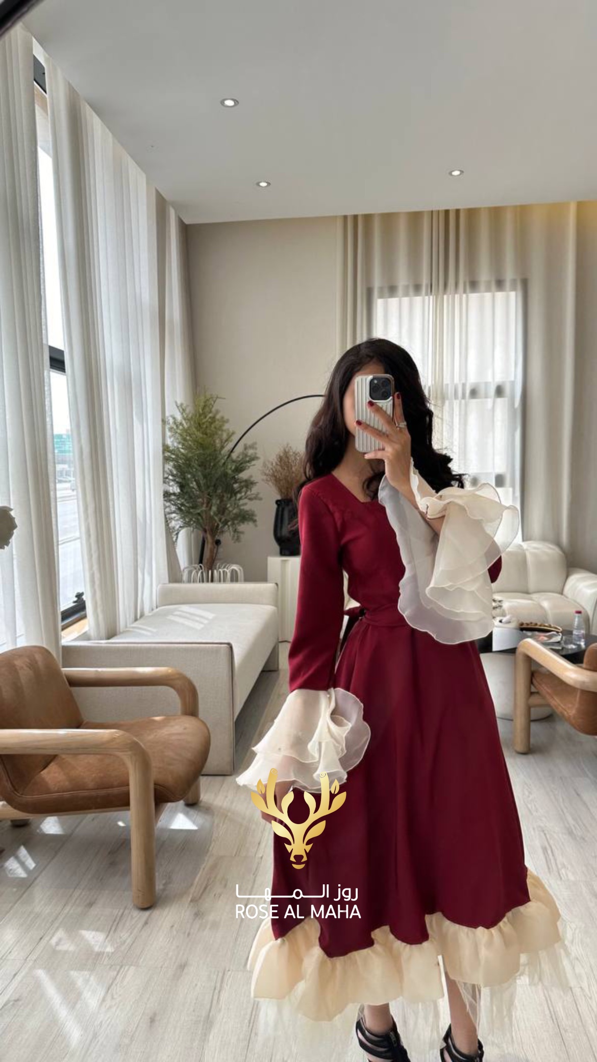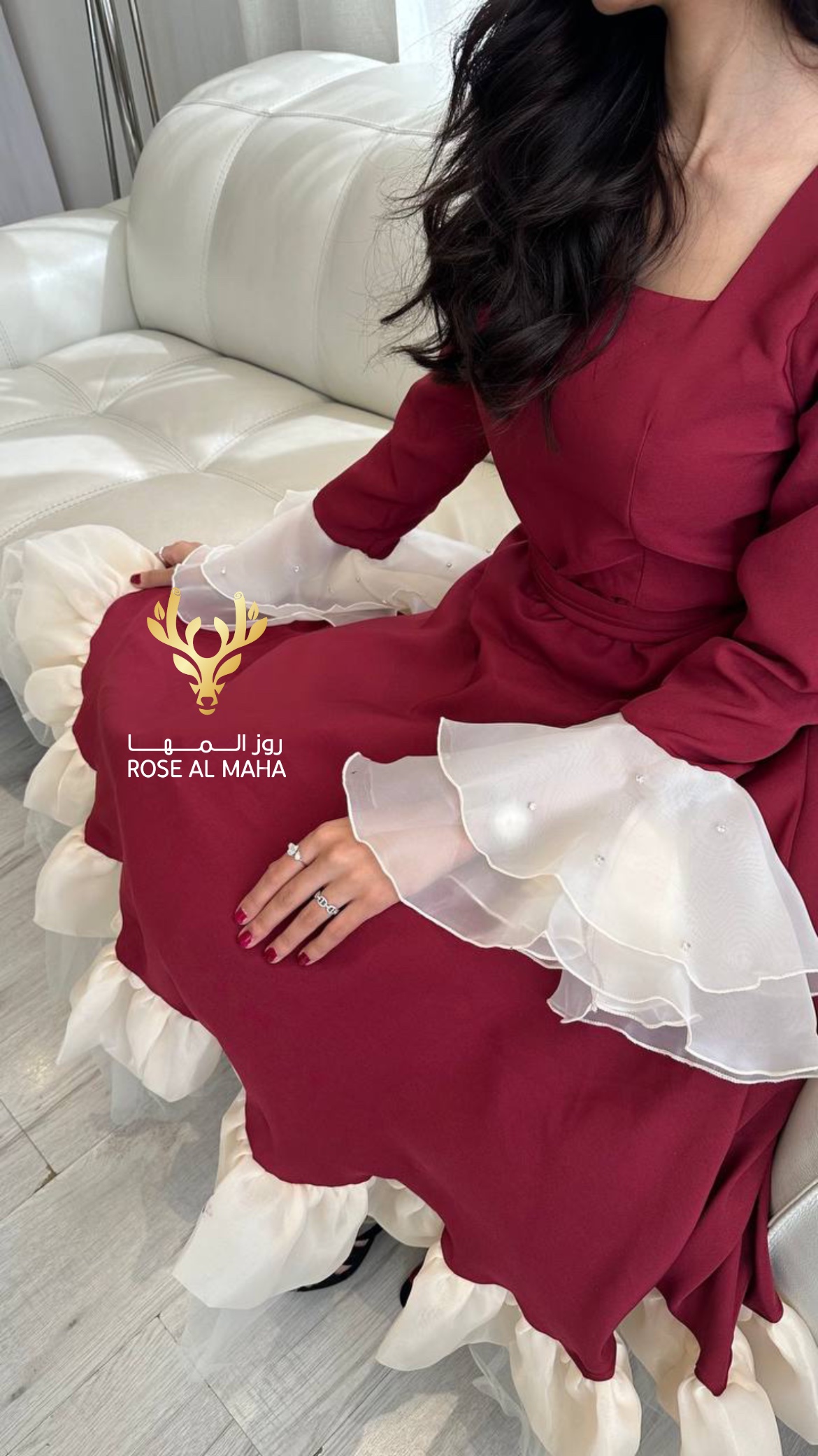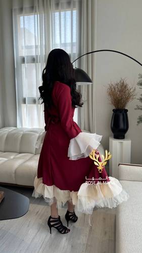 روز المها – فستان ميد عودي بأطراف اورقنزا