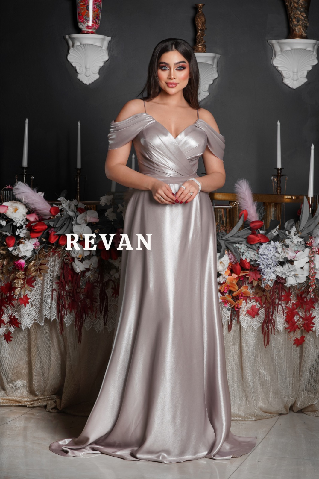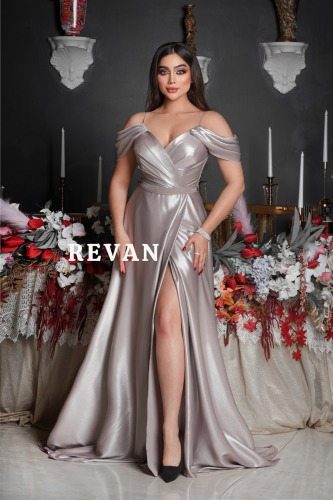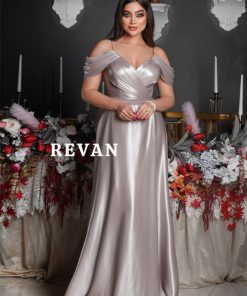 ريفان – فستان فاخر بدون اكتاف مع زهرة جانبية من ريفان