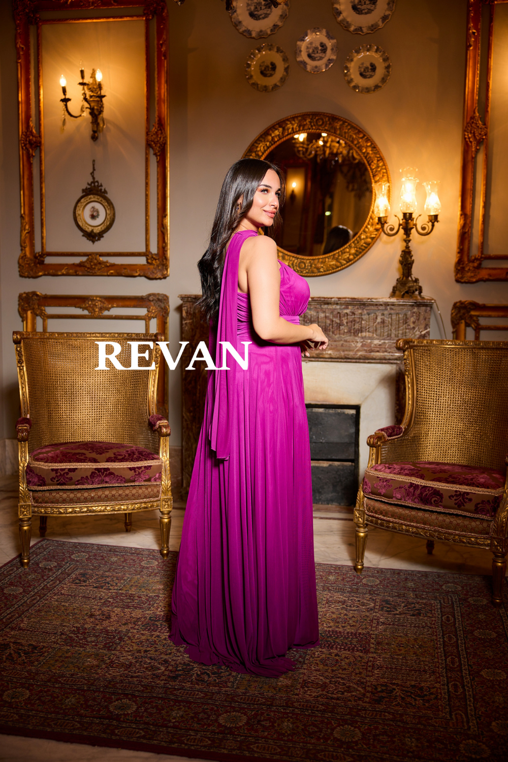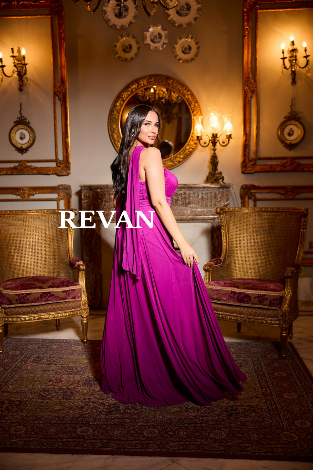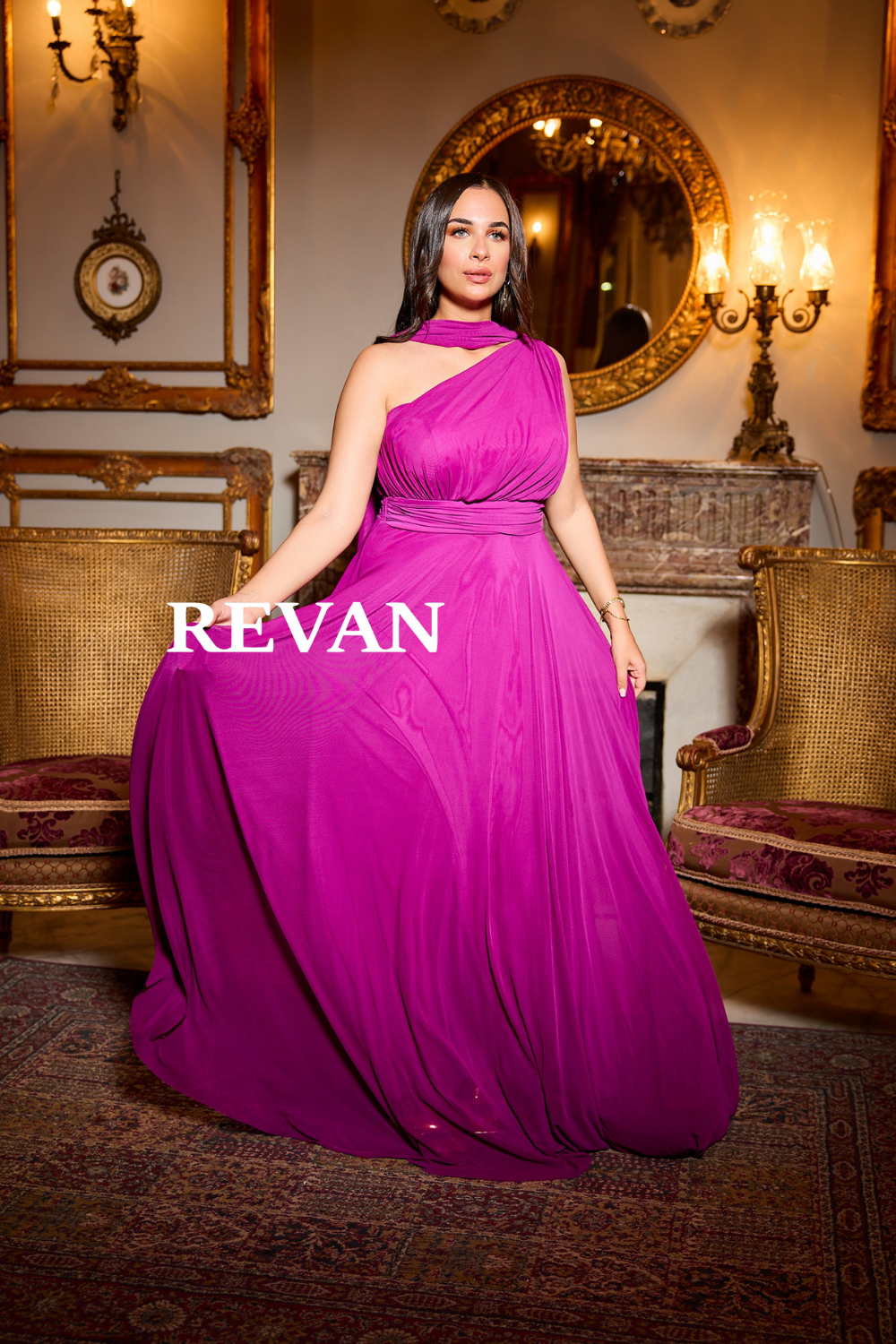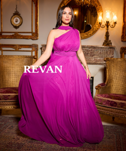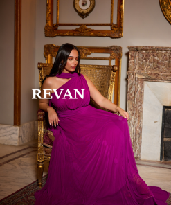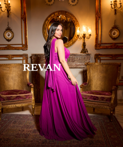 ريفان – فستان سهرة بحمالات عريضة وطيّات ملتفة