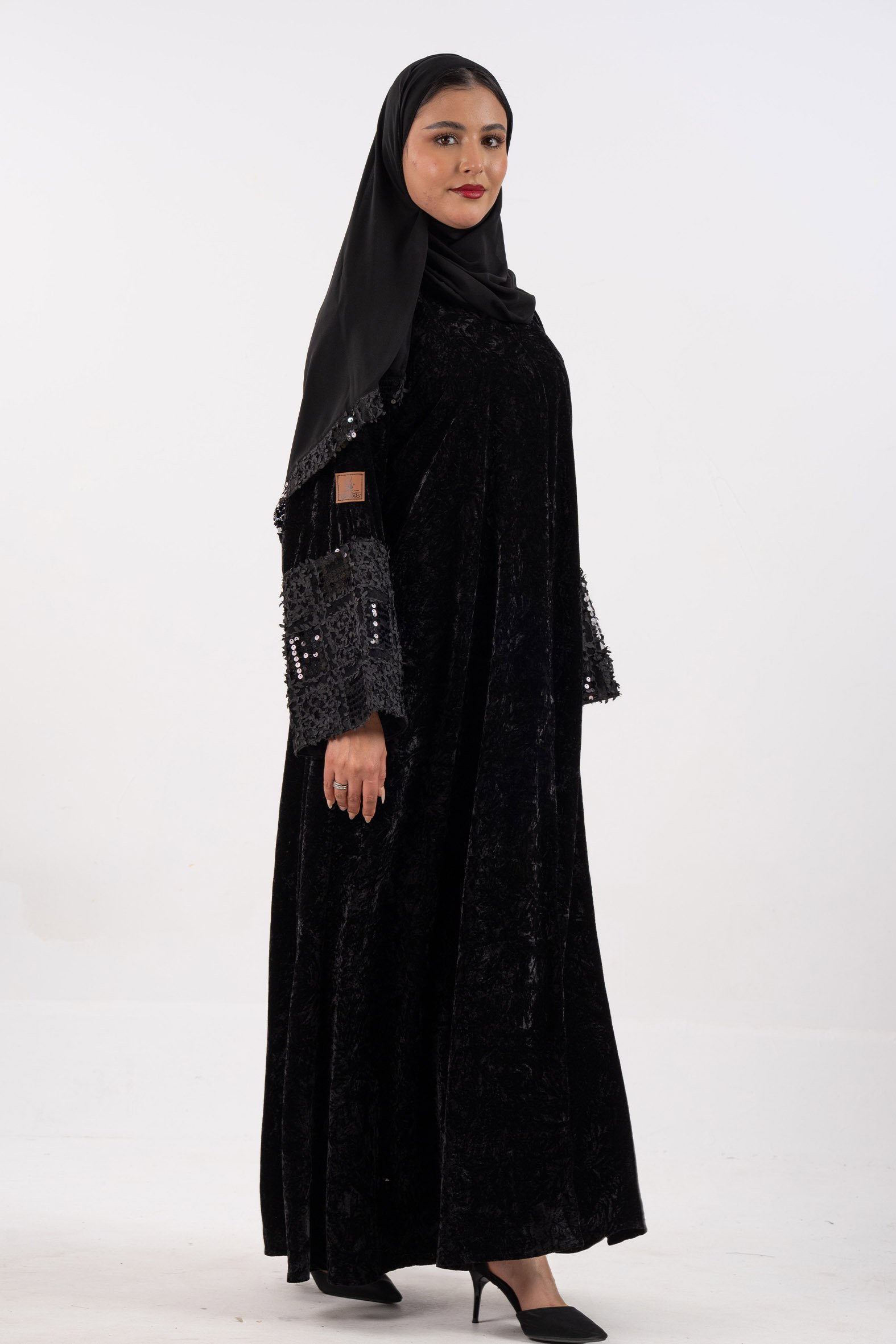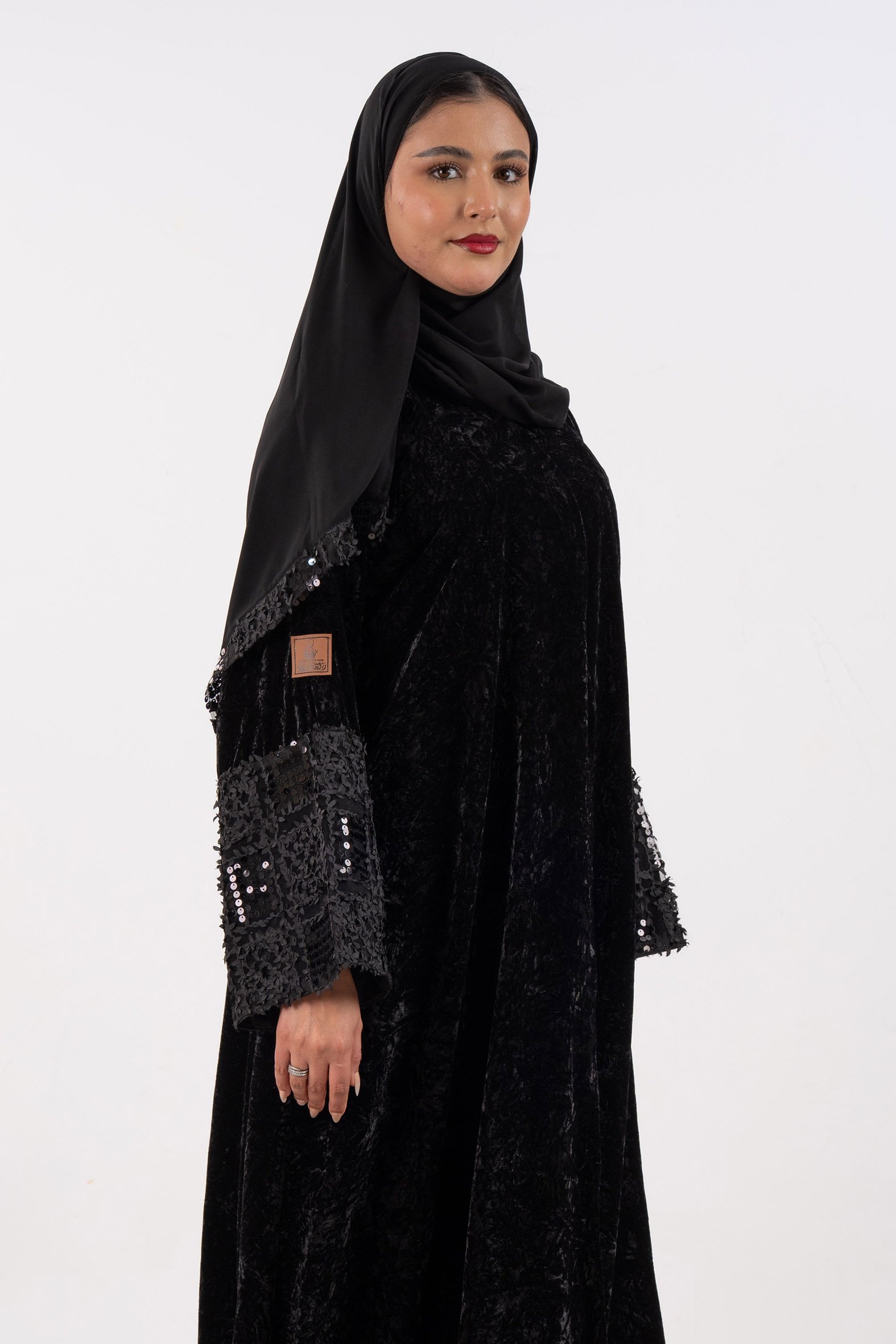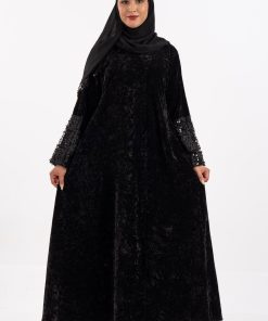 عباية أفنان شتوية منسوجة من قماش المخمل الأسود مع تدخيلات قماش مطرز بورود ناعمة ومرصعة بشك كريستال فاخر على الأكمام صممت لتناسب الاستخدام اليومي والطلعات تصميمها الناعم يضفي لمسة من الجاذبية والرقي مما يجعلها مثالية للإطلالات المميزة صممت بقصه انسيابية العباية ناعمة بالحركة لتلائم كل مناسباتك الشتوية. مع طرحة مجانية وجربي تنسيقها مع فستان عباية