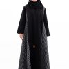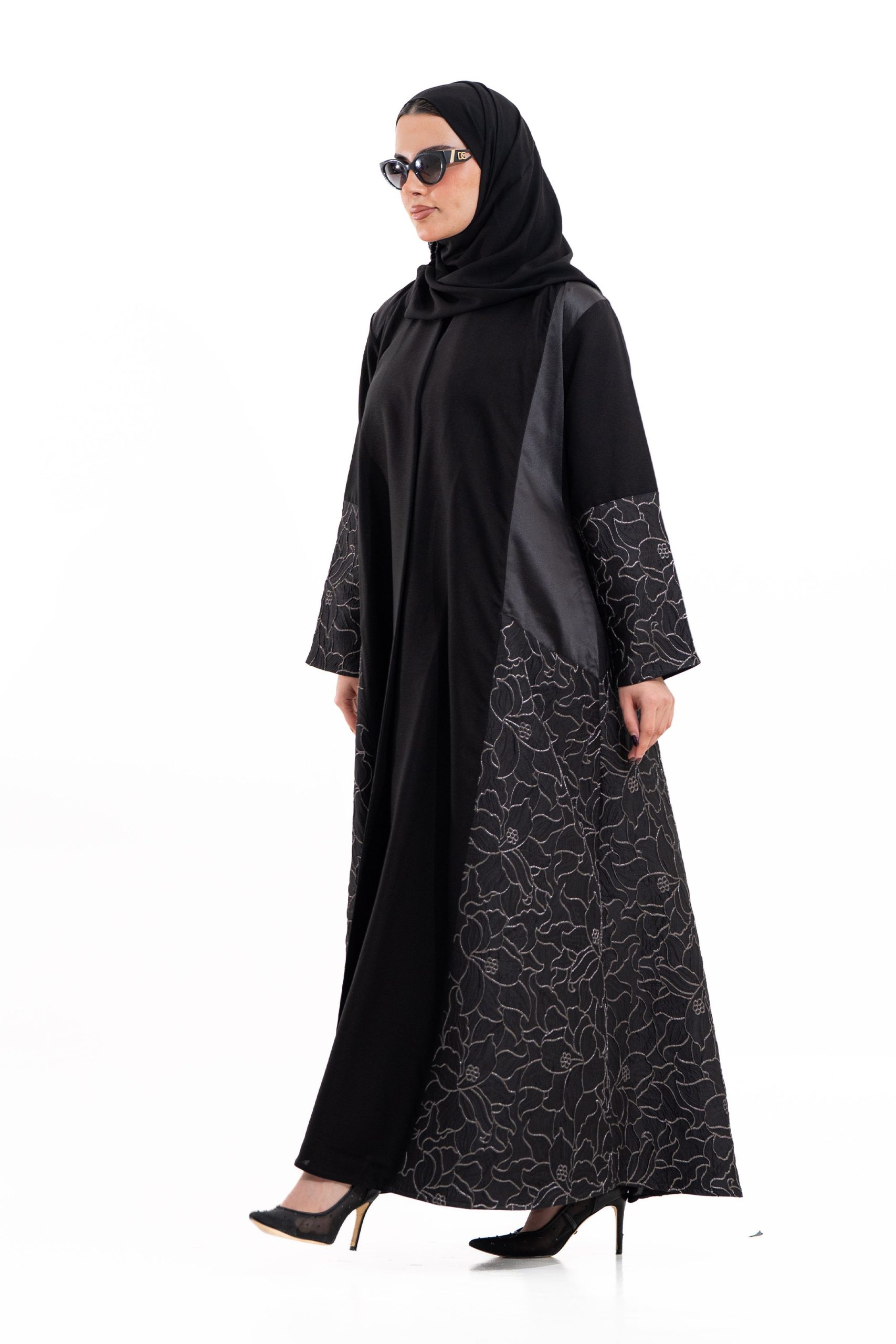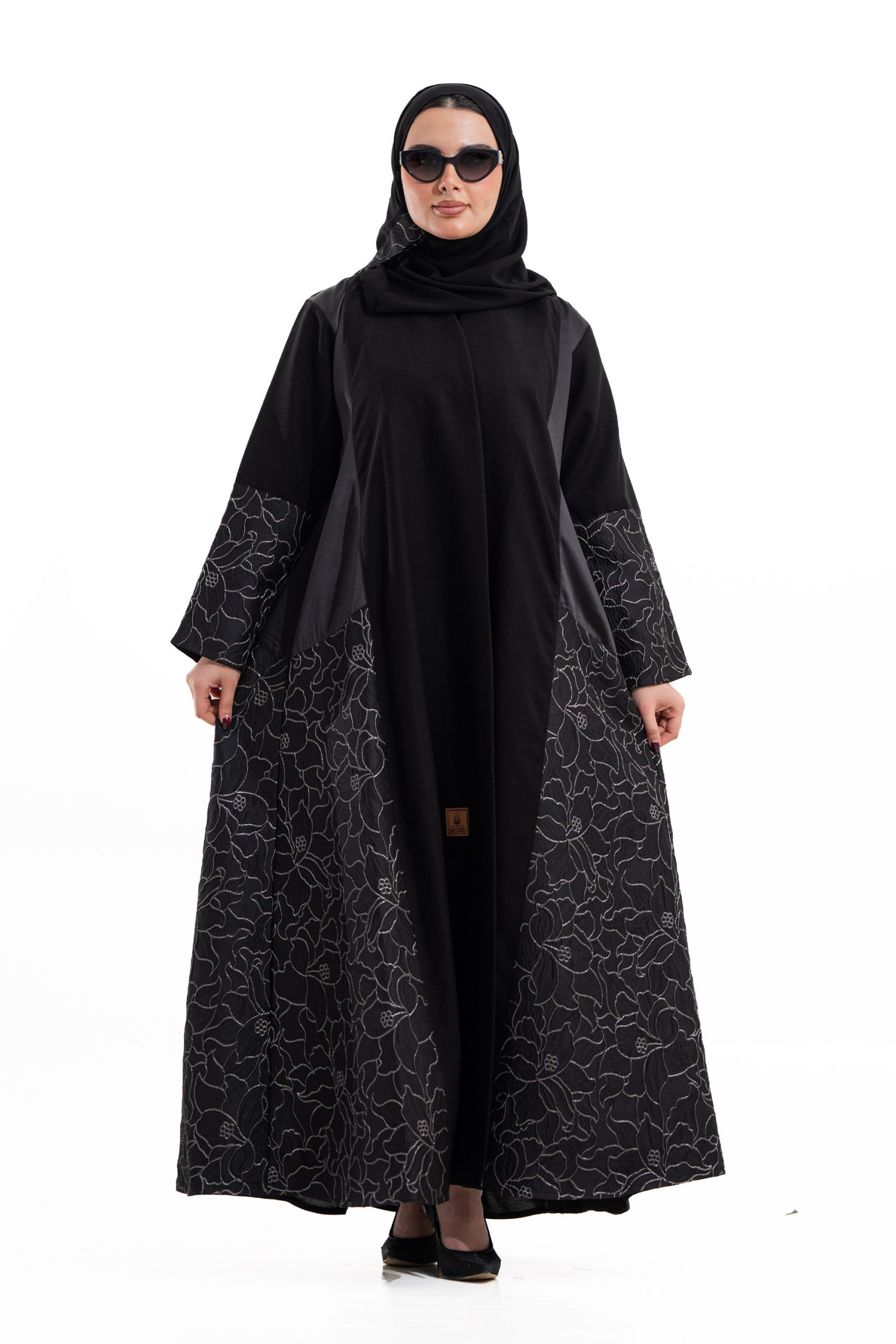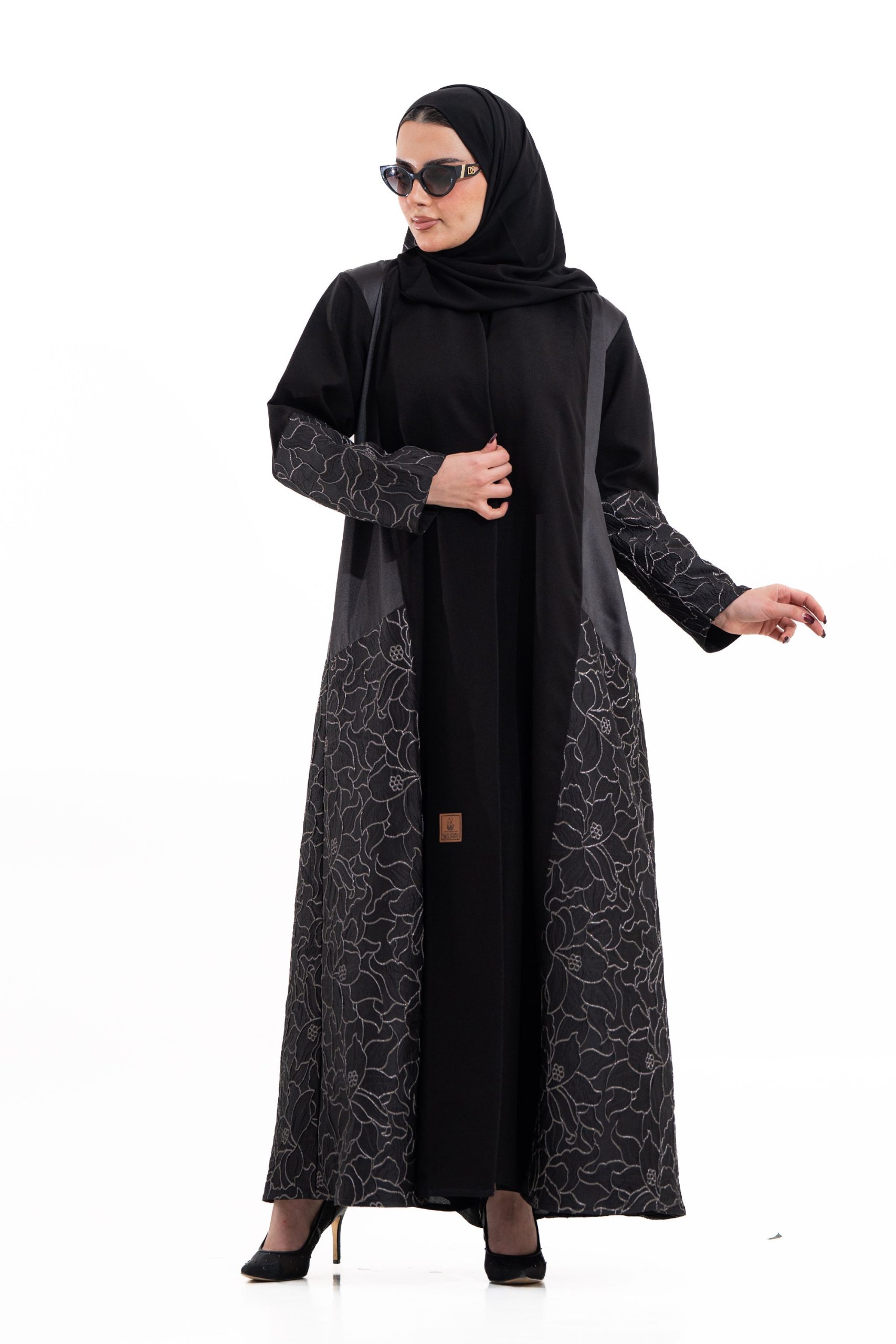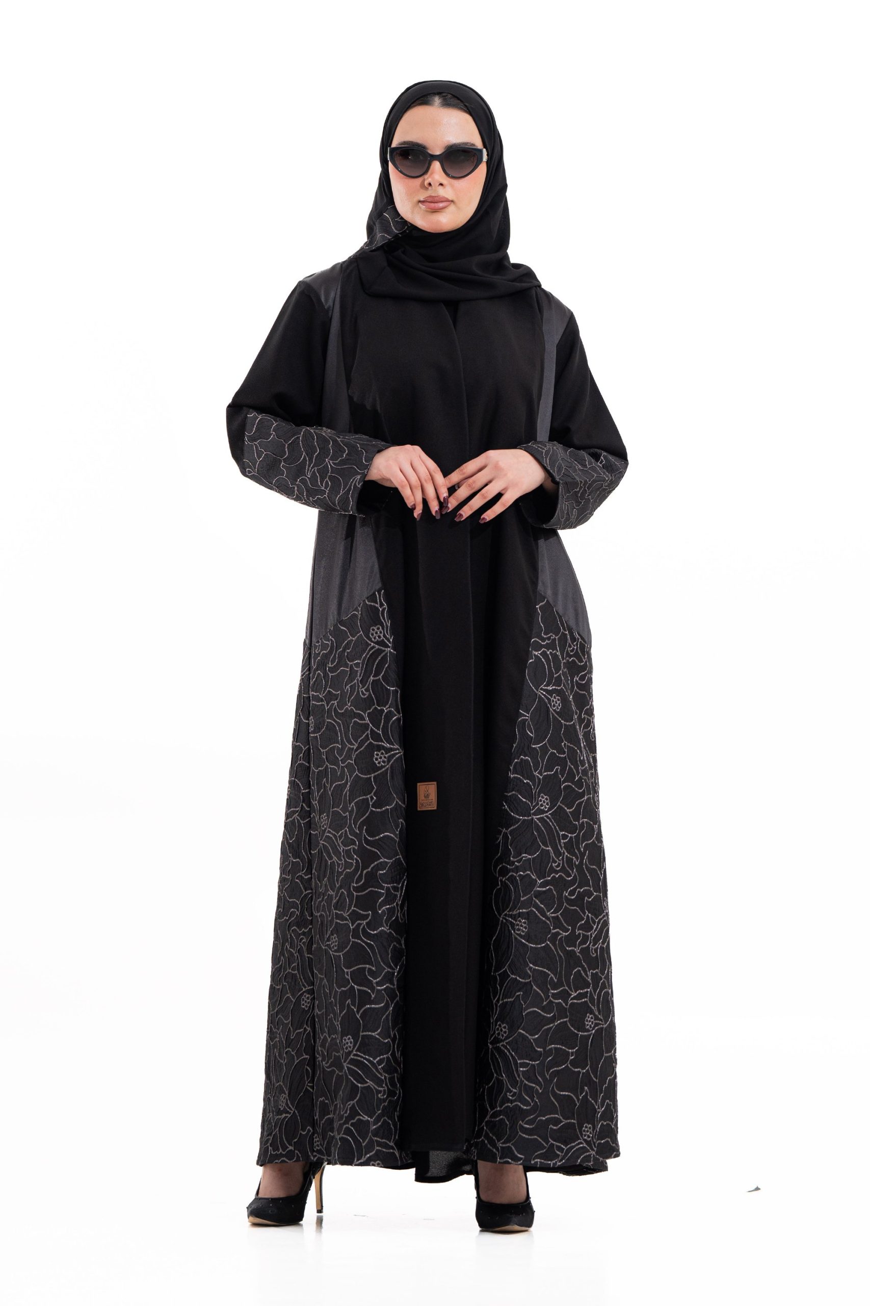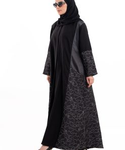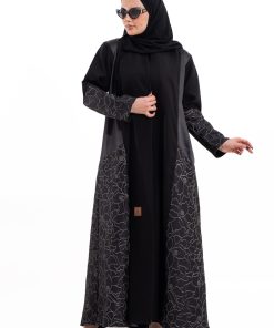 عباية أنيقة بتصميم عصري مصنوعة من قماش أسود فاخر ناعم الملمس، مزينة بتدخيلات قماش مطرز بنقوش هندسية راقية ومطعمة بتطريز لامع يضفي فخامة هادئة على الأكمام وواجهة العباية. تصميمها الانسيابي يمنحك راحة في الحركة وأناقة متوازنة، لتكون خيارًا مثاليًا للاستخدام اليومي والطلعات الرسمية بأسلوب راقٍ وعصري. تأتي مع تنسيق أنيق يسهل اعتماده لمختلف الإطلالات.