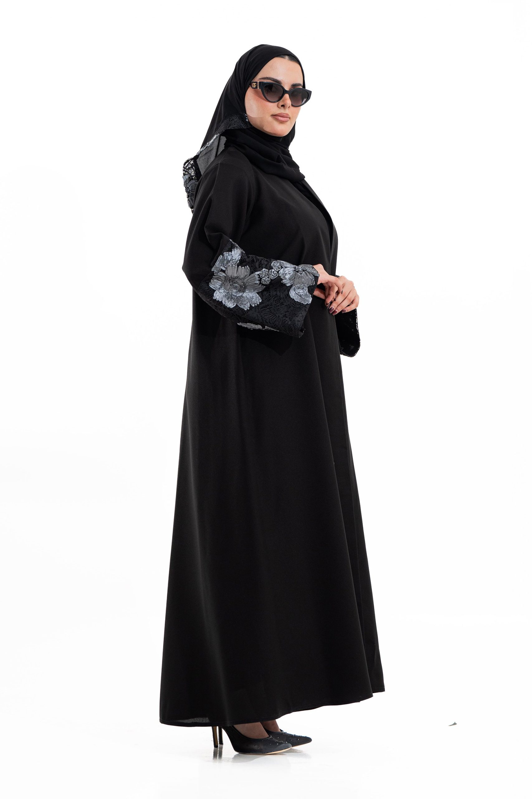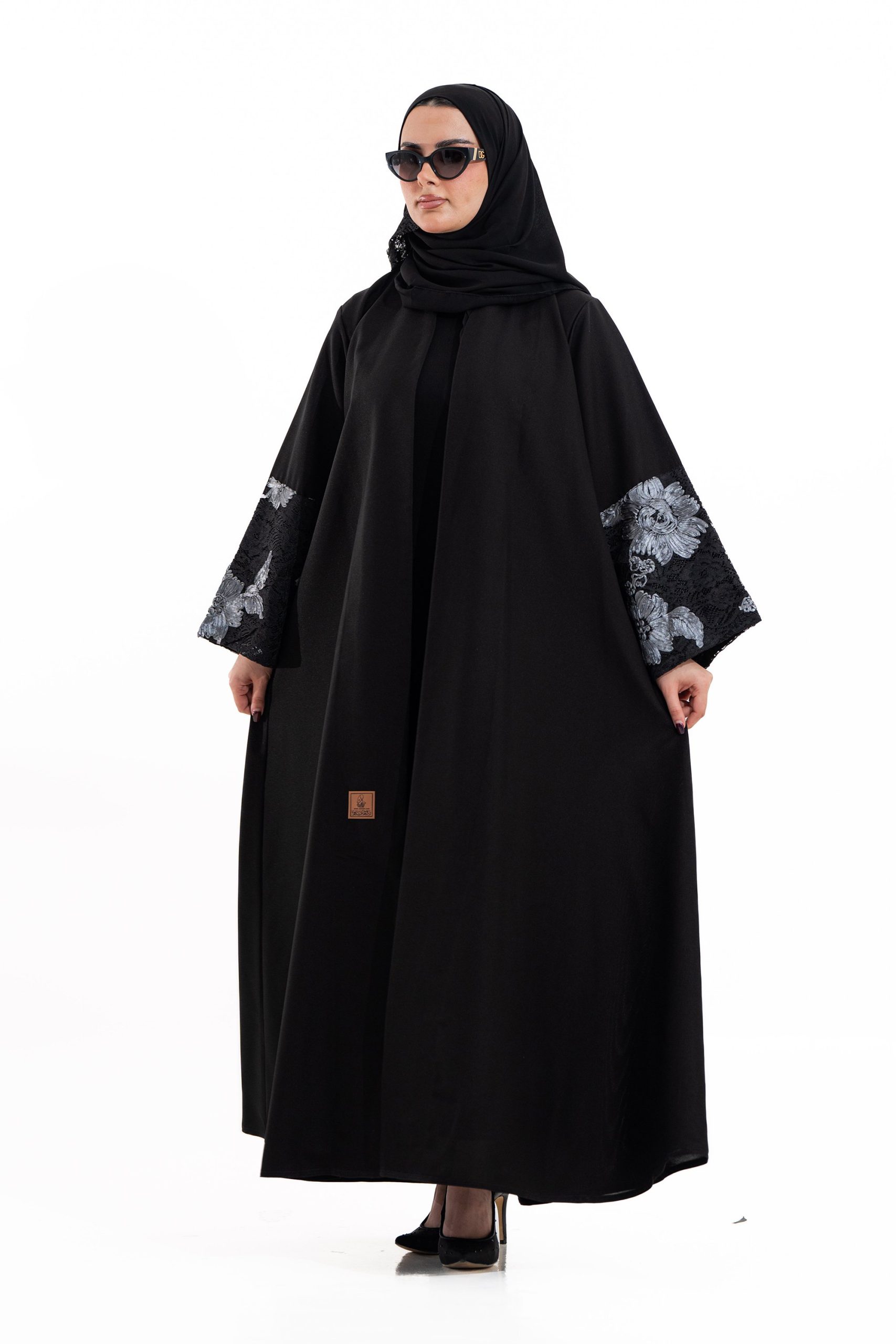 عباية أنيقة بتصميم عصري مصنوعة من قماش أسود فاخر ناعم الملمس، مزينة بتدخيلات قماش مطرز بنقوش هندسية راقية ومطعمة بتطريز لامع يضفي فخامة هادئة على الأكمام وواجهة العباية. تصميمها الانسيابي يمنحك راحة في الحركة وأناقة متوازنة، لتكون خيارًا مثاليًا للاستخدام اليومي والطلعات الرسمية بأسلوب راقٍ وعصري. تأتي مع تنسيق أنيق يسهل اعتماده لمختلف الإطلالات.