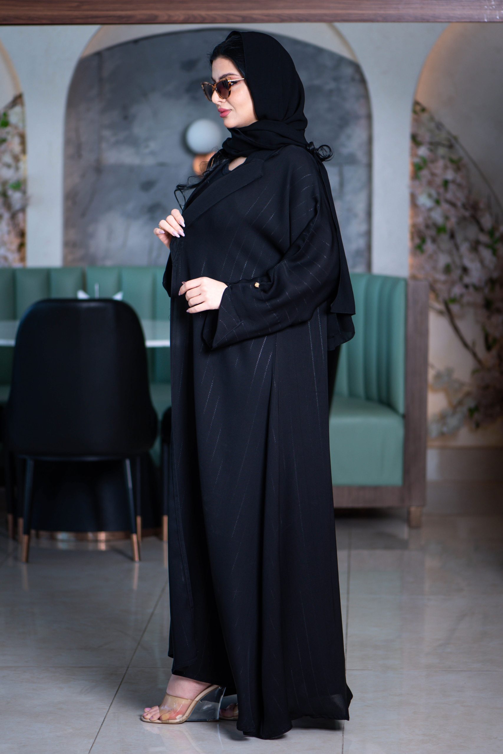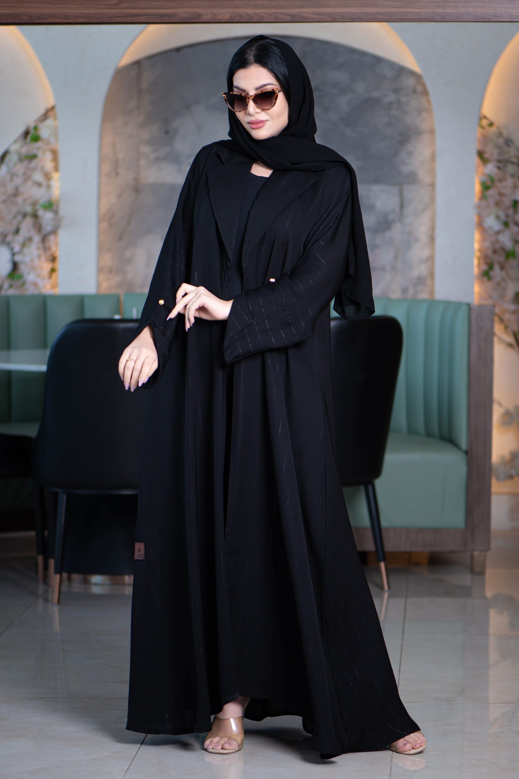 زاهية – عباية بياقة مع قصة كم مائلة بقماش مقلم وناعم