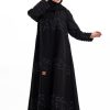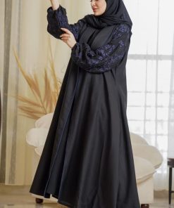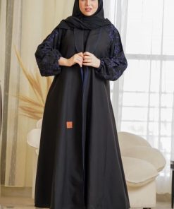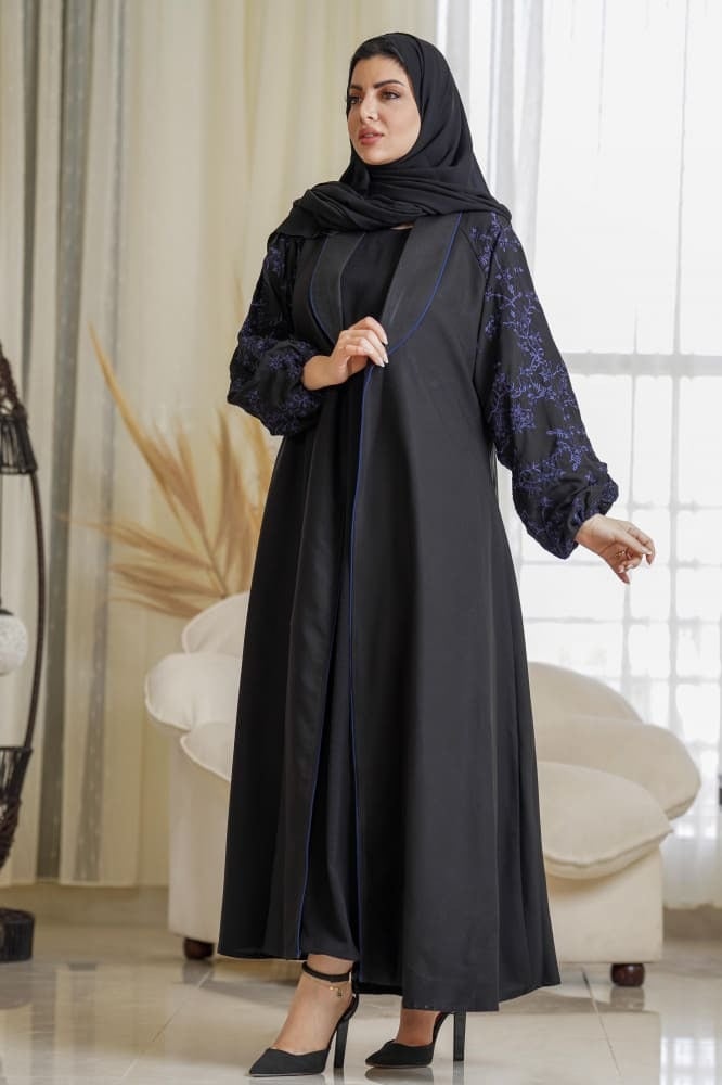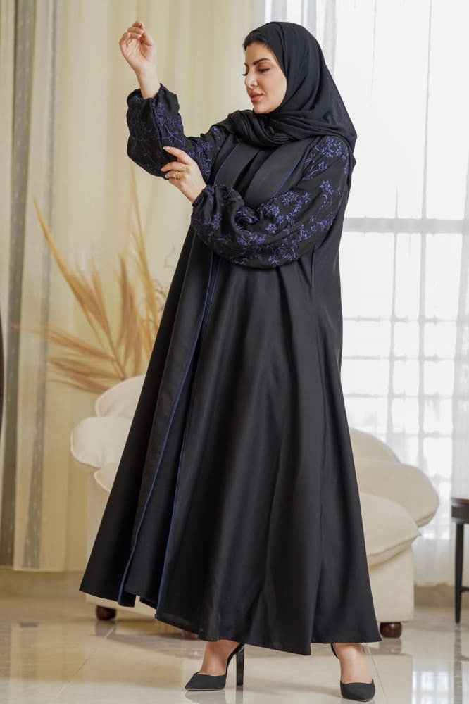 اكتشفي سحر الأناقة مع عباية سوداء مطرزة ب اللون الكحلي الجذاب .