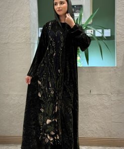 عباية شتوية منسوجة من قماش الشامواه الاسود مع تدخيلات قماش مطرز بورود ناعمة ومرصعة بشك كريستال فاخر على الأكمام وامام العباية. صممت لتناسب الاستخدام اليومي والطلعات تصميمها الناعم يضفي لمسة من الجاذبية والرقي مما يجعلها مثالية للإطلالات المميزة صممت بقصه انسيابية العباية ناعمة بالحركة لتلائم كل مناسباتك الشتوية. مع طرحة مجانية وجربي تنسيقها مع فستان عباية