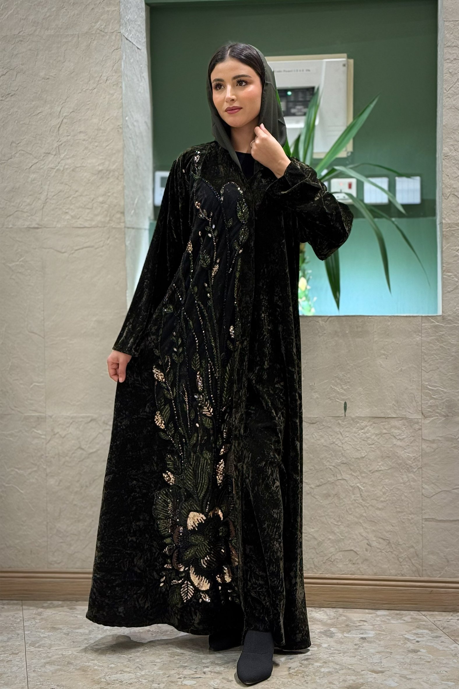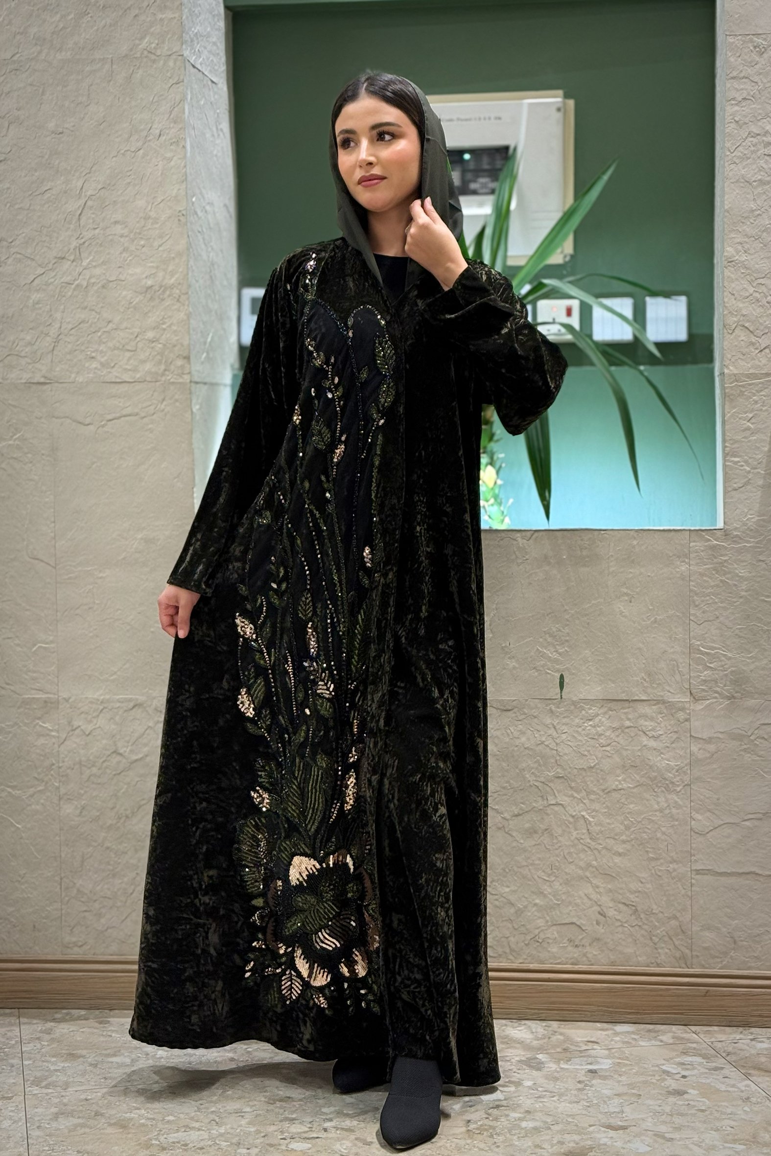 زاهية – عباية دلال مخمل زيتي داكن بتطريز شك