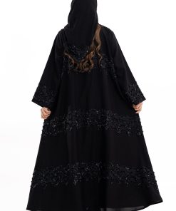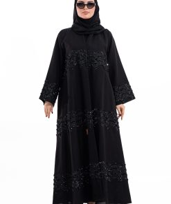 عباية أنيقة بتصميم عصري مصنوعة من قماش أسود فاخر ناعم الملمس، مزينة بتدخيلات قماش مطرز بنقوش هندسية راقية ومطعمة بتطريز لامع يضفي فخامة هادئة على الأكمام وواجهة العباية. تصميمها الانسيابي يمنحك راحة في الحركة وأناقة متوازنة، لتكون خيارًا مثاليًا للاستخدام اليومي والطلعات الرسمية بأسلوب راقٍ وعصري. تأتي مع تنسيق أنيق يسهل اعتماده لمختلف الإطلالات.