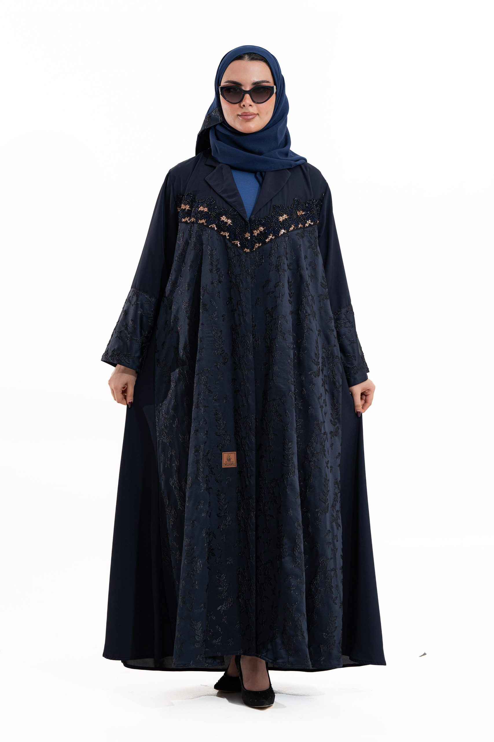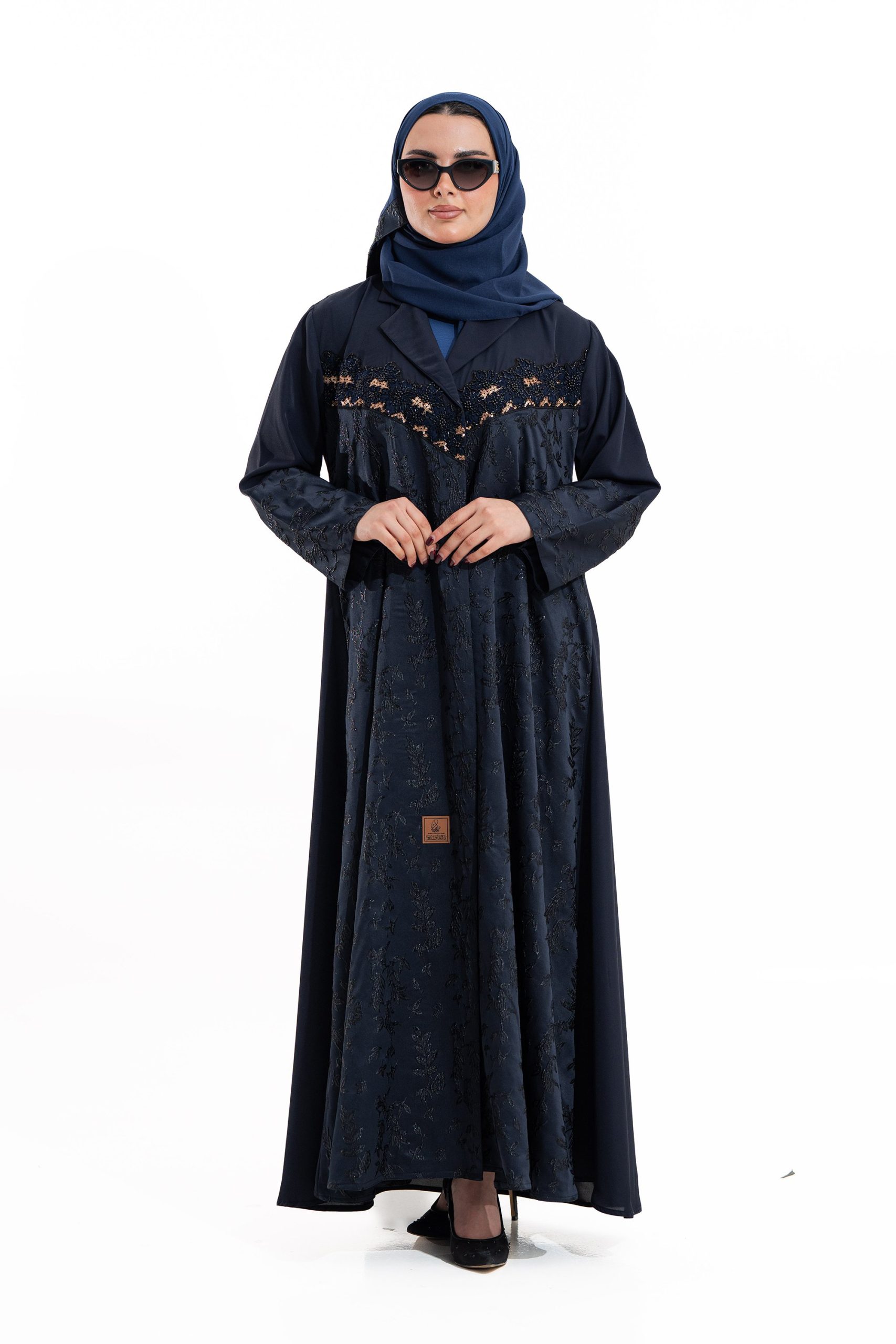 عباية أنيقة بتصميم عصري مصنوعة من قماش أسود فاخر ناعم الملمس، مزينة بتدخيلات قماش مطرز بنقوش هندسية راقية ومطعمة بتطريز لامع يضفي فخامة هادئة على الأكمام وواجهة العباية. تصميمها الانسيابي يمنحك راحة في الحركة وأناقة متوازنة، لتكون خيارًا مثاليًا للاستخدام اليومي والطلعات الرسمية بأسلوب راقٍ وعصري. تأتي مع تنسيق أنيق يسهل اعتماده لمختلف الإطلالات.
