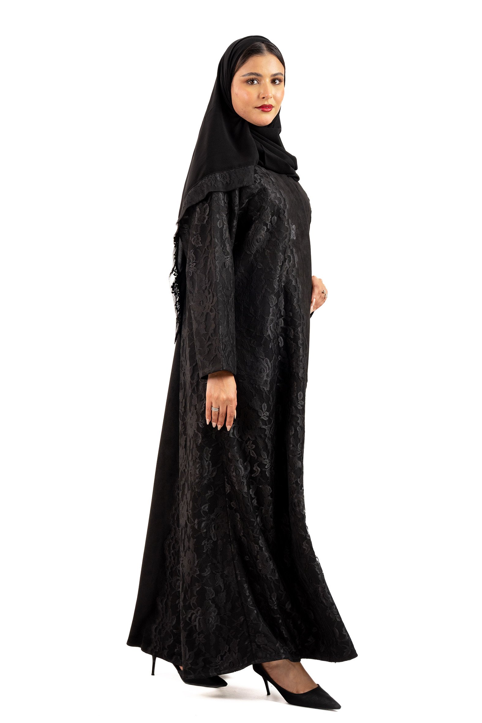 عباية ظلال شتوية منسوجة من قماش الشامواه الأسود مع تدخيلات دانتيل اندنوسبي على الأكمام والجوانب صممت لتناسب الاستخدام اليومي والطلعات تصميمها الناعم يضفي لمسة من الجاذبية والرقي مما يجعلها مثالية للإطلالات المميزة صممت بقصه انسيابية العباية ناعمة بالحركة لتلائم كل مناسباتك الشتوية. مع طرحة مجانية وجربي تنسيقها مع فستان عباية