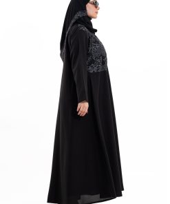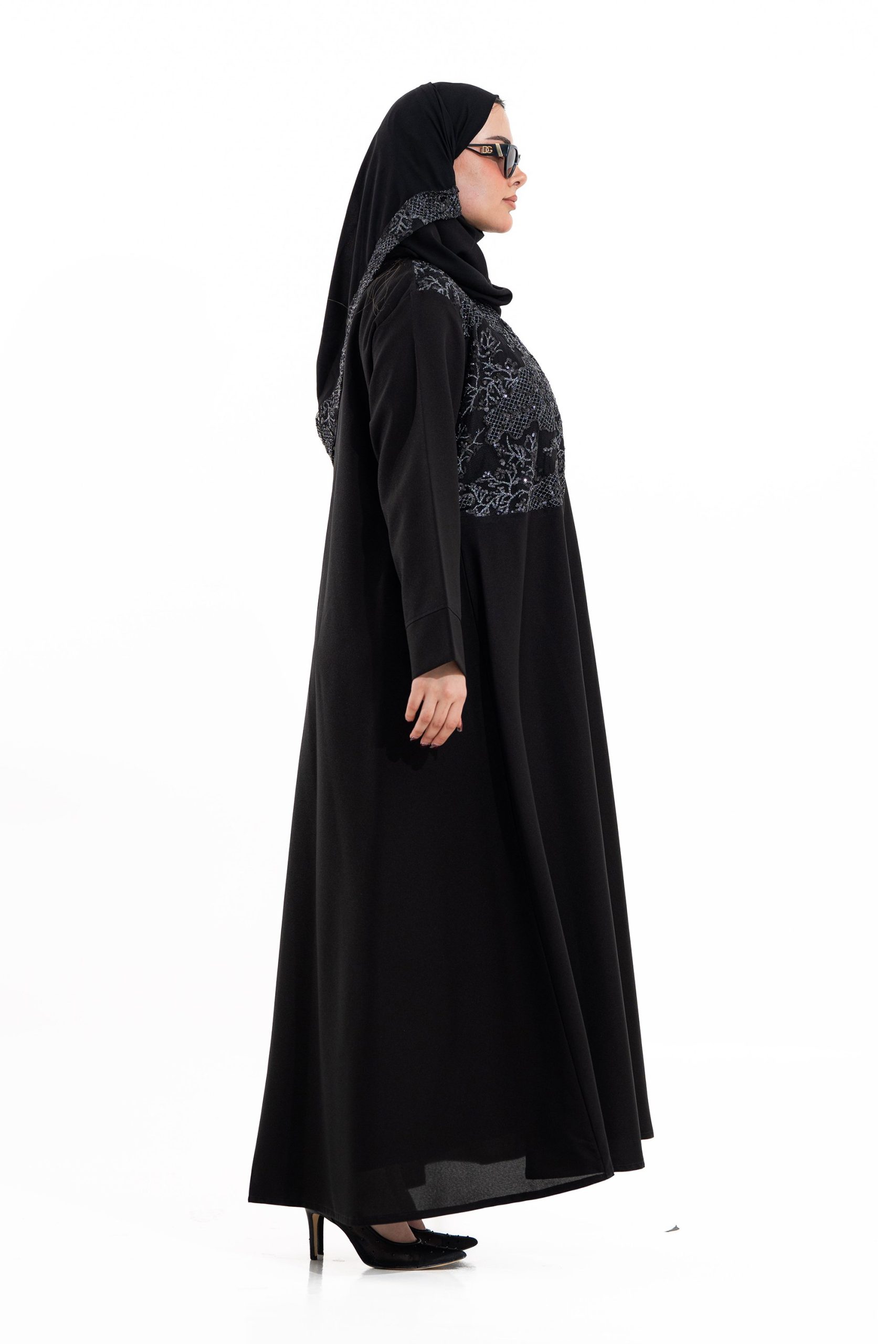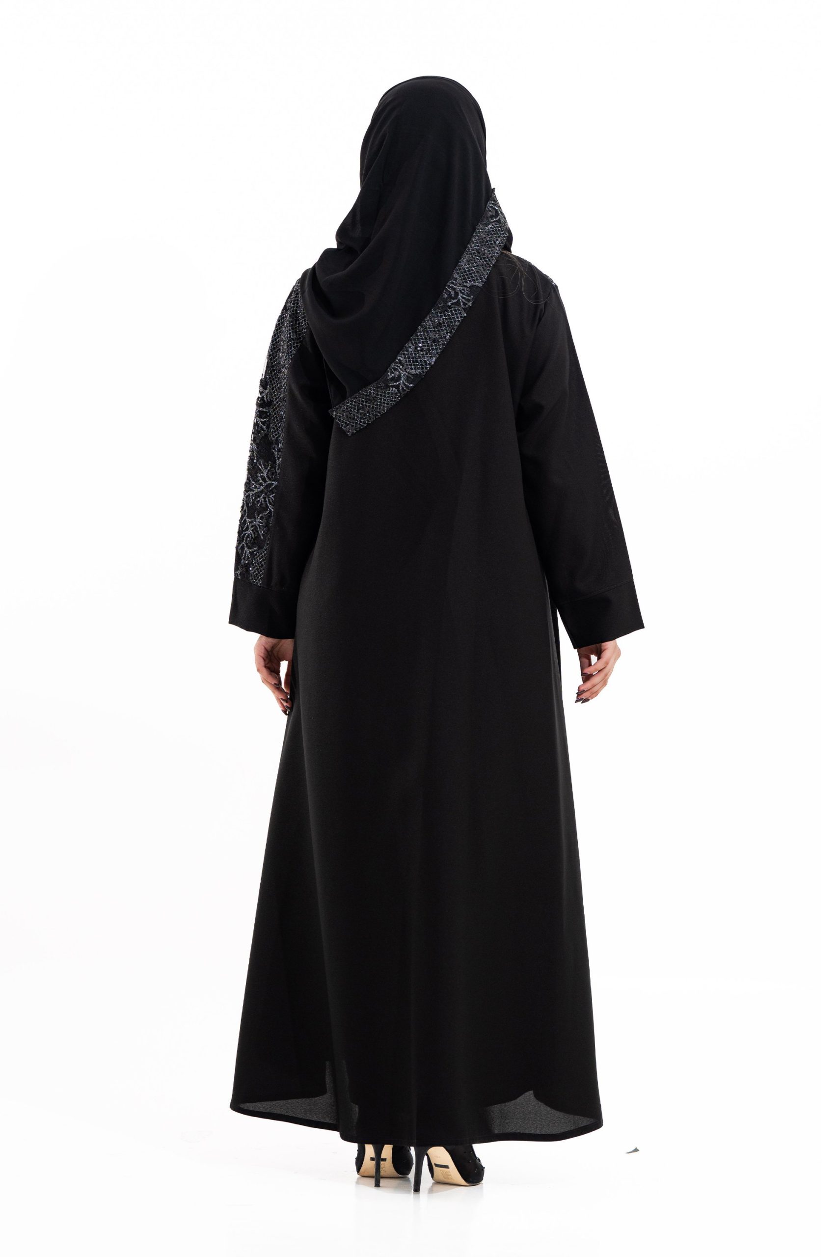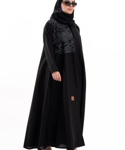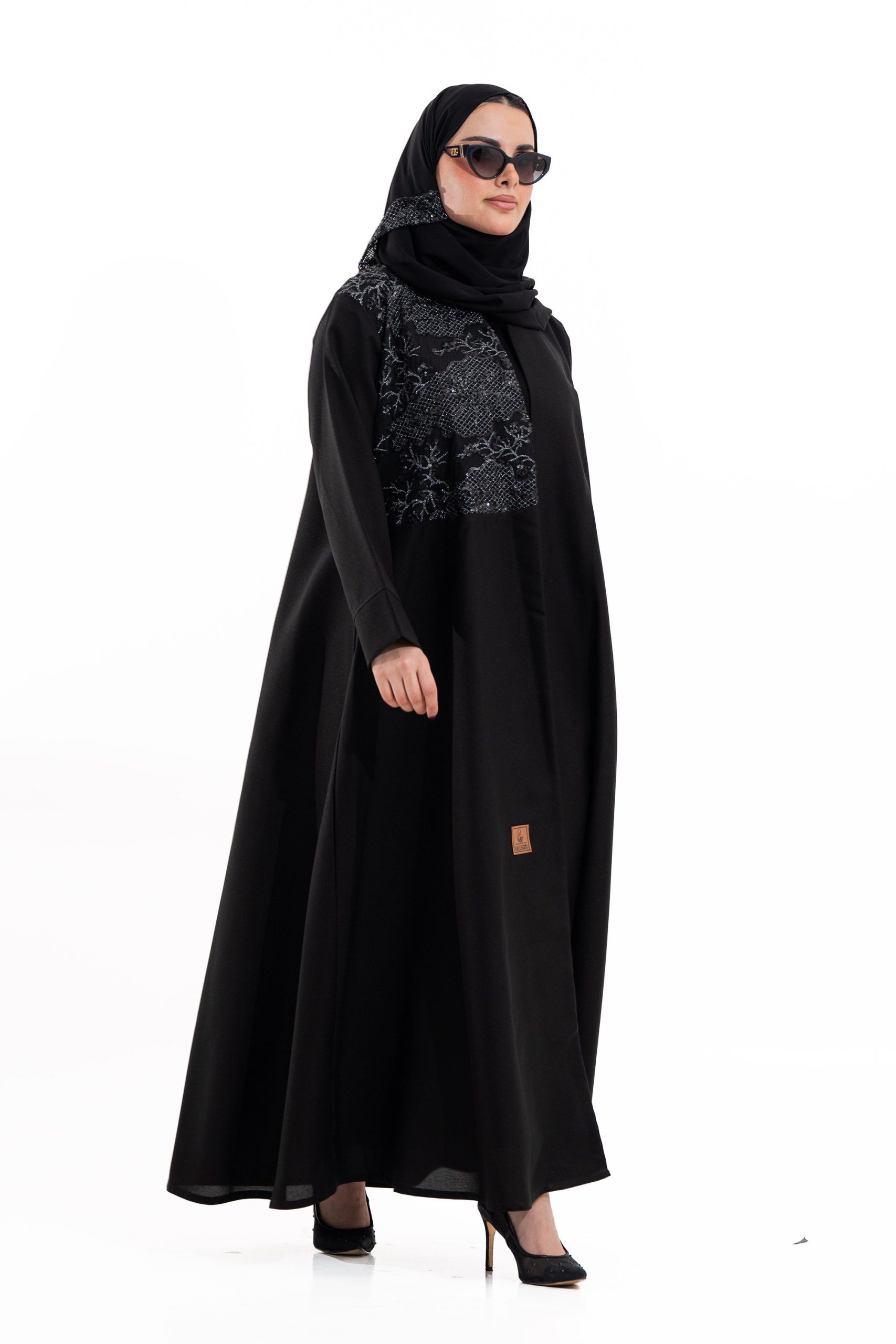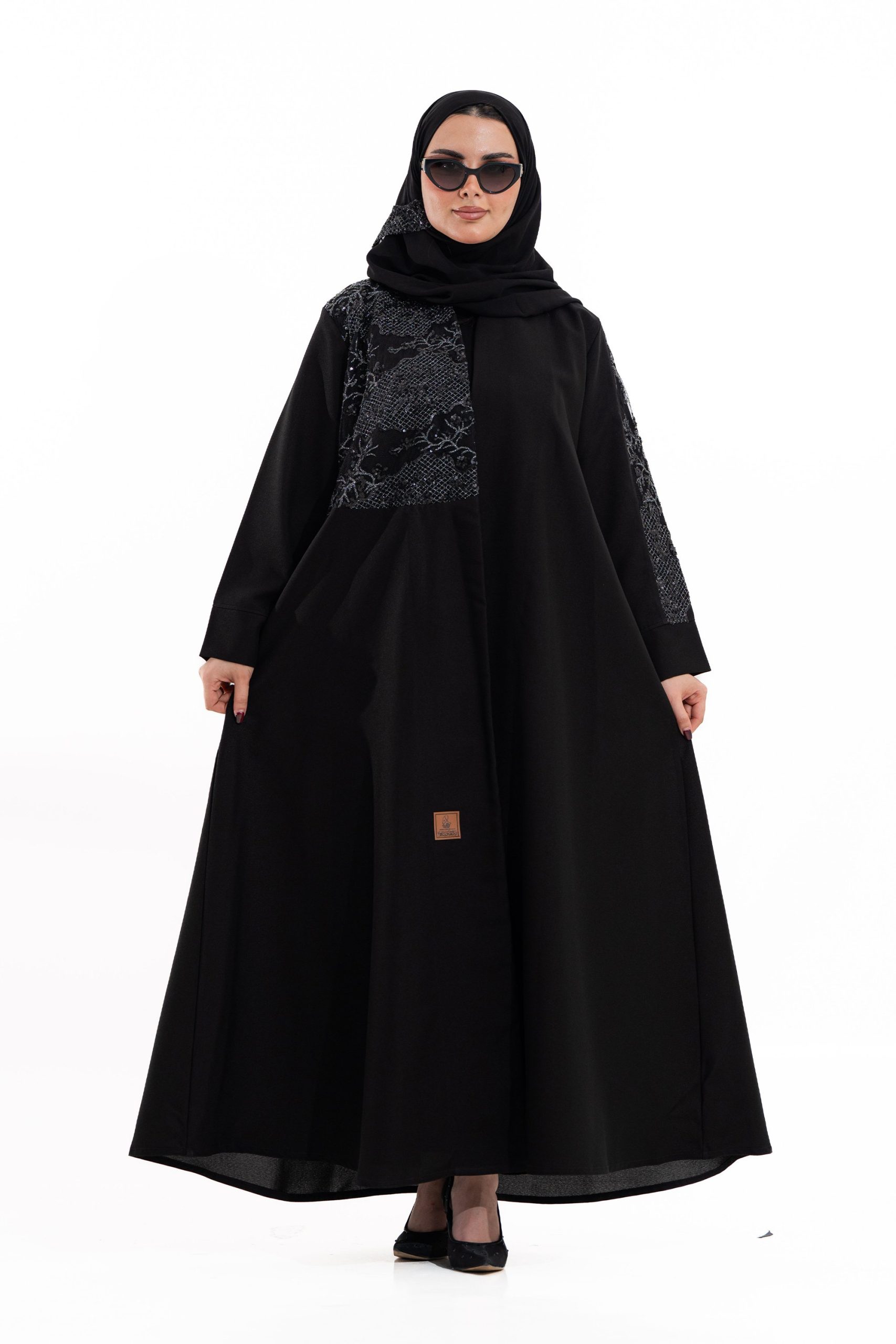 عباية أنيقة بتصميم عصري مصنوعة من قماش أسود فاخر ناعم الملمس، مزينة بتدخيلات قماش مطرز بنقوش راقية ومطعمة بتطريز لامع يضفي فخامة هادئة على الأكمام وواجهة العباية. تصميمها الانسيابي يمنحك راحة في الحركة وأناقة متوازنة، لتكون خيارًا مثاليًا للاستخدام اليومي والطلعات الرسمية بأسلوب راقٍ وعصري. تأتي مع تنسيق أنيق يسهل اعتماده لمختلف الإطلالات.