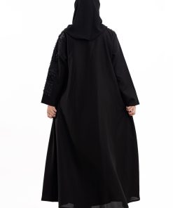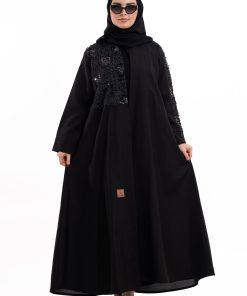 عباية أنيقة بتصميم عصري مصنوعة من قماش أسود فاخر ناعم الملمس، مزينة بتدخيلات قماش مطرز بنقوش هندسية راقية ومطعمة بتطريز لامع يضفي فخامة هادئة على الأكمام وواجهة العباية. تصميمها الانسيابي يمنحك راحة في الحركة وأناقة متوازنة، لتكون خيارًا مثاليًا للاستخدام اليومي والطلعات الرسمية بأسلوب راقٍ وعصري. تأتي مع تنسيق أنيق يسهل اعتماده لمختلف الإطلالات.