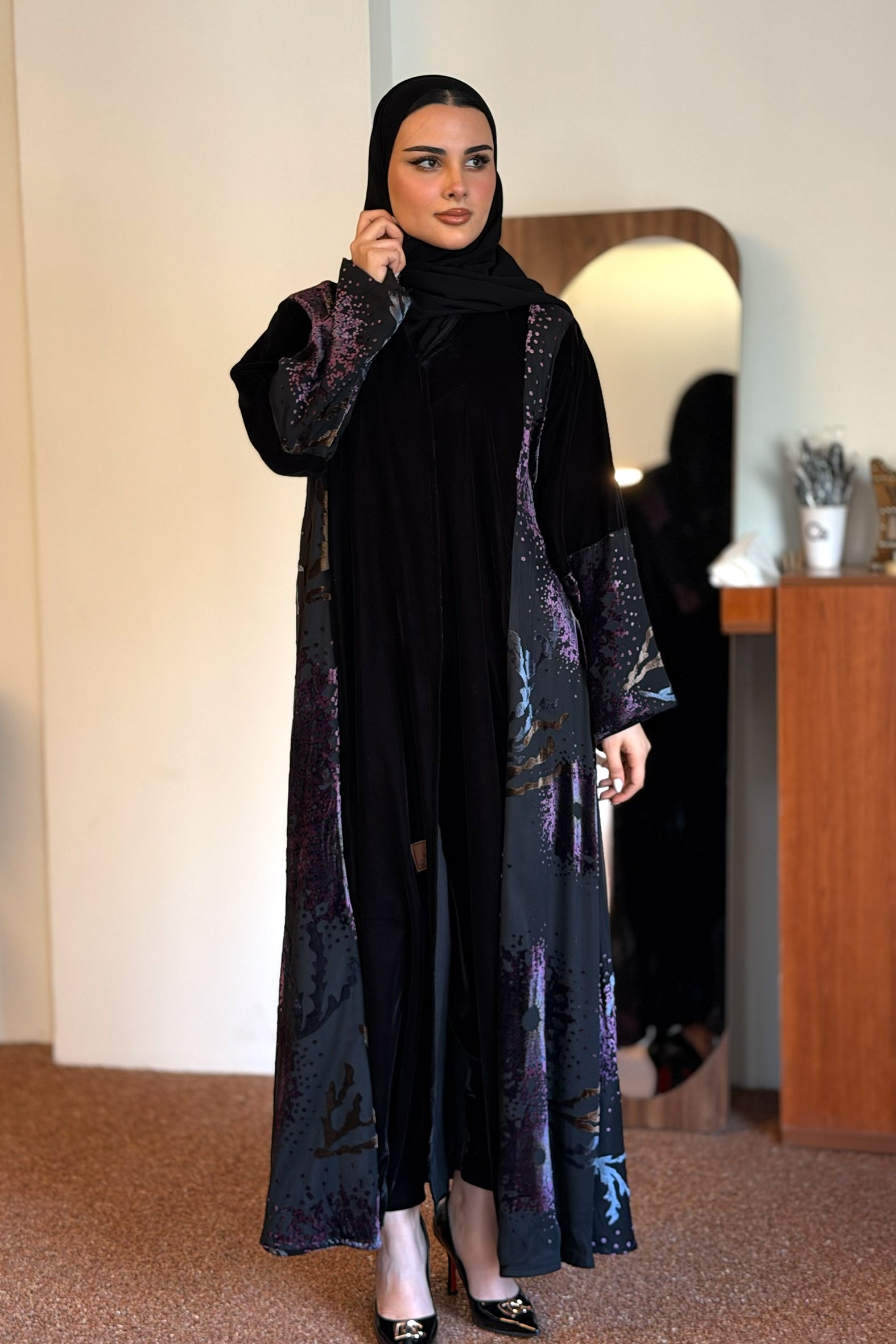 عباية شتوية منسوجة من قماش الشامواه الاسود مع تدخيلات قماش مطرز بورود ناعمة ومرصعة بشك كريستال فاخر على الأكمام وامام العباية. صممت لتناسب الاستخدام اليومي والطلعات تصميمها الناعم يضفي لمسة من الجاذبية والرقي مما يجعلها مثالية للإطلالات المميزة صممت بقصه انسيابية العباية ناعمة بالحركة لتلائم كل مناسباتك الشتوية. مع طرحة مجانية وجربي تنسيقها مع فستان عباية