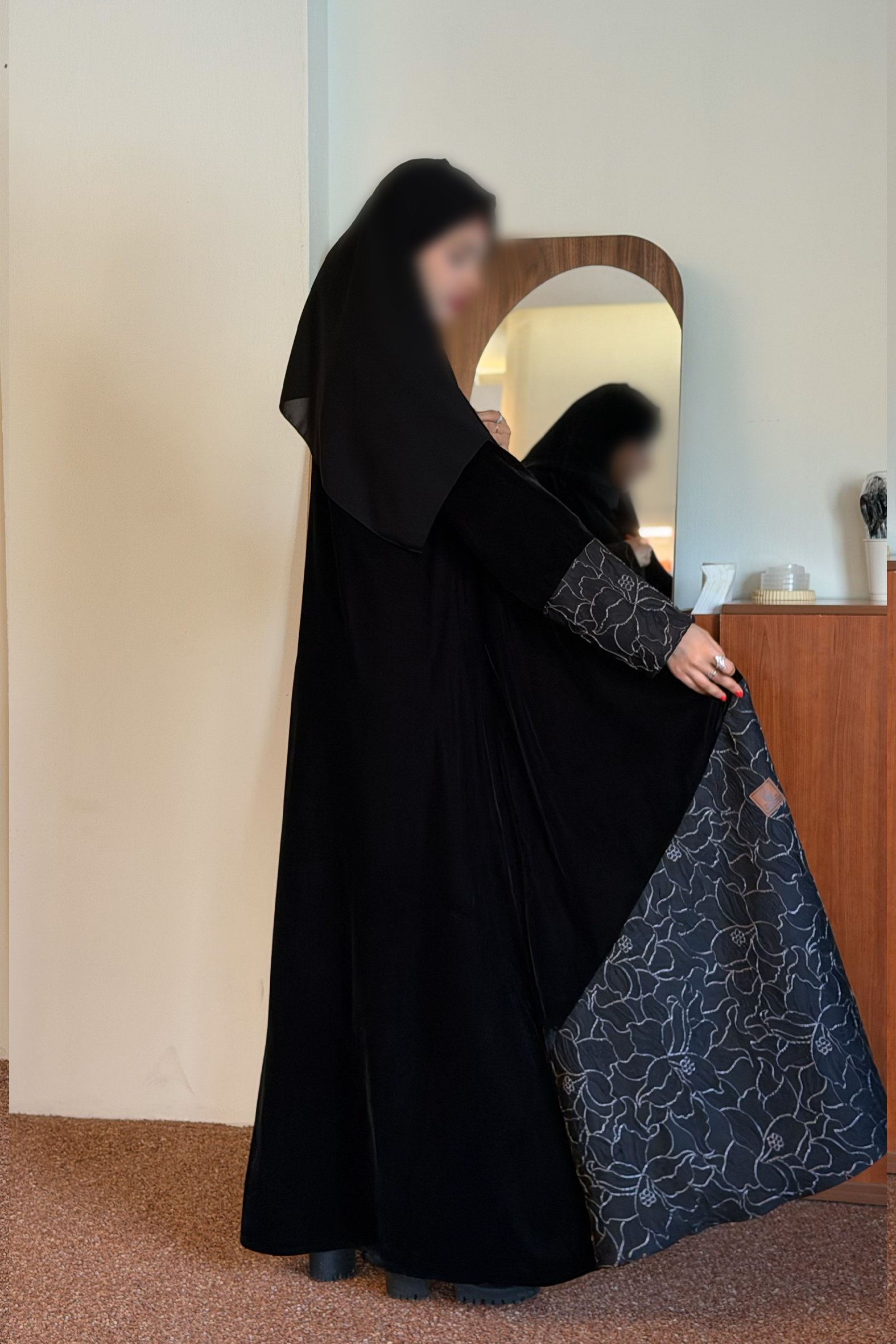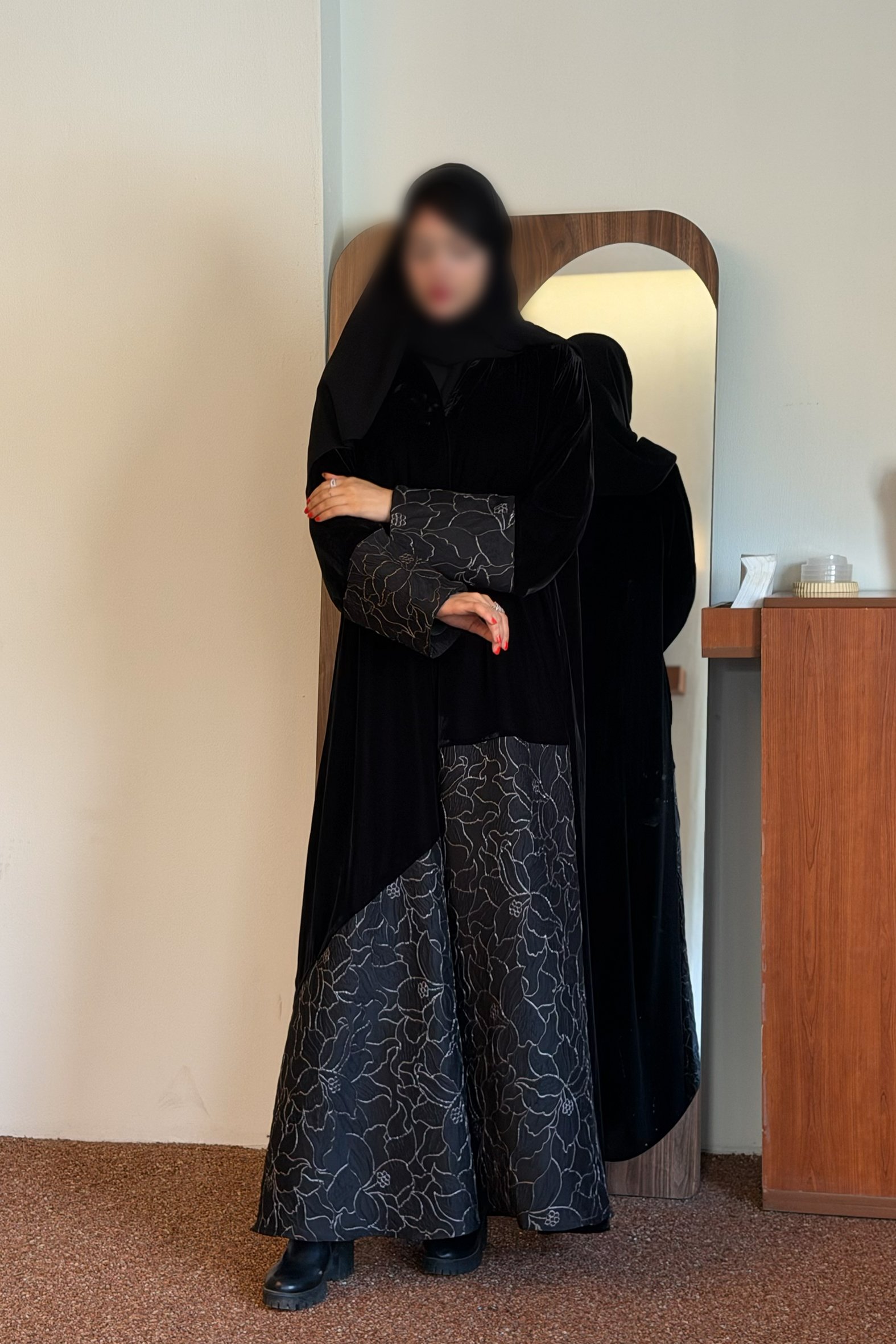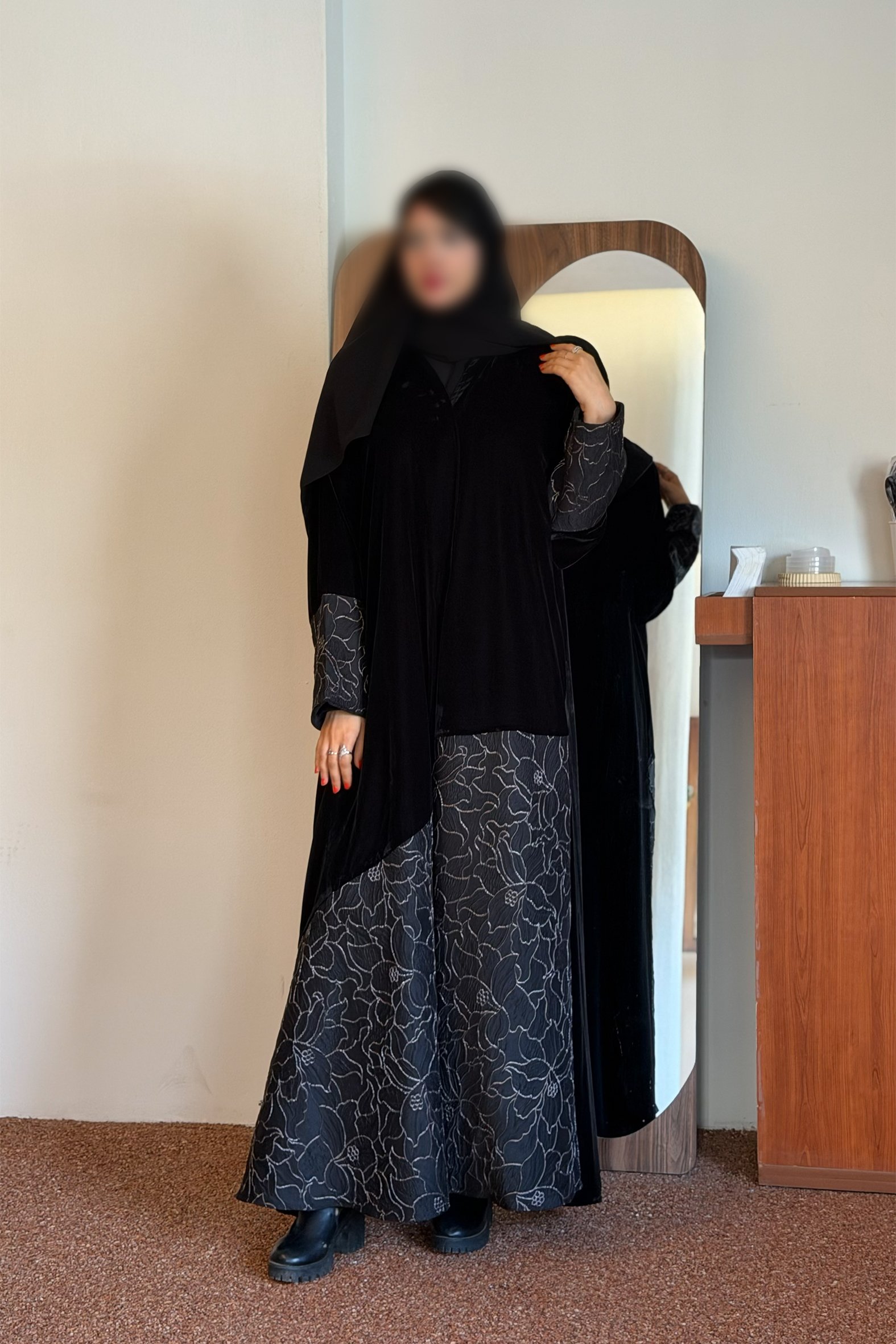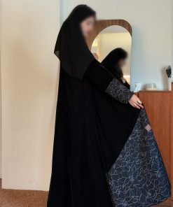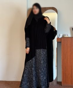 عباية شتوية منسوجة من قماش الشامواه الاسود مع تدخيلات قماش مطرز بورود ناعمة ومرصعة بشك كريستال فاخر على الأكمام وامام العباية. صممت لتناسب الاستخدام اليومي والطلعات تصميمها الناعم يضفي لمسة من الجاذبية والرقي مما يجعلها مثالية للإطلالات المميزة صممت بقصه انسيابية العباية ناعمة بالحركة لتلائم كل مناسباتك الشتوية. مع طرحة مجانية وجربي تنسيقها مع فستان عباية