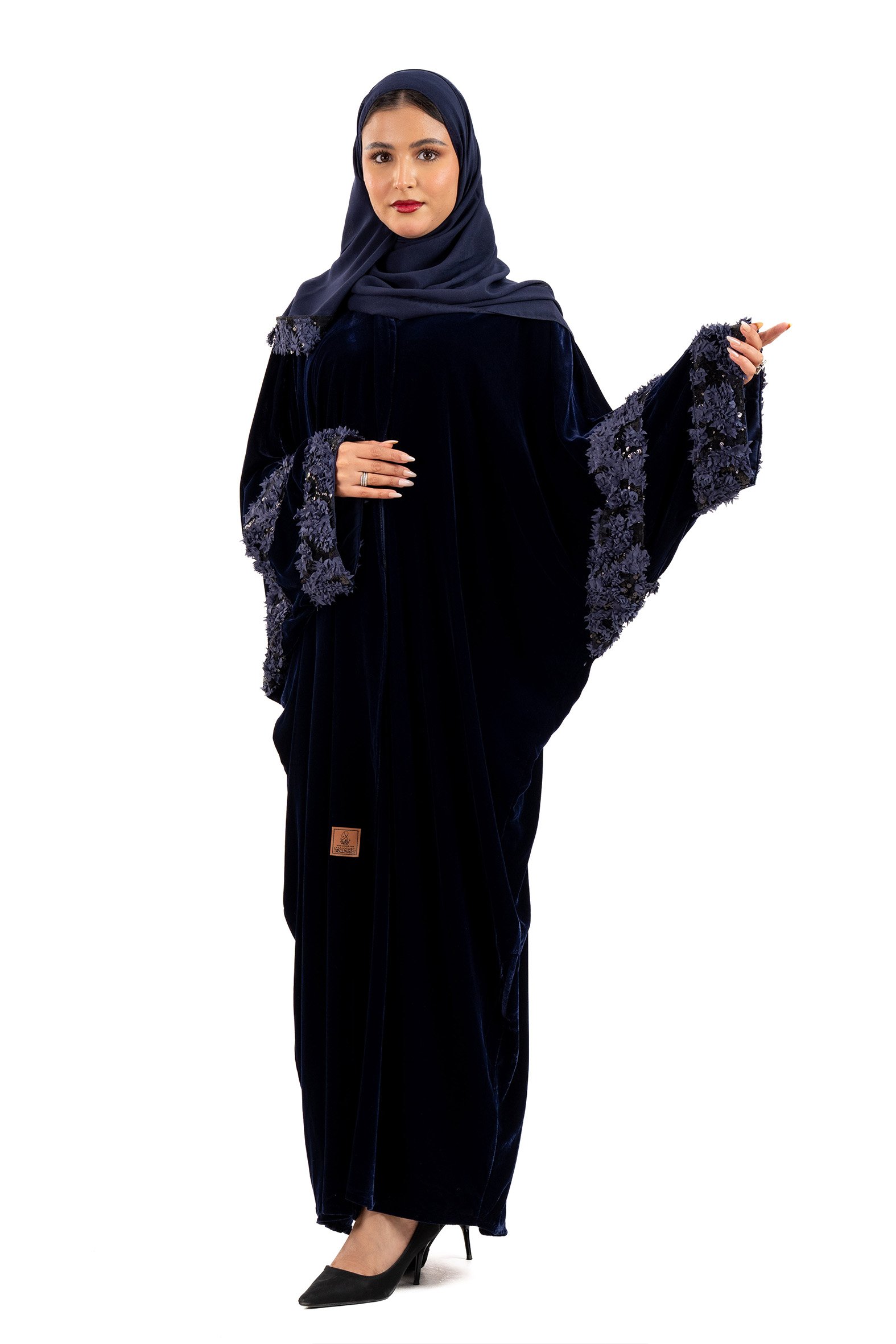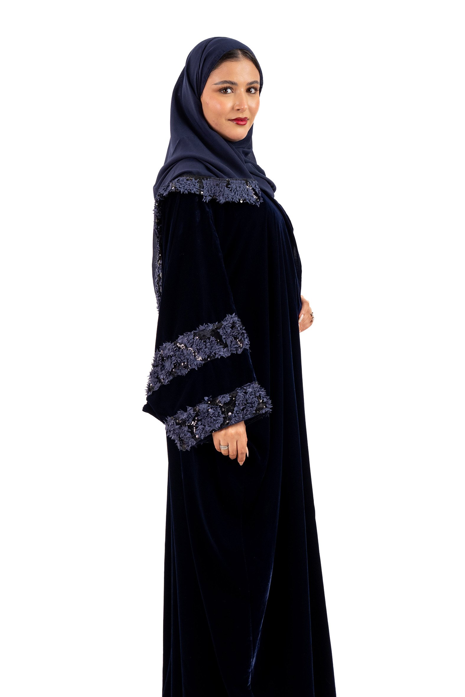 عباية مرام شتوية منسوجة من قماش المخمل الكحلي مع تدخيلات قماش مطرز بورود ناعمة ومرصعة بشك كريستال فاخر على الاكمام والاكتاف .صممت لتناسب الاستحدام اليومي والطلعات تصميمها الناعم يضفي لمسة من الجاذبية والرقي مما يجعلها مثالية للإطلالات المميزة صممت بقصه انسيابية العباية ناعمة بالحركة لتلائم كل مناسباتك الشتوية. مع طرحة مجانية وجربي تنسيقها مع فستان عباية