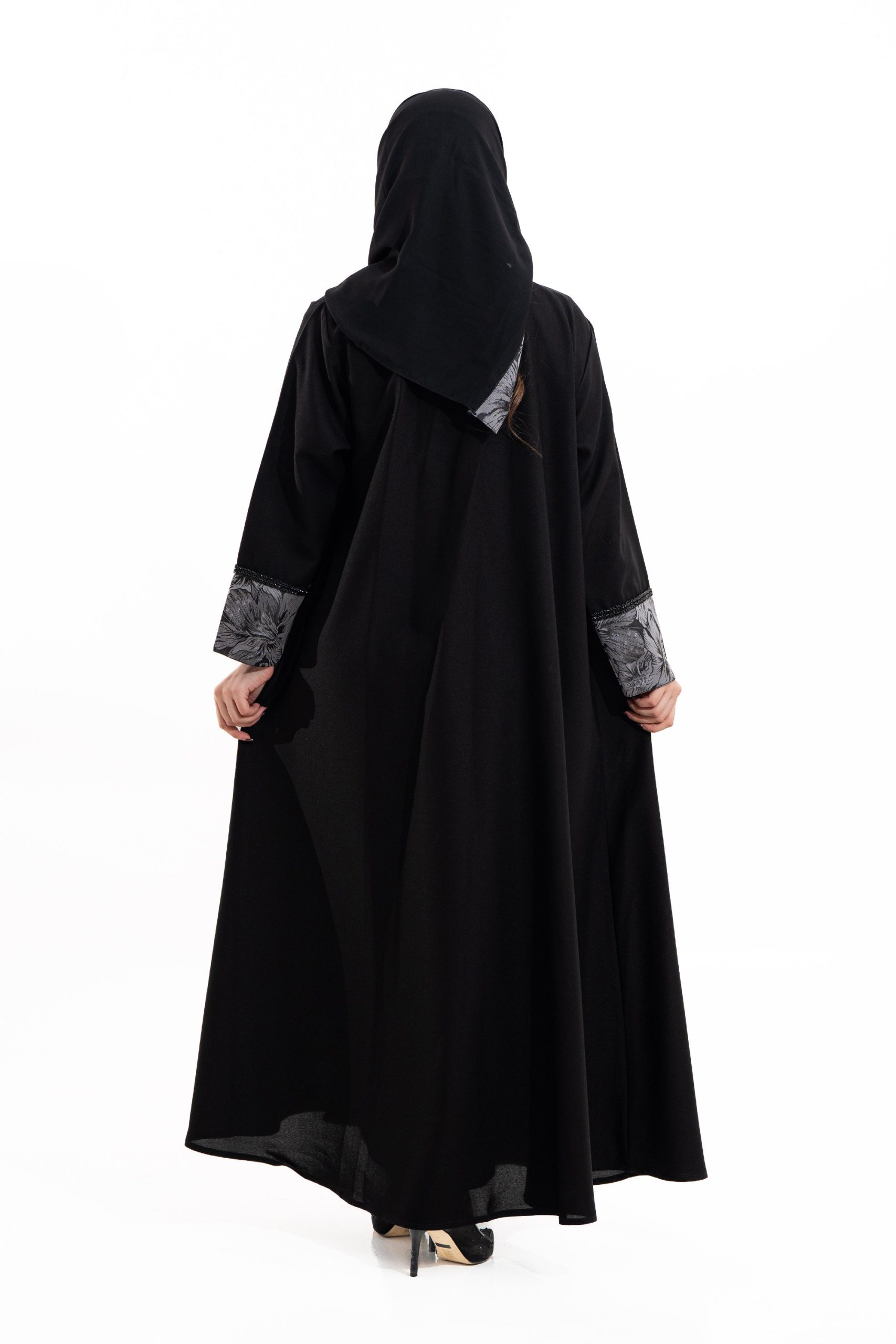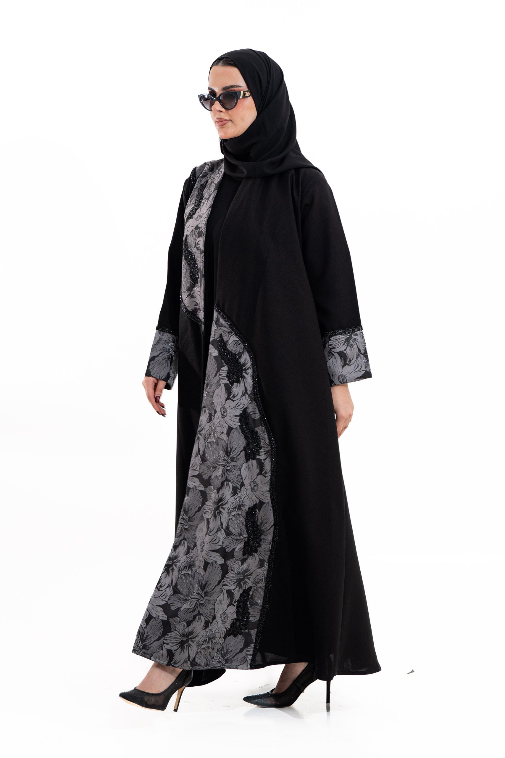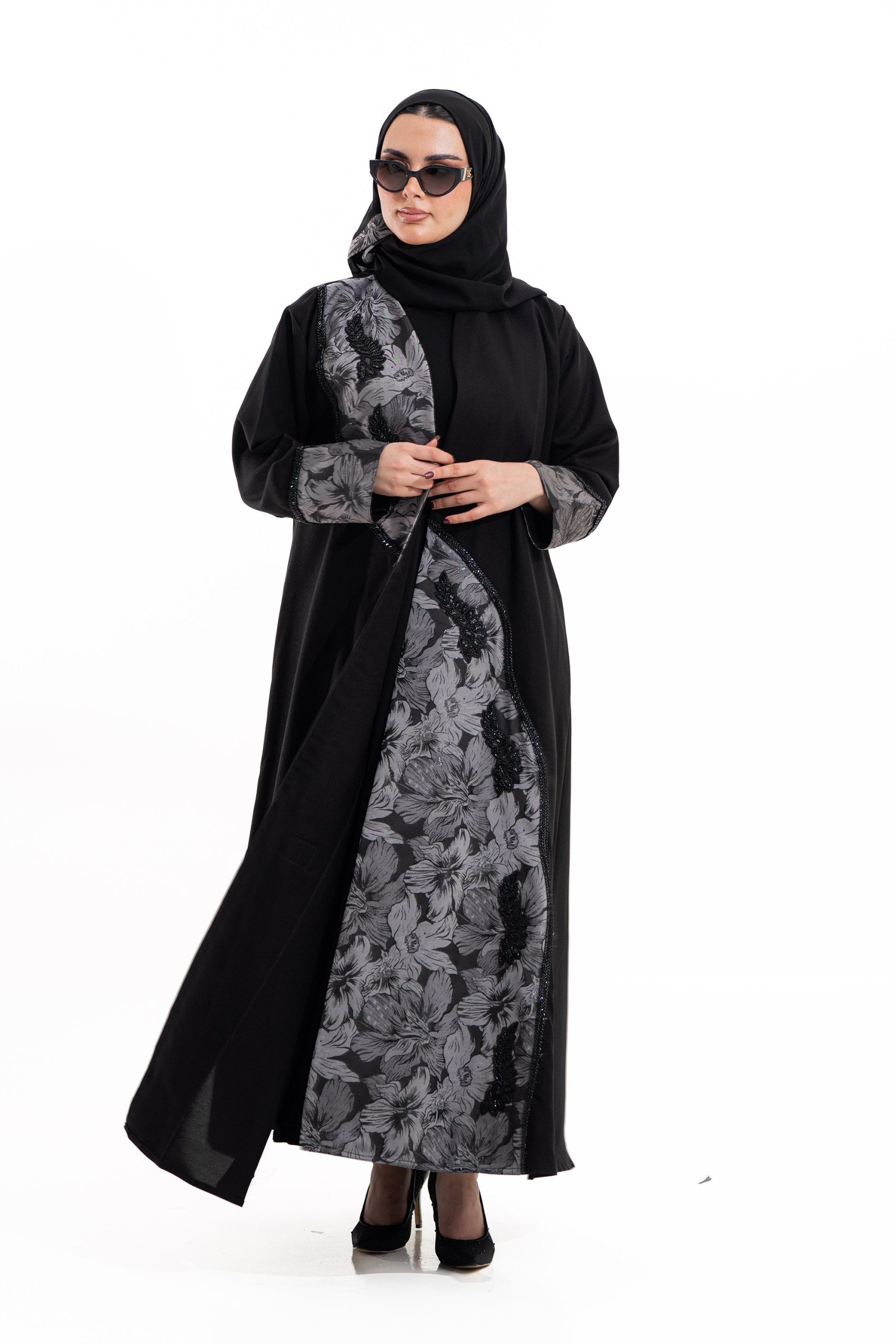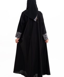 عباية أنيقة بتصميم عصري مصنوعة من قماش أسود فاخر ناعم الملمس، مزينة بتدخيلات قماش مطرز بنقوش هندسية راقية ومطعمة بتطريز لامع يضفي فخامة هادئة على الأكمام وواجهة العباية. تصميمها الانسيابي يمنحك راحة في الحركة وأناقة متوازنة، لتكون خيارًا مثاليًا للاستخدام اليومي والطلعات الرسمية بأسلوب راقٍ وعصري. تأتي مع تنسيق أنيق يسهل اعتماده لمختلف الإطلالات.