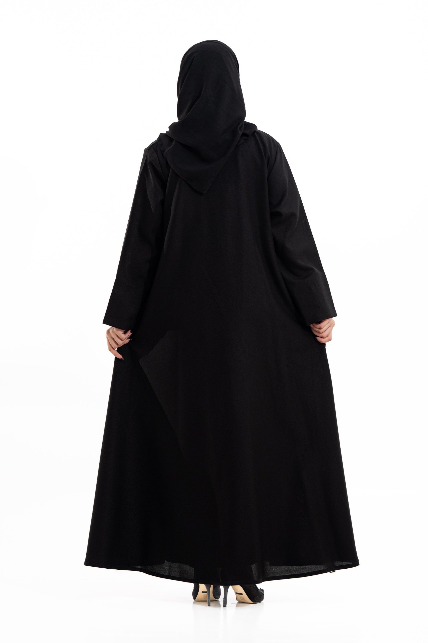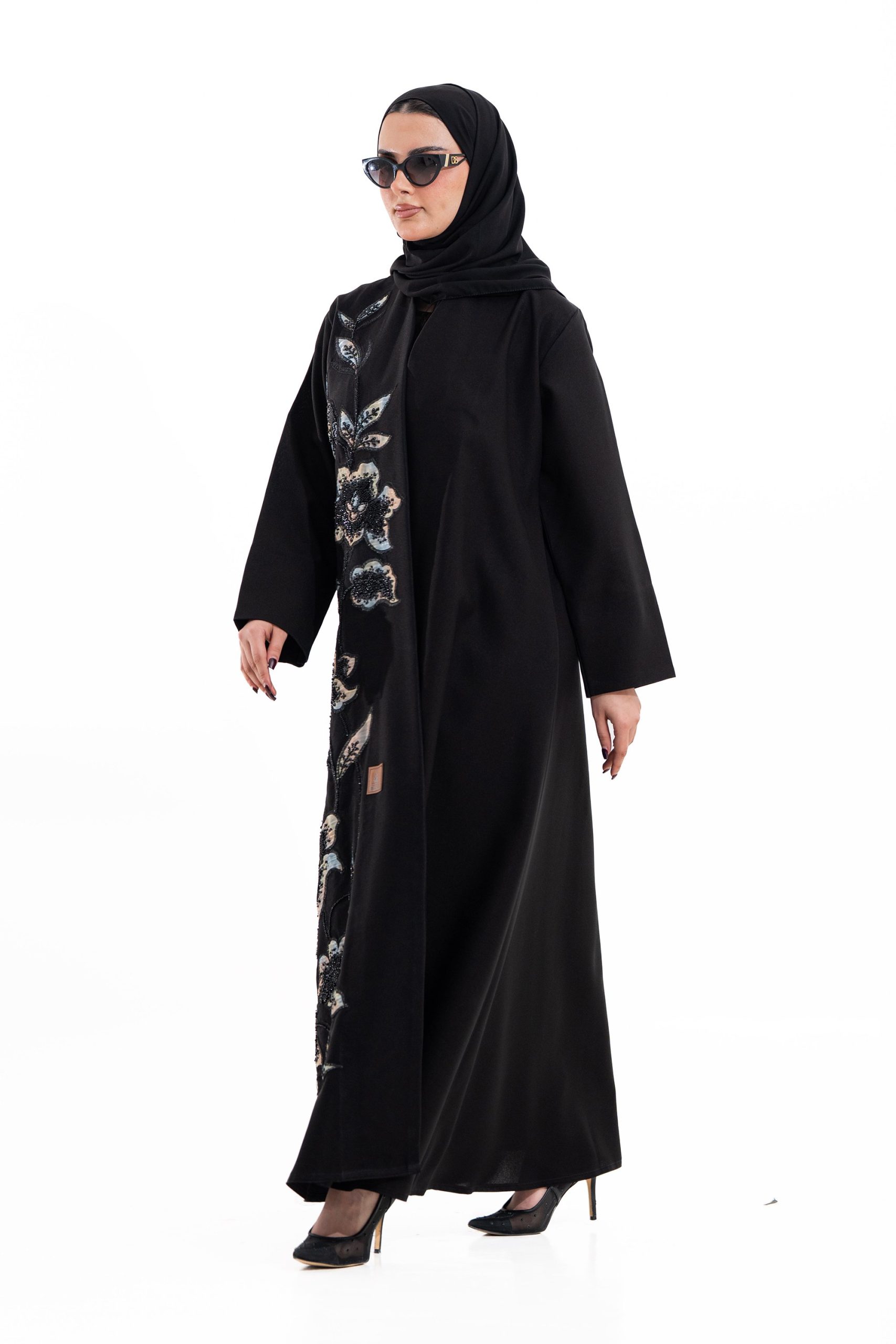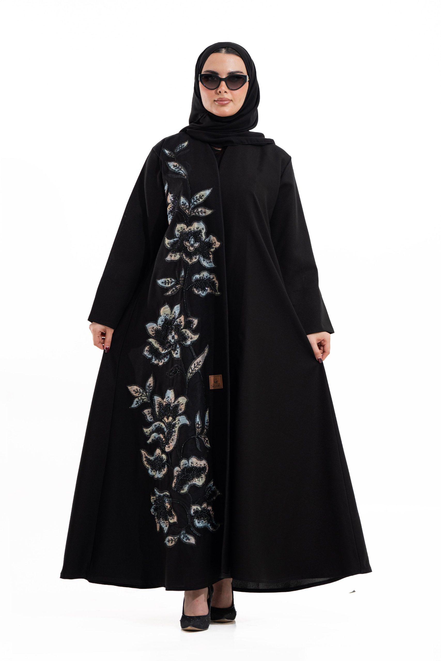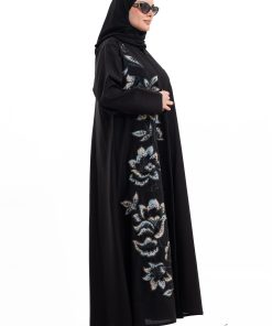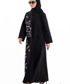 عباية أنيقة بتصميم عصري مصنوعة من قماش أسود فاخر ناعم الملمس، مزينة بتدخيلات قماش مطرز بنقوش هندسية راقية ومطعمة بتطريز لامع يضفي فخامة هادئة على الأكمام وواجهة العباية. تصميمها الانسيابي يمنحك راحة في الحركة وأناقة متوازنة، لتكون خيارًا مثاليًا للاستخدام اليومي والطلعات الرسمية بأسلوب راقٍ وعصري. تأتي مع تنسيق أنيق يسهل اعتماده لمختلف الإطلالات.