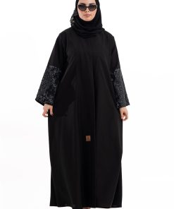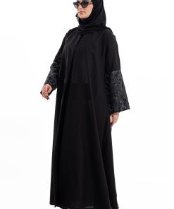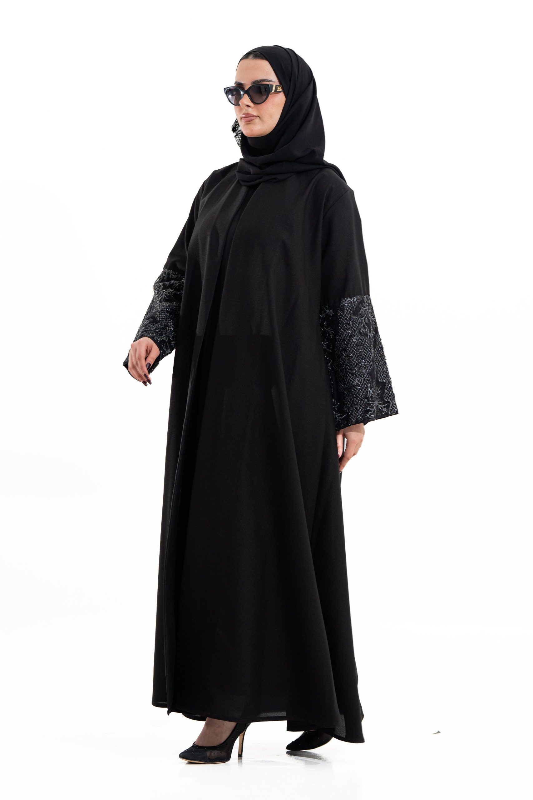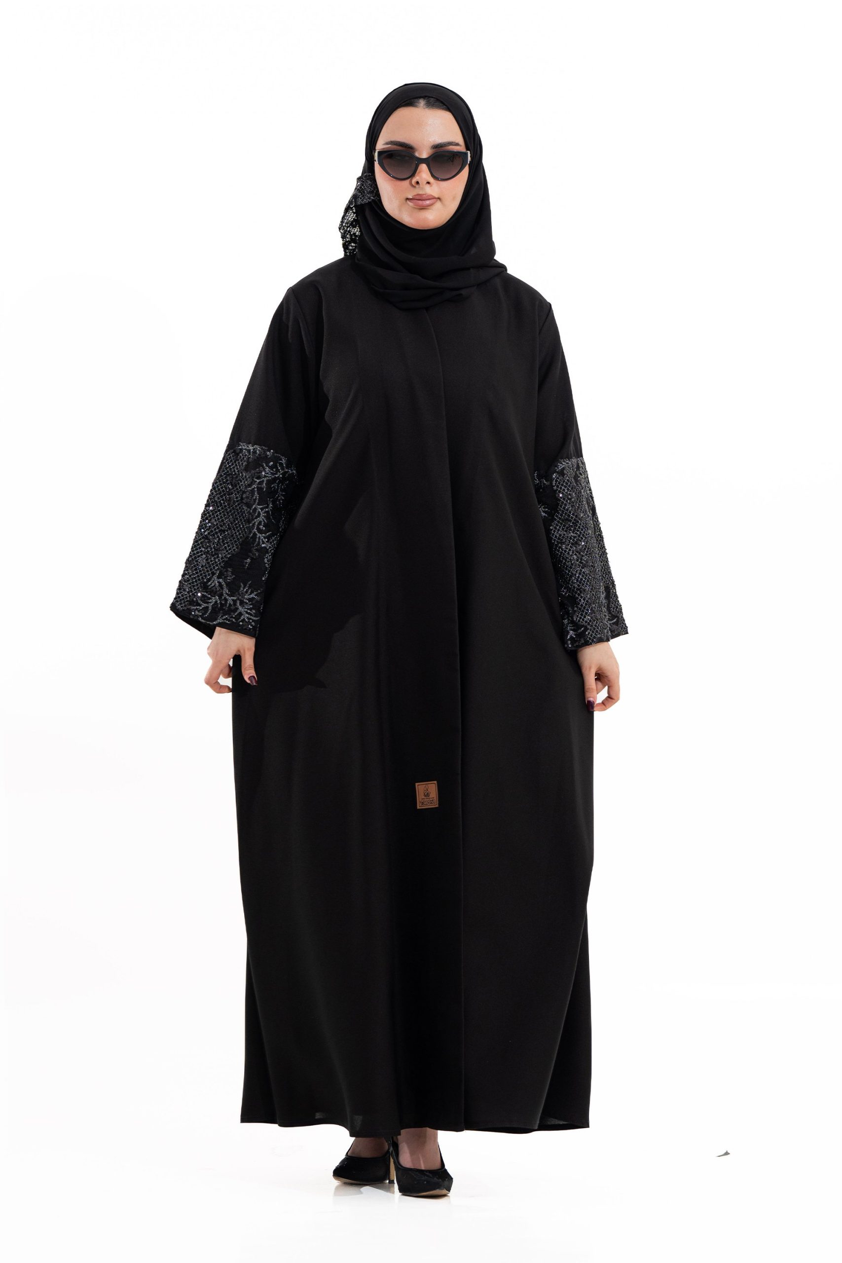 عباية أنيقة بتصميم عصري مصنوعة من قماش أسود فاخر ناعم الملمس، مزينة بتدخيلات قماش مطرز بنقوش هندسية راقية ومطعمة بتطريز لامع يضفي فخامة هادئة على الأكمام وواجهة العباية. تصميمها الانسيابي يمنحك راحة في الحركة وأناقة متوازنة، لتكون خيارًا مثاليًا للاستخدام اليومي والطلعات الرسمية بأسلوب راقٍ وعصري. تأتي مع تنسيق أنيق يسهل اعتماده لمختلف الإطلالات.