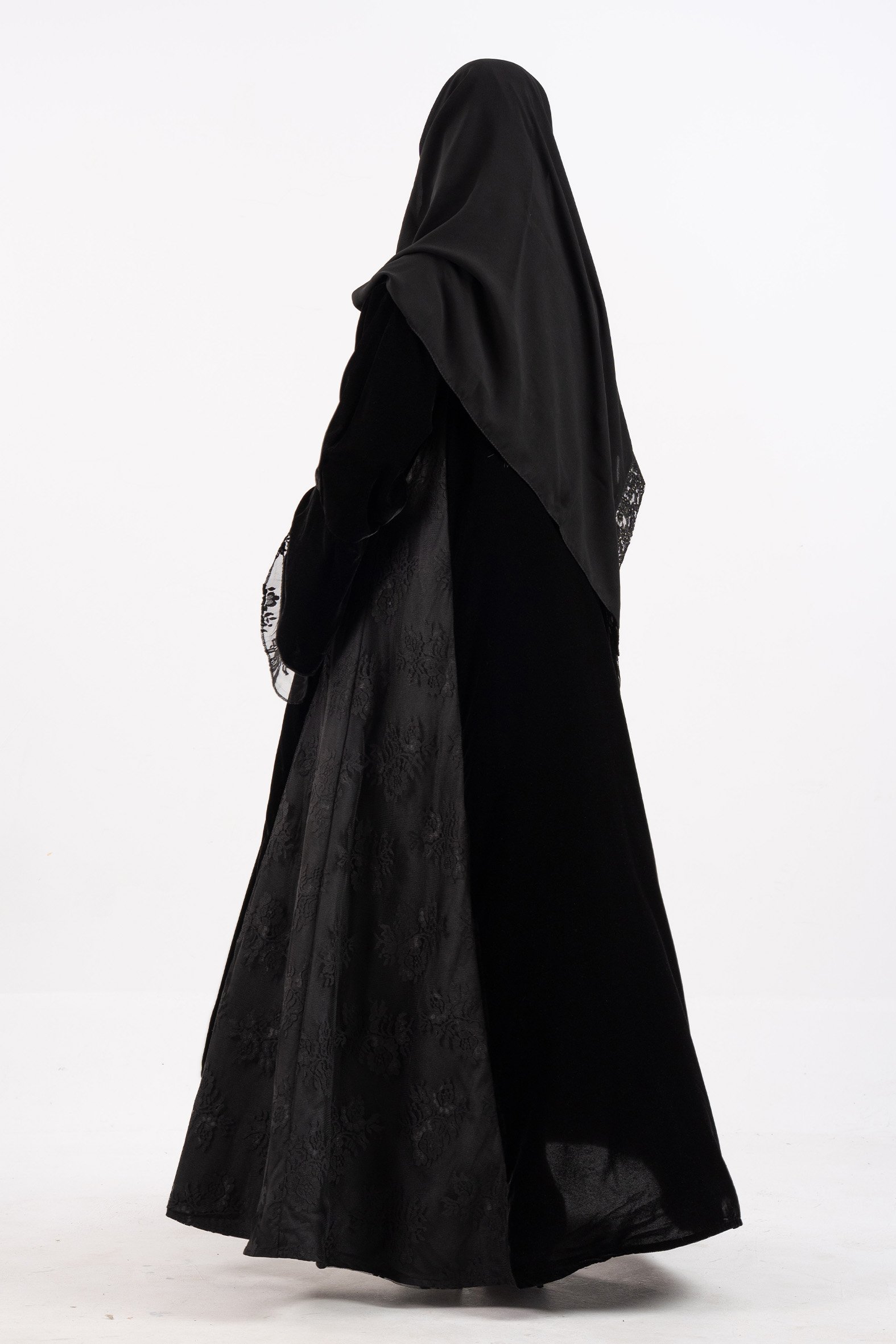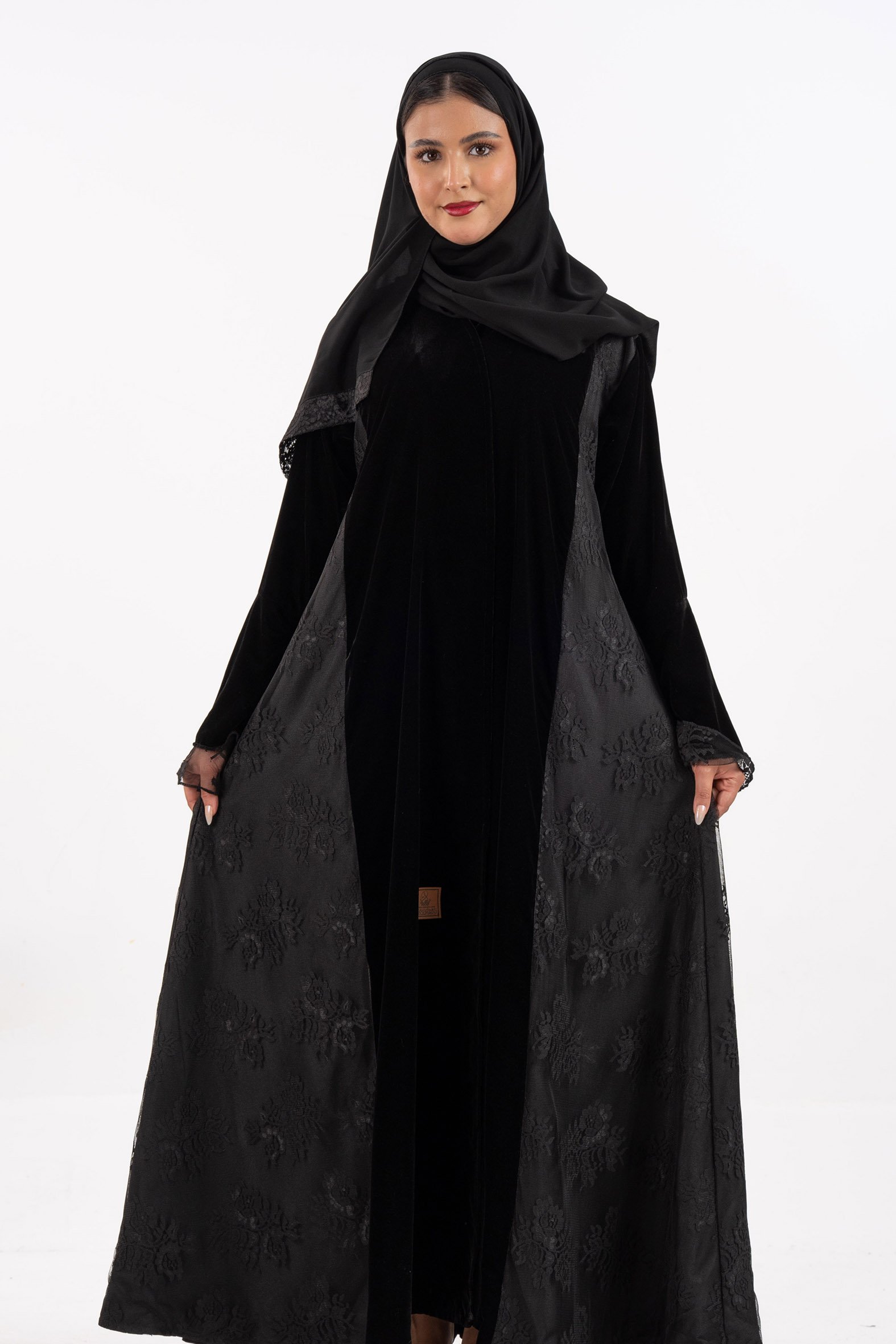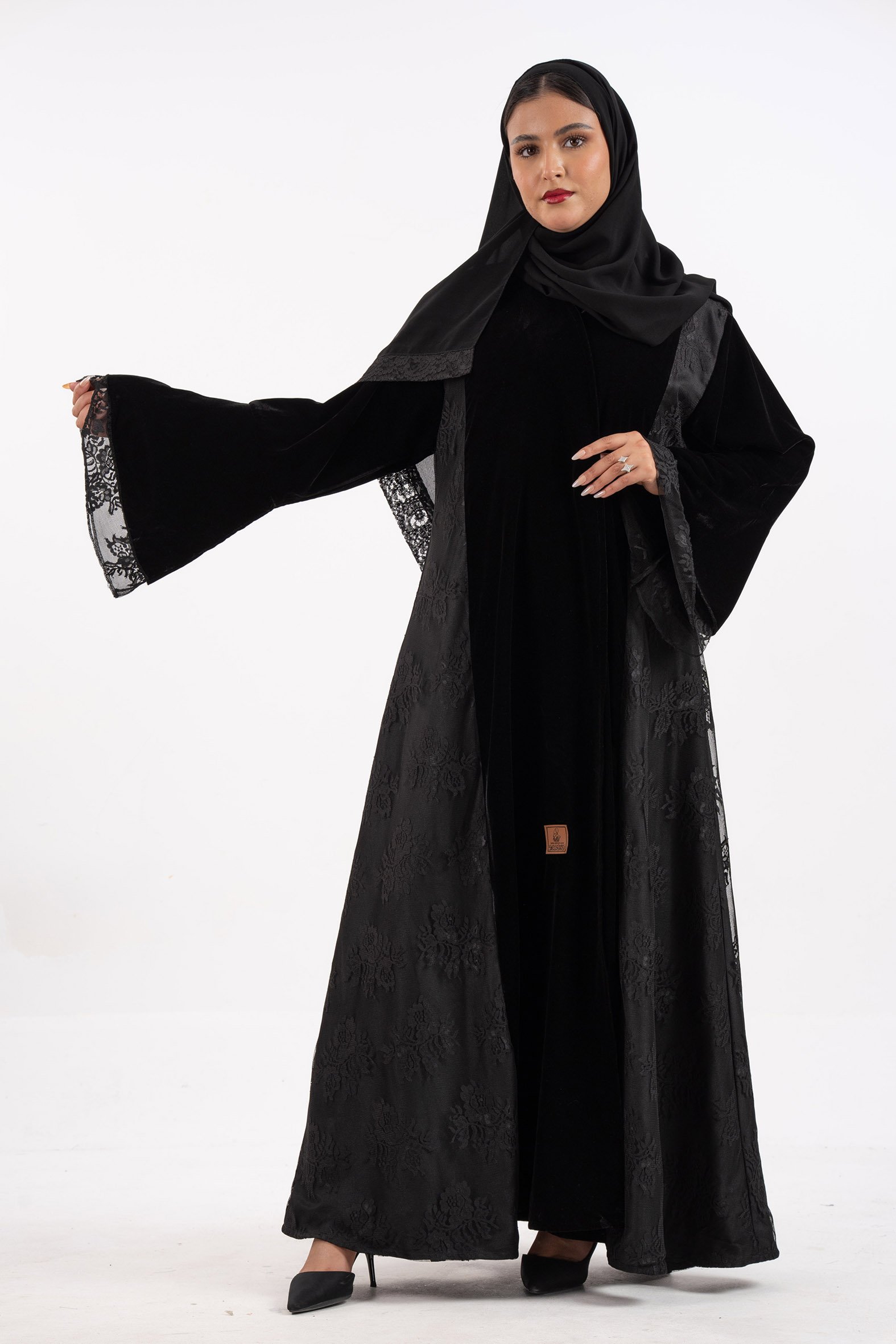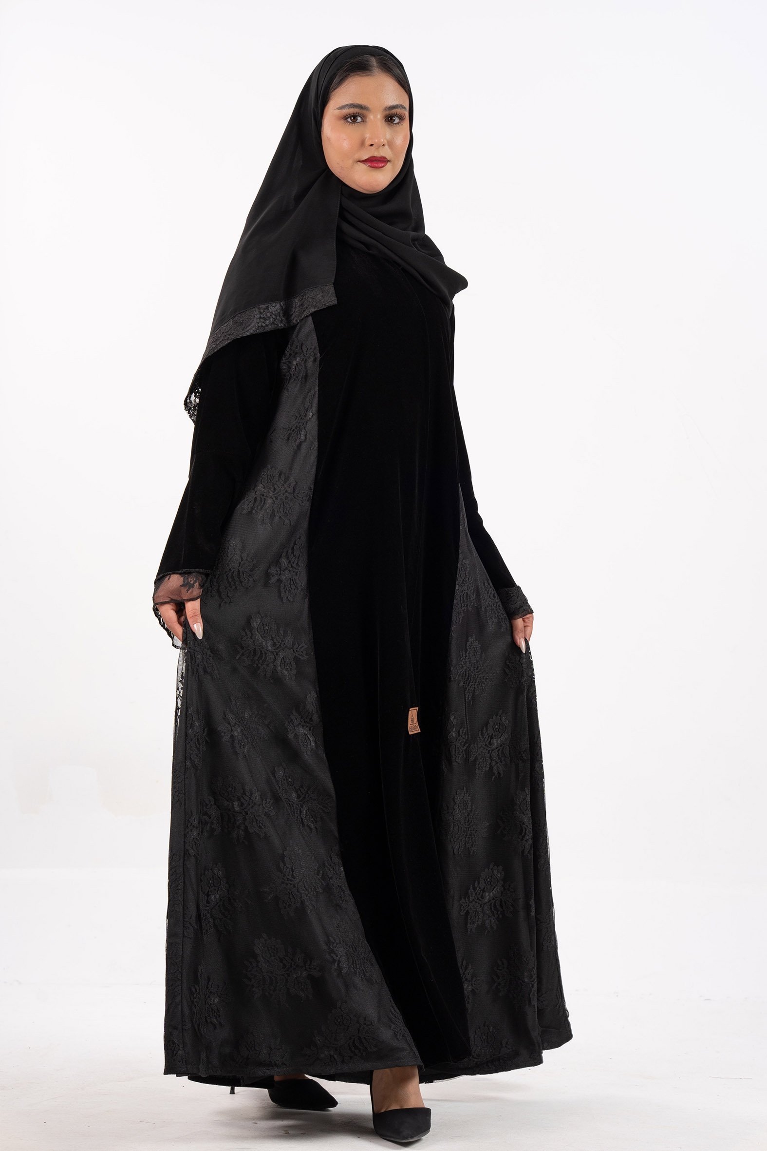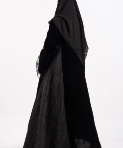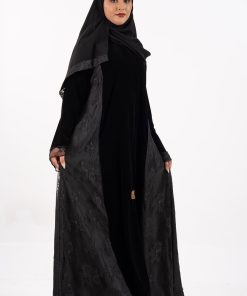 عباية نرجس شتوية منسوجة من قماش المخمل الأسود مع تدخيلات قماش دانتل اندنوسي على الجوانب والأكمام صممت لتناسب الاستخدام اليومي والطلعات تصميمها الناعم يضفي لمسة من الجاذبية والرقي مما يجعلها مثالية للإطلالات المميزة صممت بقصه انسيابية العباية ناعمة بالحركة لتلائم كل مناسباتك الشتوية. مع طرحة مجانية وجربي تنسيقها مع فستان عباية