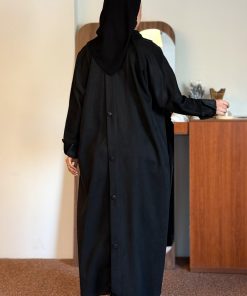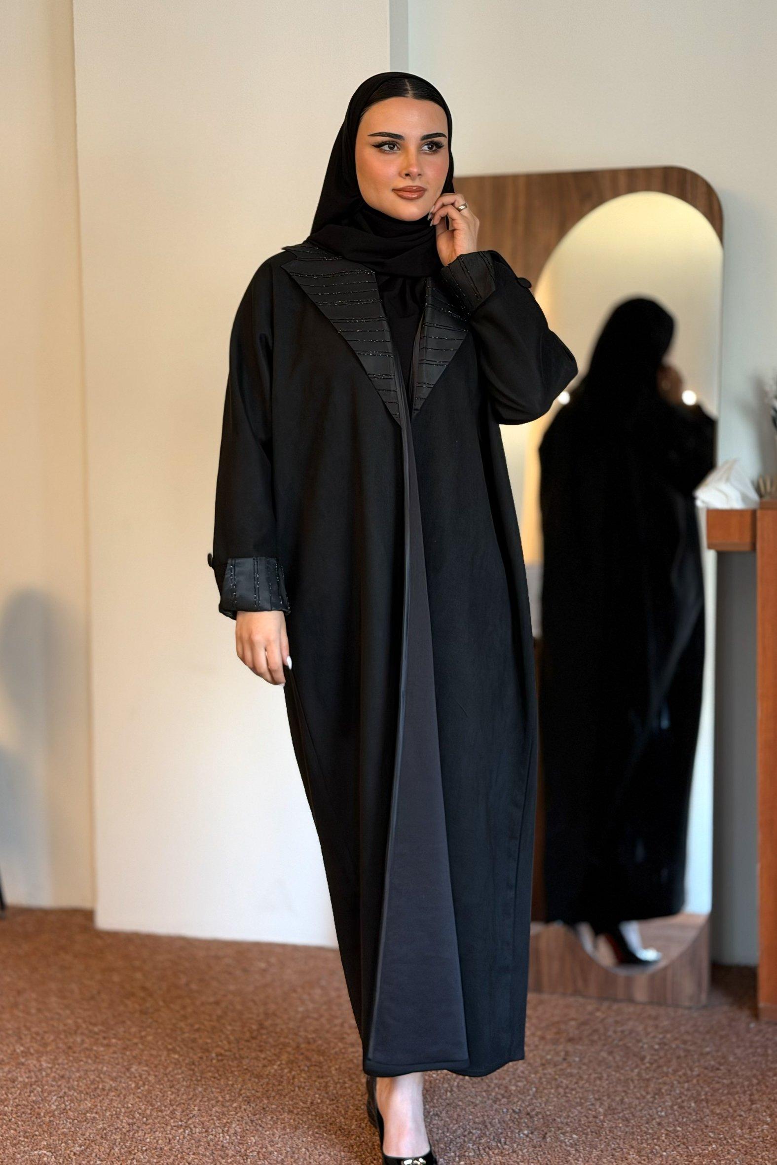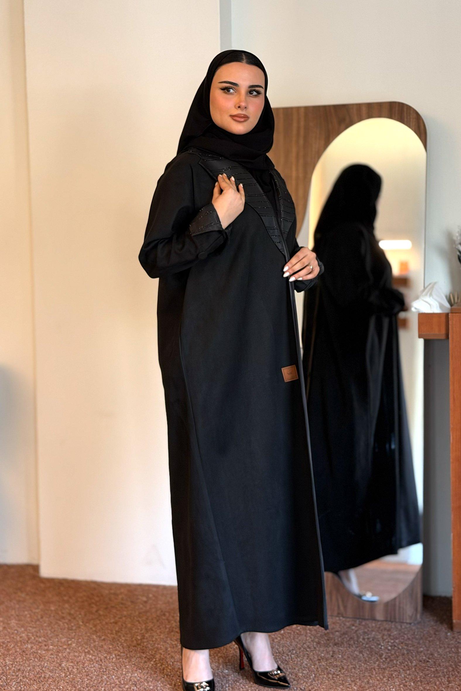 عباية شتوية منسوجة من قماش الشامواه الاسود مع تدخيلات قماش جاكر فاخر على الأكمام وامام العباية. صممت لتناسب الاستخدام اليومي والطلعات تصميمها الناعم يضفي لمسة من الجاذبية والرقي مما يجعلها مثالية للإطلالات المميزة صممت بقصه انسيابية العباية ناعمة بالحركة لتلائم كل مناسباتك الشتوية. مع طرحة مجانية وجربي تنسيقها مع فستان عباية