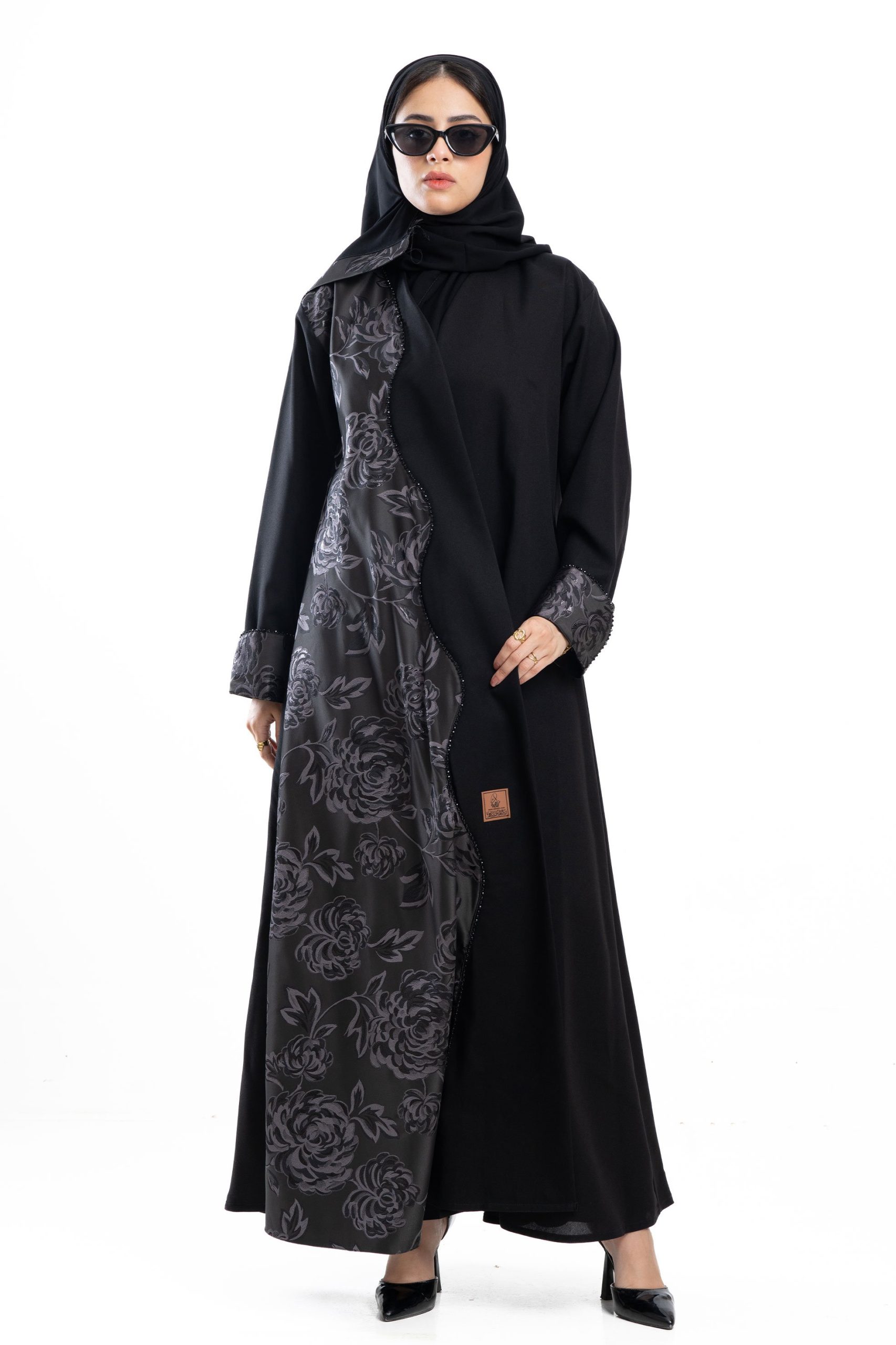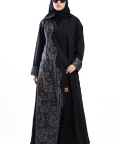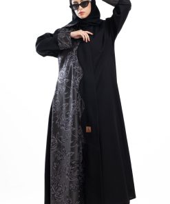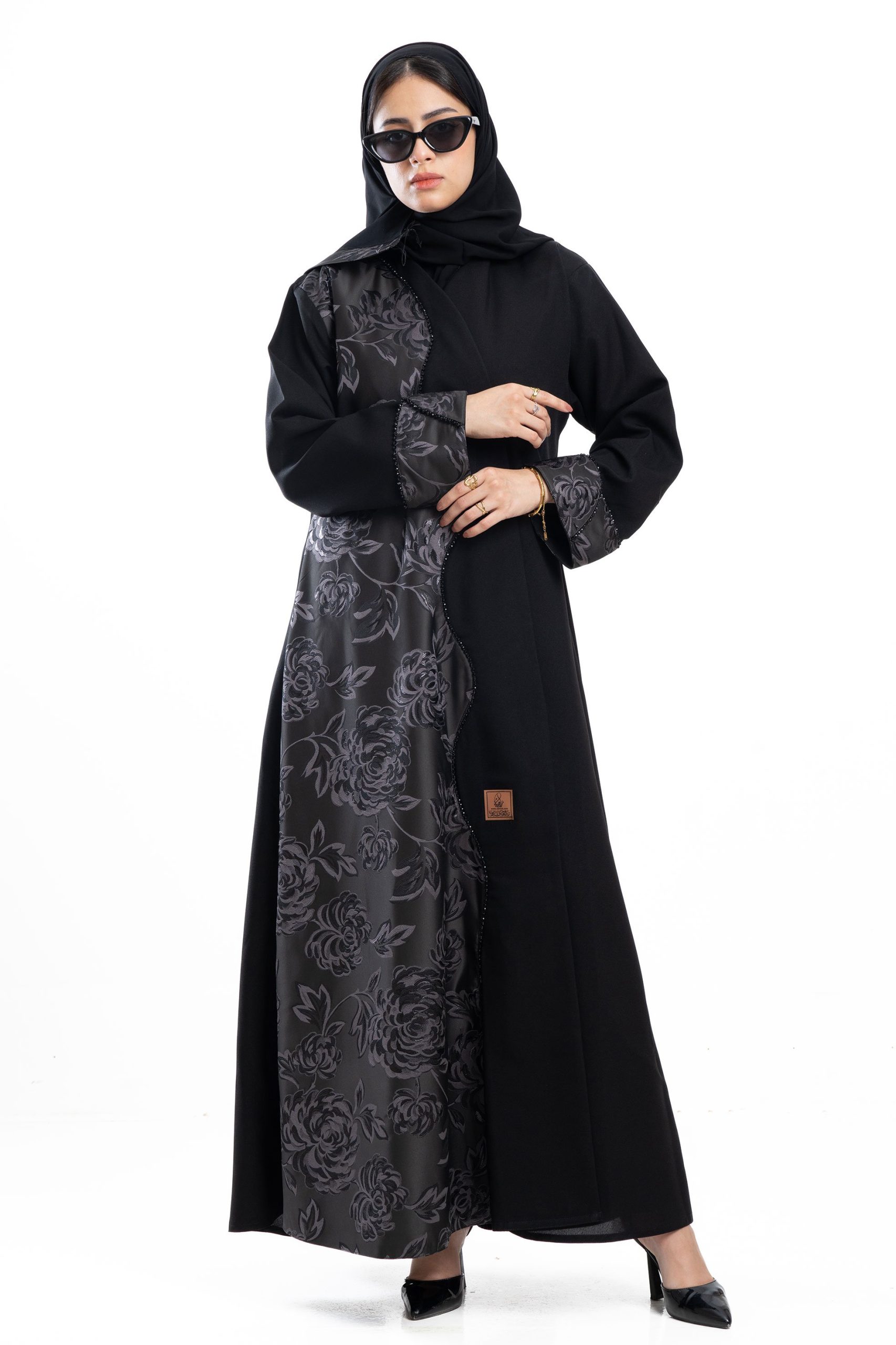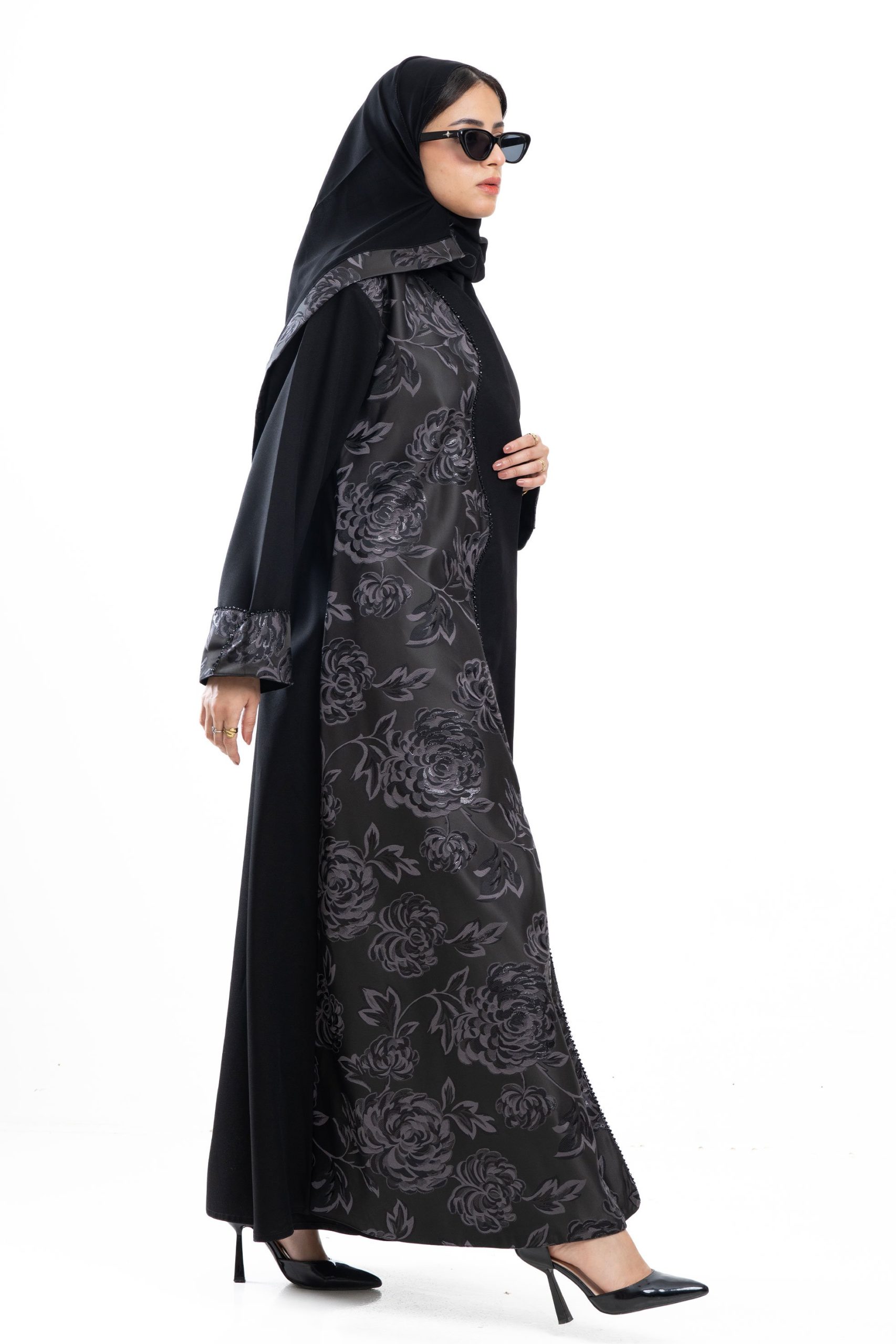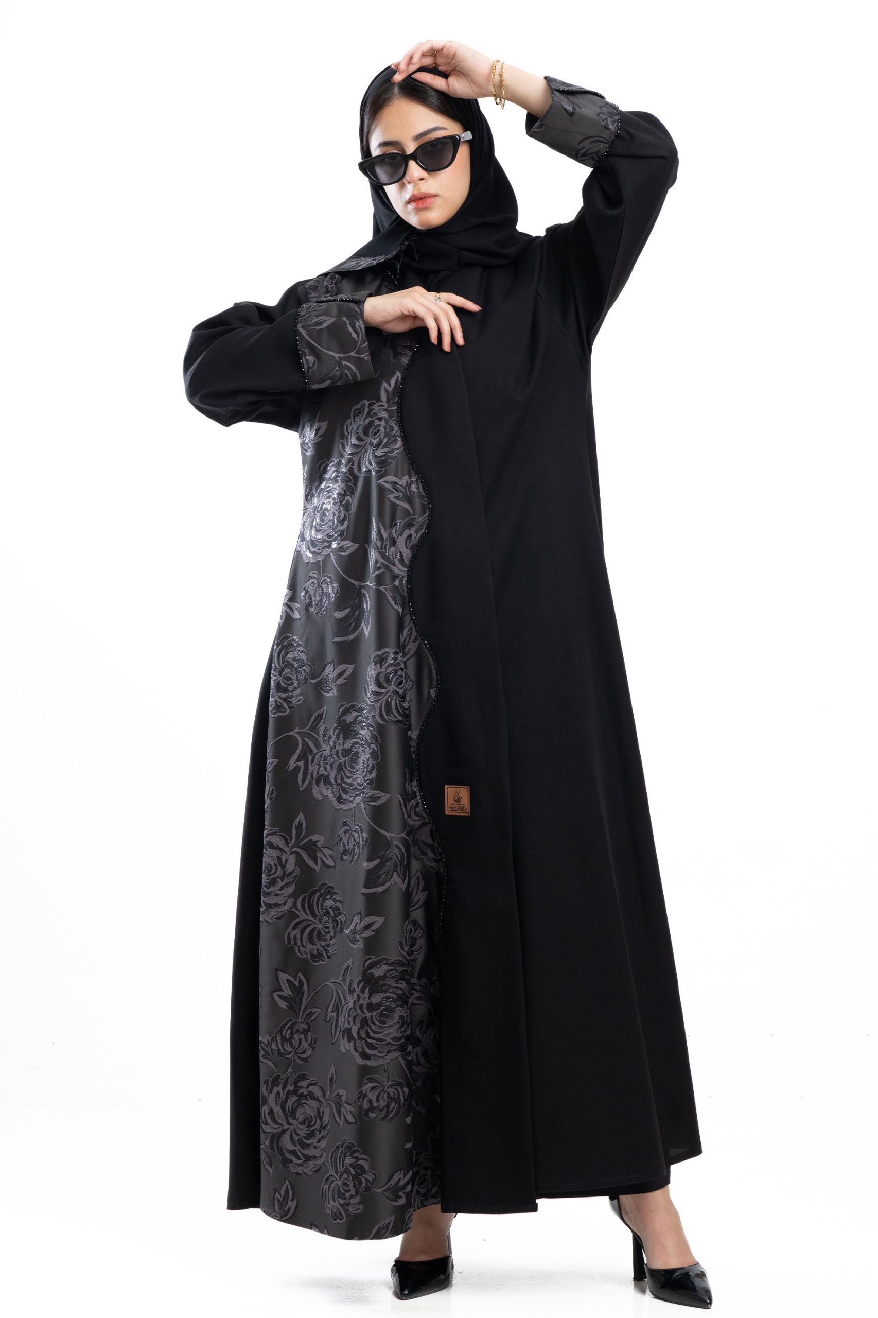 زاهية – عباية وله بتدخيلات قماش جاكار رمادي
