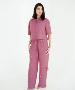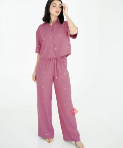طقم بنطلون و بلوزة برسومات براندي مزين بالريش