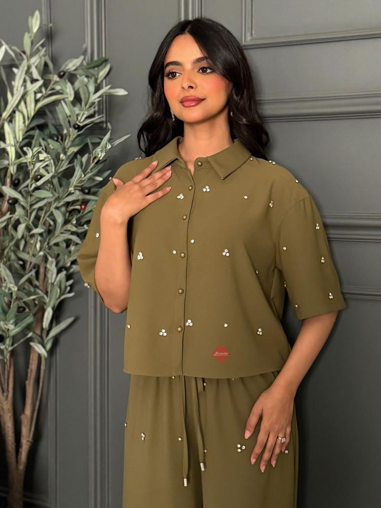 طقم بني كريب فاخر ناعم اكمام قصير دريبيه
