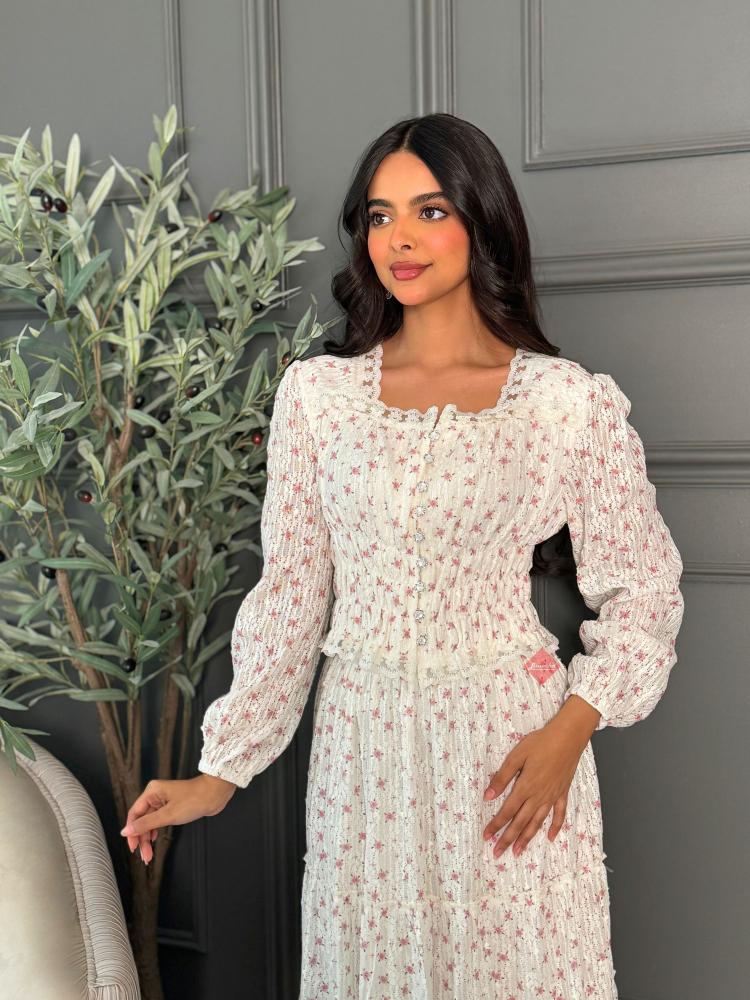 طقم تنورة وبلوزة راقي بدانتيل وبليسيه أنيق