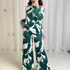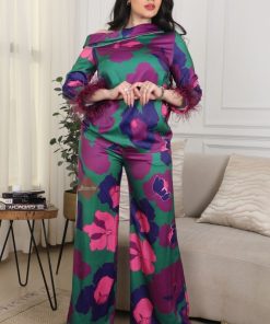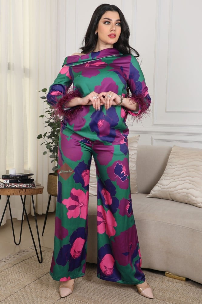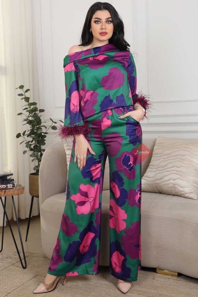 طقم بنطلون و بلوزة برسومات براندي مزين بالريش