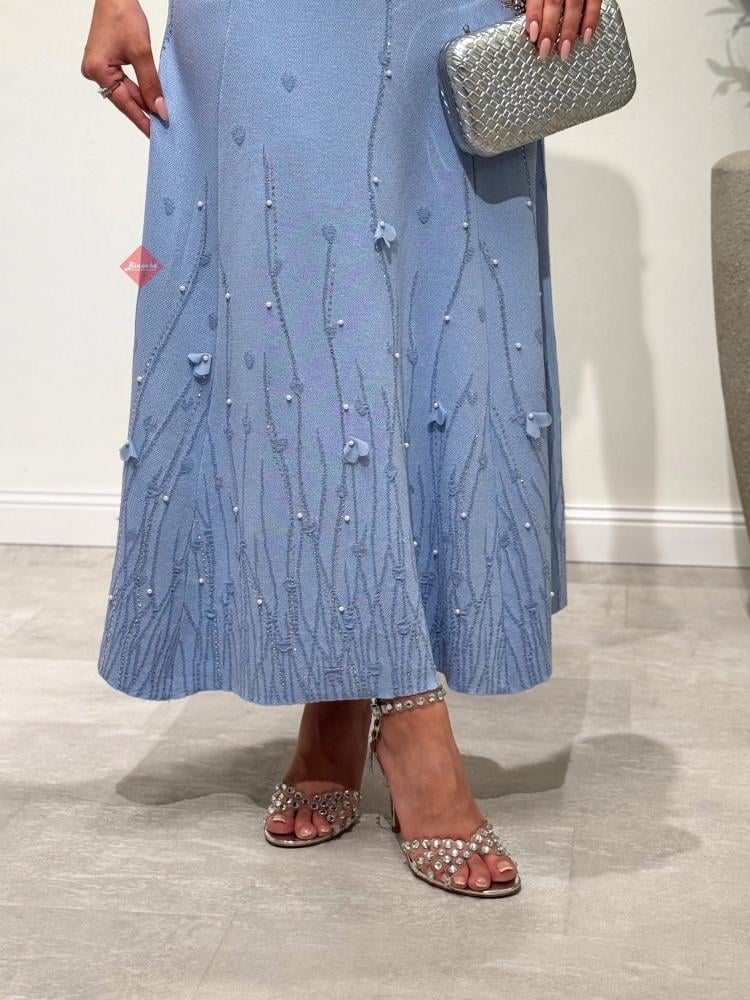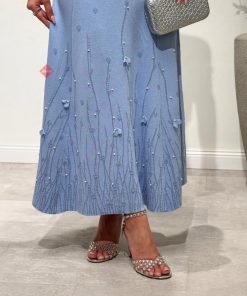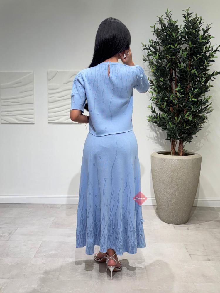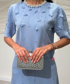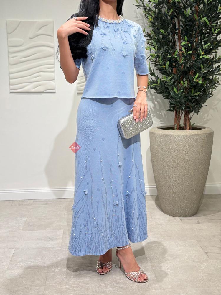 طقم بلوزة و تنورة بخامة الستان الناعمة و مزين بالإكسسوارت الراقية