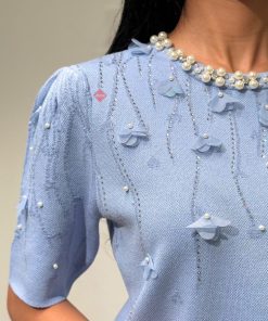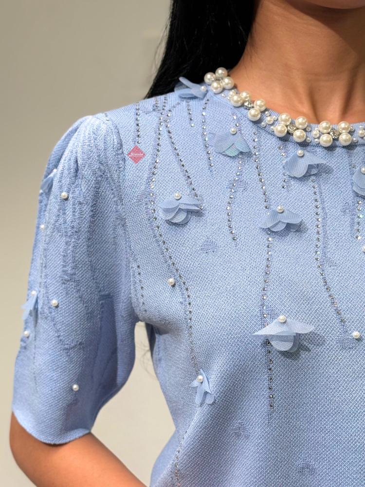 طقم بلوزة و بنطلون بخامة الستان الناعمة و مزين بالكريستال الراقي