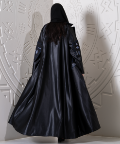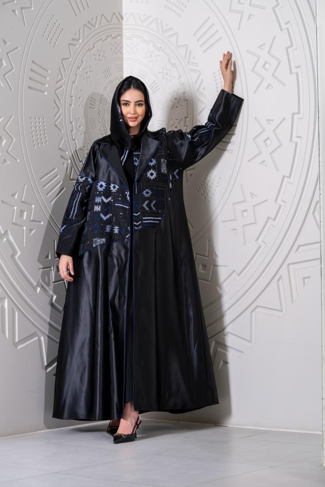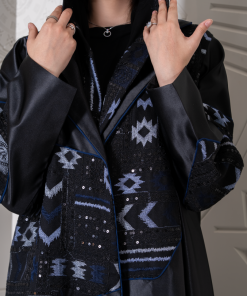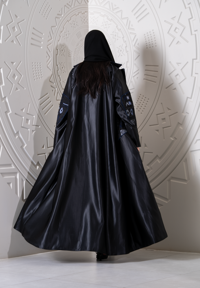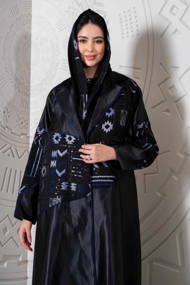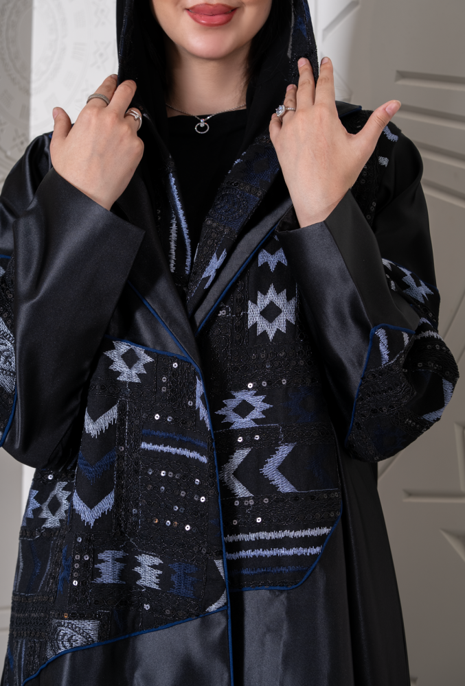 عبايات بيست – عباية فاخرة بتصميم عصري يجمع بين فخامة اللون الأسود ولمسات التطريز الهندسي باللون الأزرق، تضفي عليها سحرًا خاصًا وأناقة ملفتة.