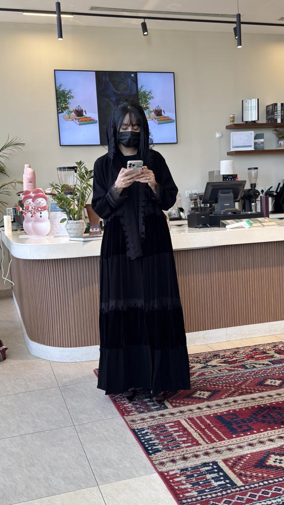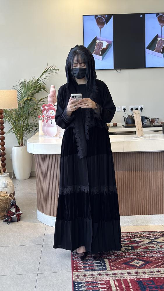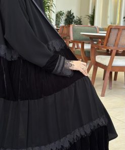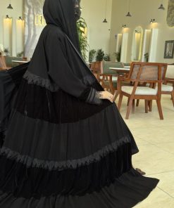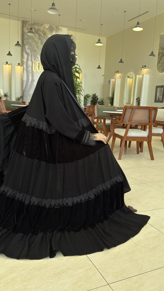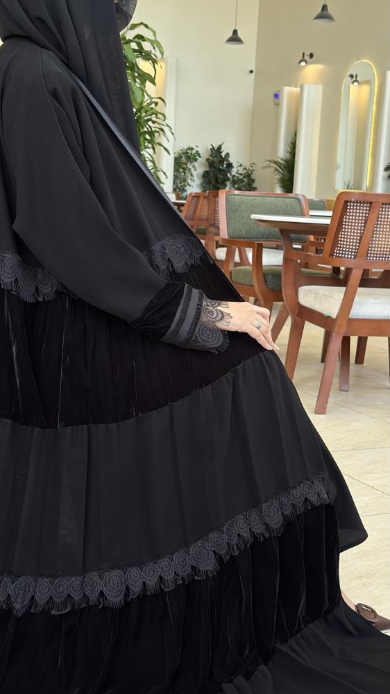 عبايات بيست – تأتي العباية بقماش مخمل فاخر يتدرج بأسلوب طبقات أنيق يضفي لمعة راقية وفخامة تلفت الأنظار، مع لمسات دانتيل ناعمة على الأكمام وحواف الطبقات لتكتمل تفاصيل الرفاهية.